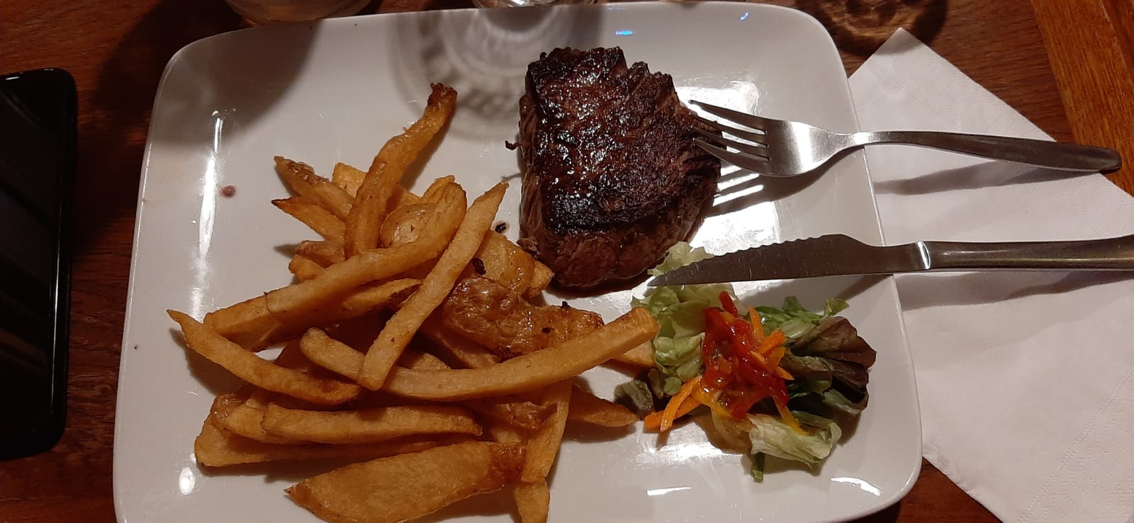 Nous étions de passage sur la commune vendredi dernier et nous avons trouver l’établissement par rapport aux avis et notations. Service impeccable les serveurs et serveuses sont super cools et efficaces car nous étions pressés par le temps . Quand à la cuisine une délice nous nous sommes régalés !!! Un ÉNORME filet de bœuf avec sauce au bleu et des frites maison ainsi que la mayonnaise maison Mon mari a pris la formule entrée plat dessert avec une terrine aux 3 viandes et aux épices en entrée Un tartare de bœuf en plat et une superbe tarte tatin à la banane !!! C’est un établissement à visiter sans hésitation !!! Nous reviendrons dès que nous serons dans la région