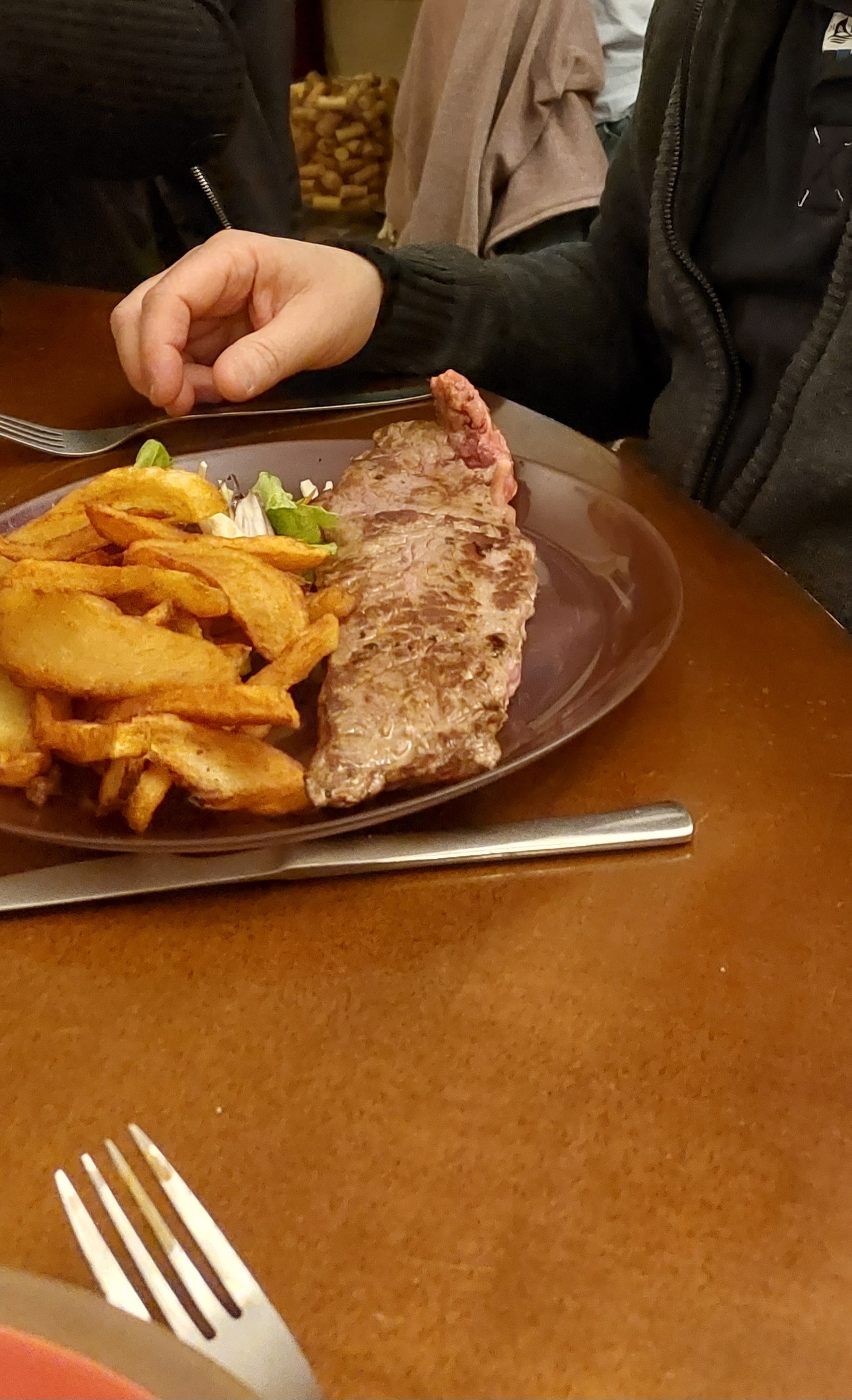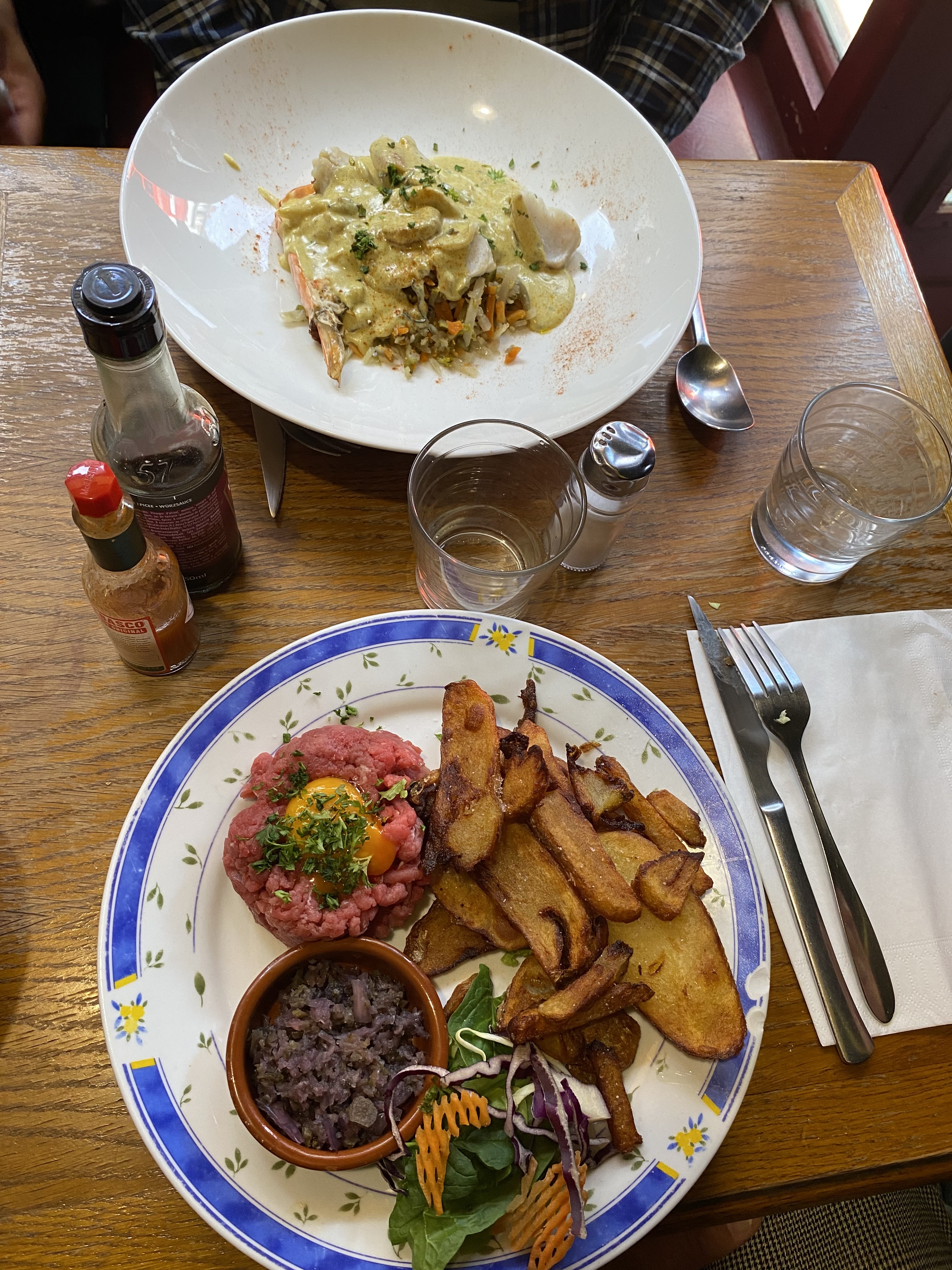 nous avons eu un très bon dîner ici. J'ai opté pour le menu (3 plats pour 18 euros) qui s'est avéré d'un très bon rapport qualité/prix. Je recommande vivement le steak tartare et la tarte tatin. l'entrée au fromage fondu était bonne; l'autre plat principal (steak et frites) avait d'excellentes frites mais un steak trop cuit. l'endroit est très original, j'ai adoré l'ambiance. les réservations sont obligatoires, ou allez-y après 21h
