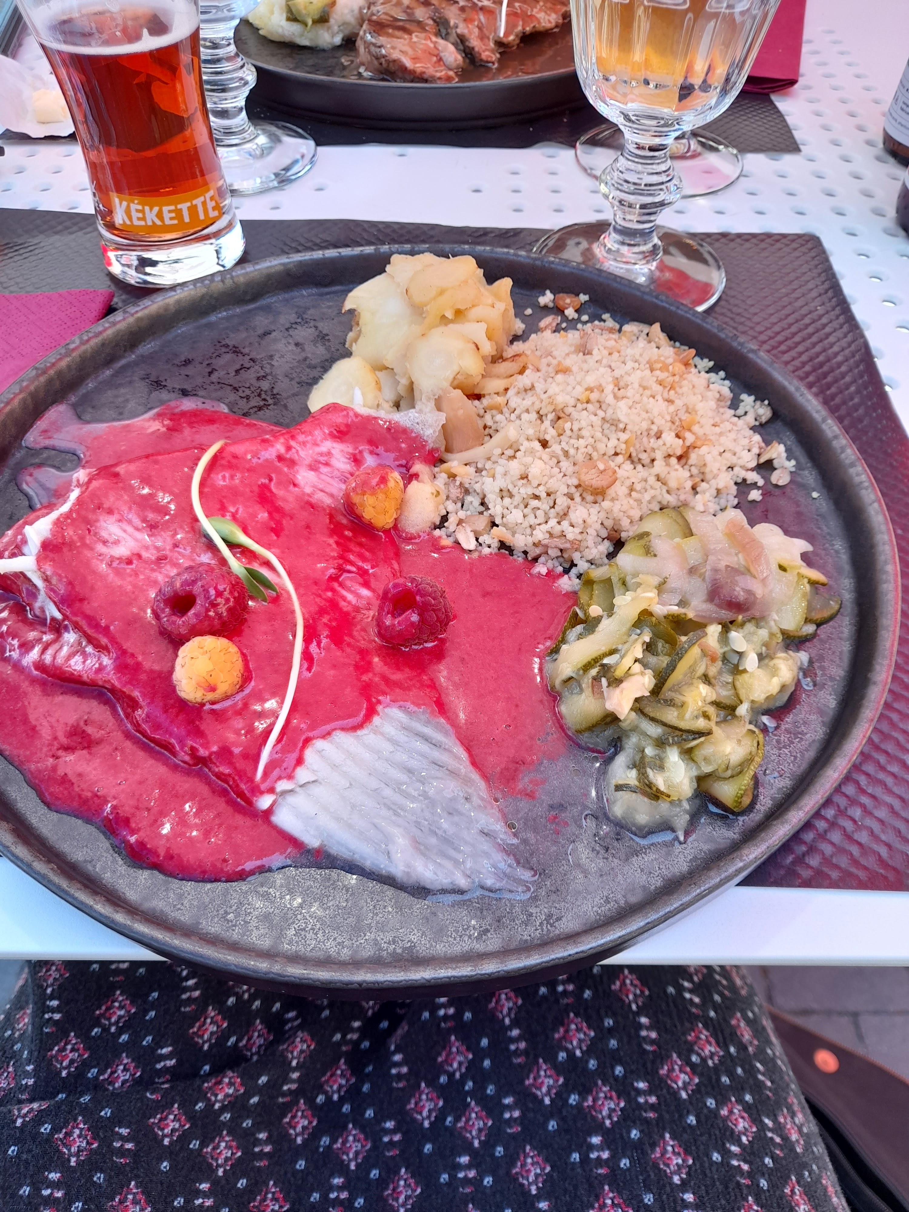 Plat copieux j'ai découvert de nouvelles saveurs avec l'aile de raie et la sauce beurre fruits rouges je crois les carottes et la ratatouille excellente bonne Saveur je recommande