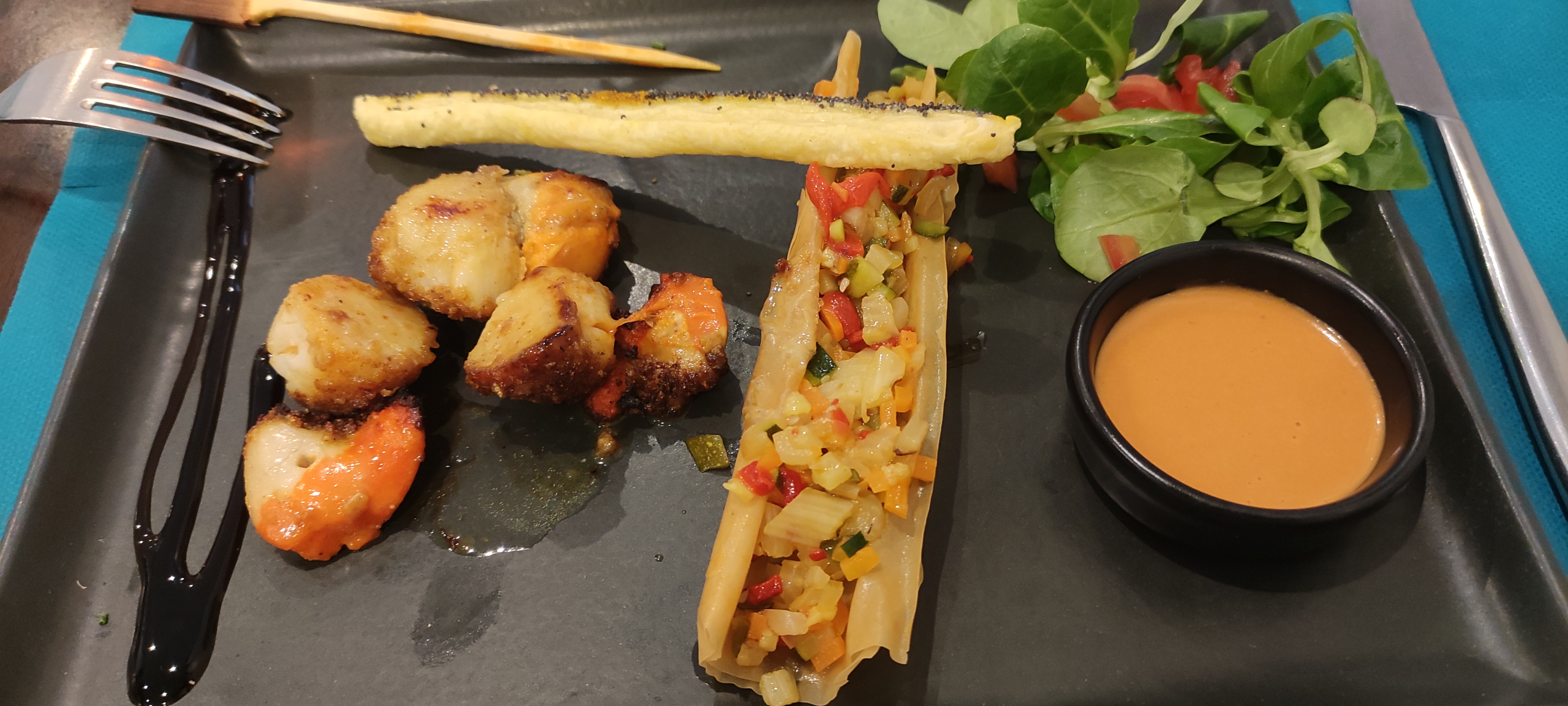 Tout etait absolument delicieux, le foie gras, la brochette de st jacques, la daurade, et special coup de coeur pour le bar et le camembert pane, un patron sympatique. Ideal pour soiree romantique en bord de charente. Merci.
