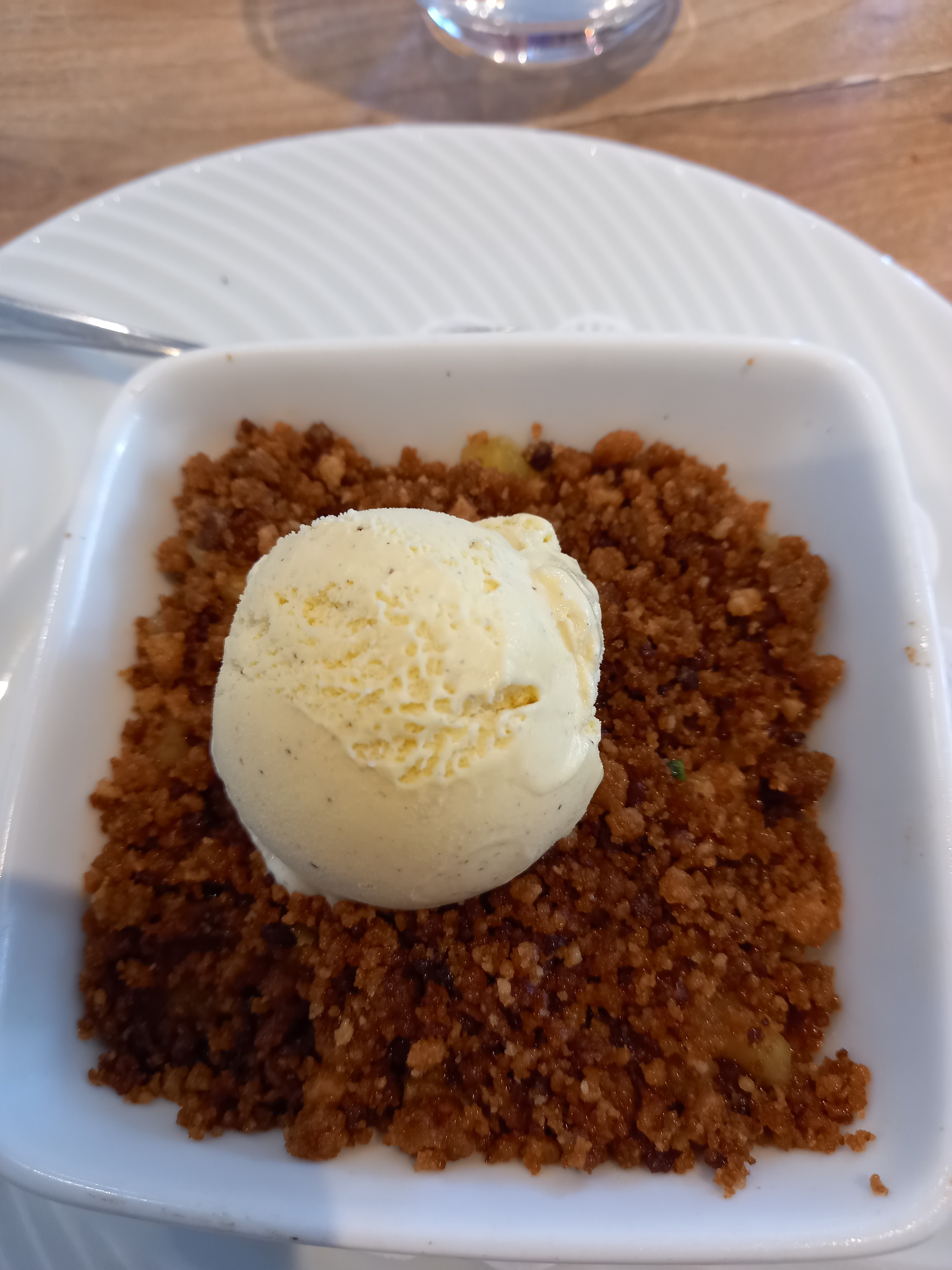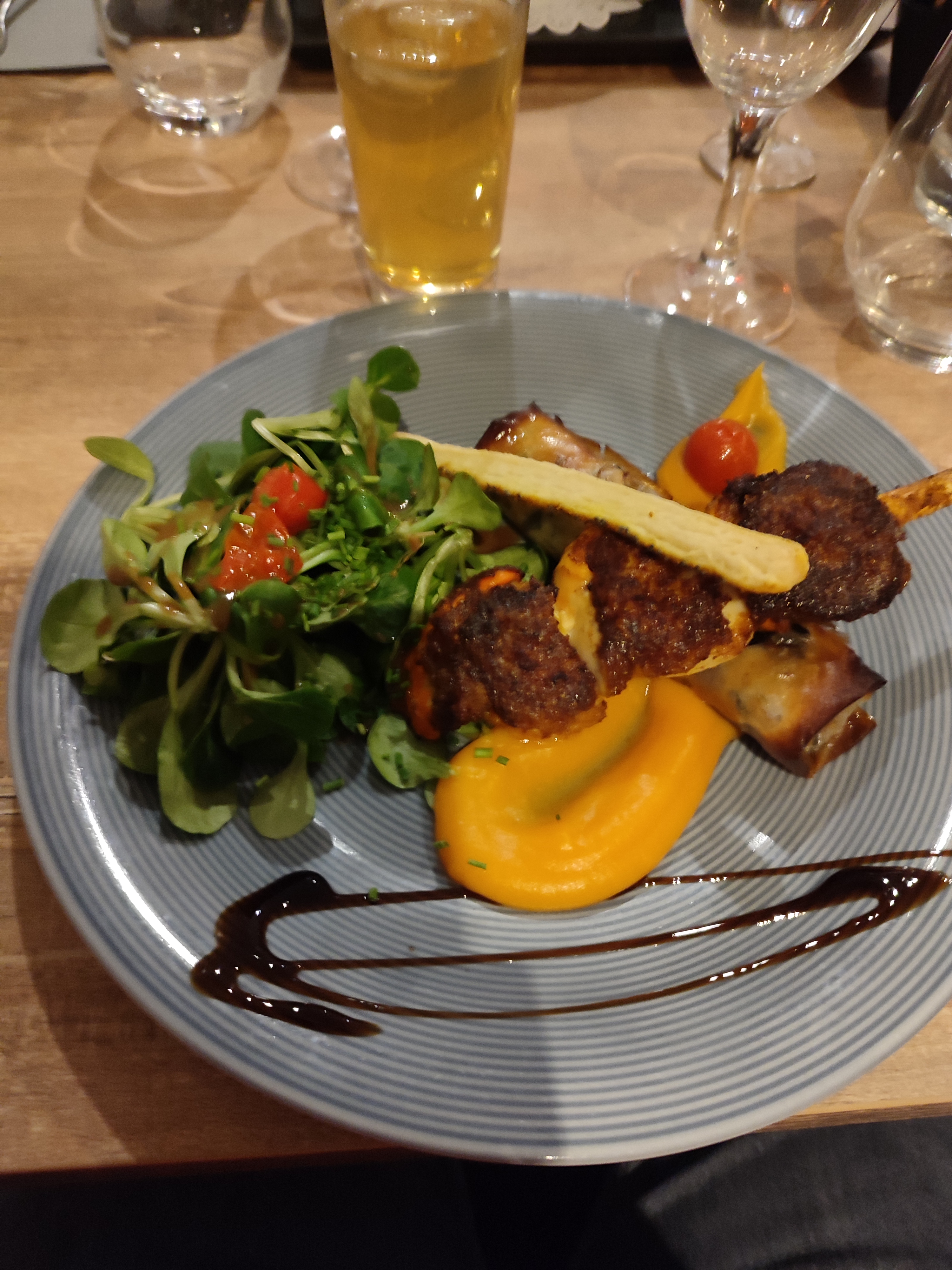 Un service très agréable et amical tout en étant pro, une carte complète et concise pour être fraîche, un poisson du jour impeccable tant à l'œil qu'à la dégustation (filet de maigre bisque de Langoustine avec choux rouge sur brique, endive braisée, écrasé de pommes de terre et fondue de poireaux), un régal. Moi qui ne prends pas de fromage souvent, les quartiers de camembert coulant panés sur un lit de poires Williams confites... Mmmmm Il y a juste le carrelage au sol qui fait ancienne cantine et qui n'est pas à la hauteur des saveurs et du service... Bah on lui pardonne au carrelage 😉