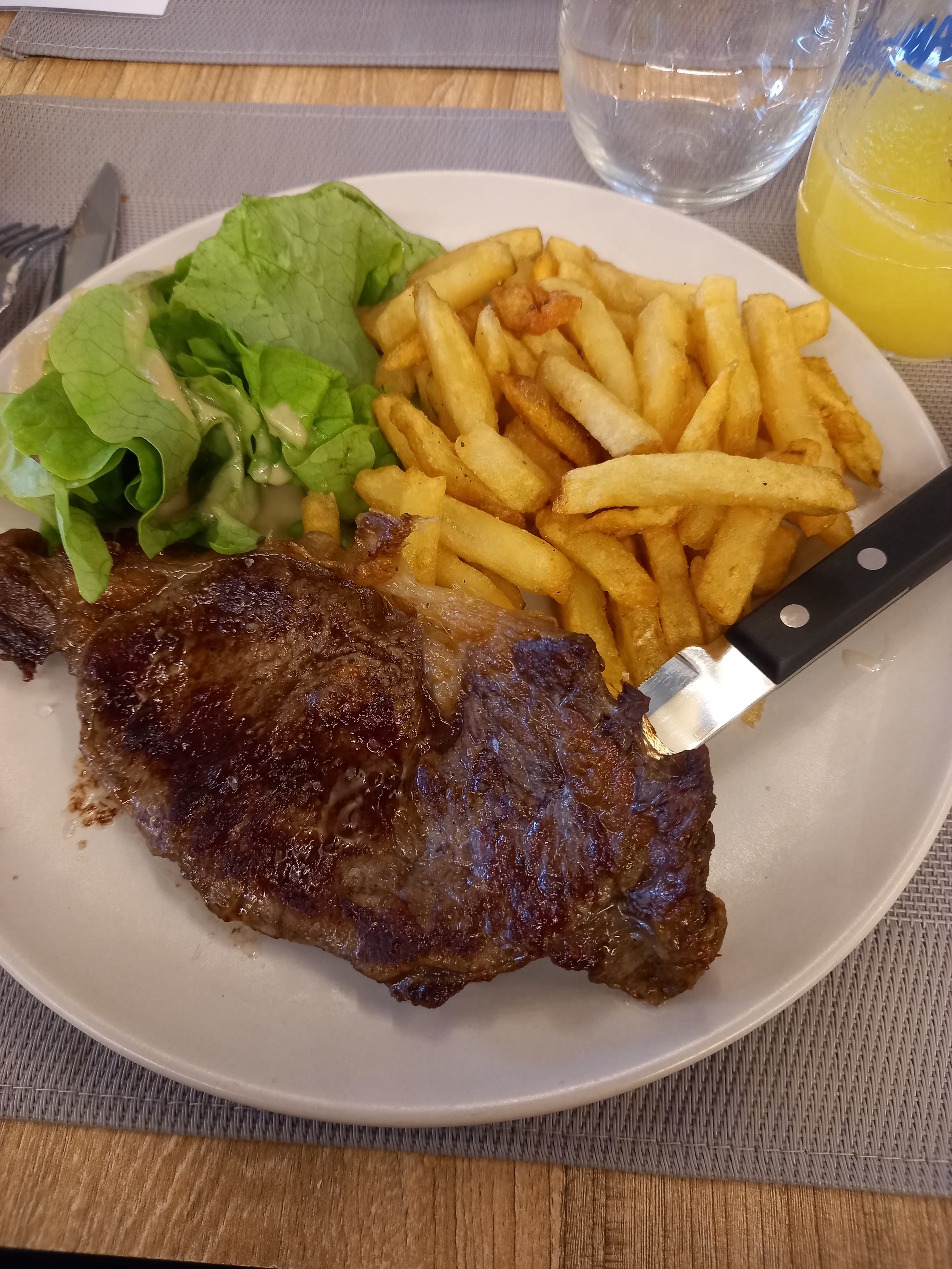 Accueil impeccable, joli cadre, très bon rapport qualité-quantité / prix, service rapide, dressage simple mais soigné. Le velouté de saison aux champignons : un pur délice ; ensuite l'escalope normande très bonne ; et on ne m'a jamais servi d'île flottante aussi copieuse en dessert ! La carte des burgers faisait aussi envie, je tenterai à l'occasion, si je dois repasser par là je n'aurai aucune hésitation sur l'endroit où aller pour un bon repas ! Vivement recommandé 😉 Bon à savoir : chèques vacances ANCV et tickets resto acceptés ; toilettes impeccables 😉