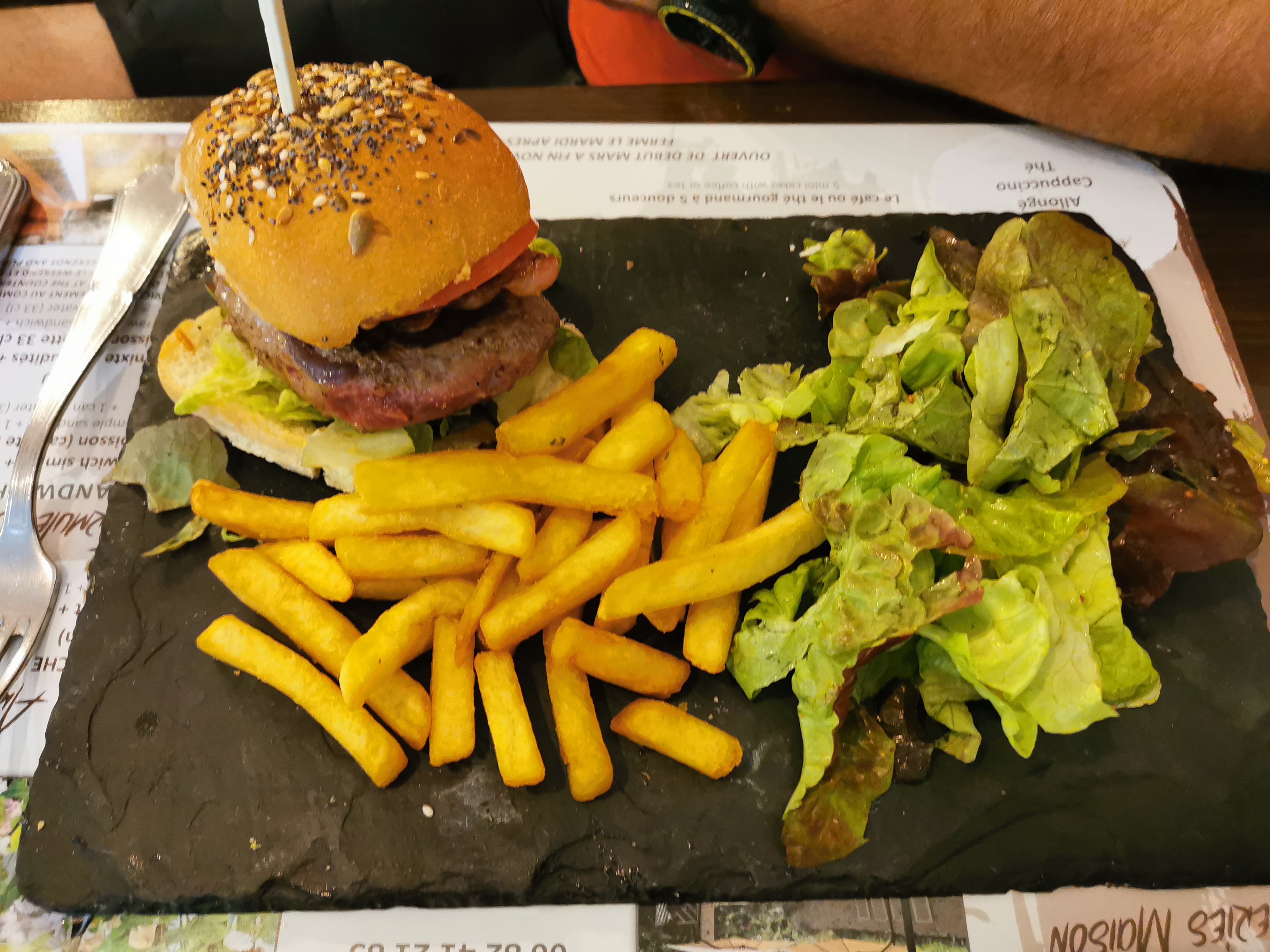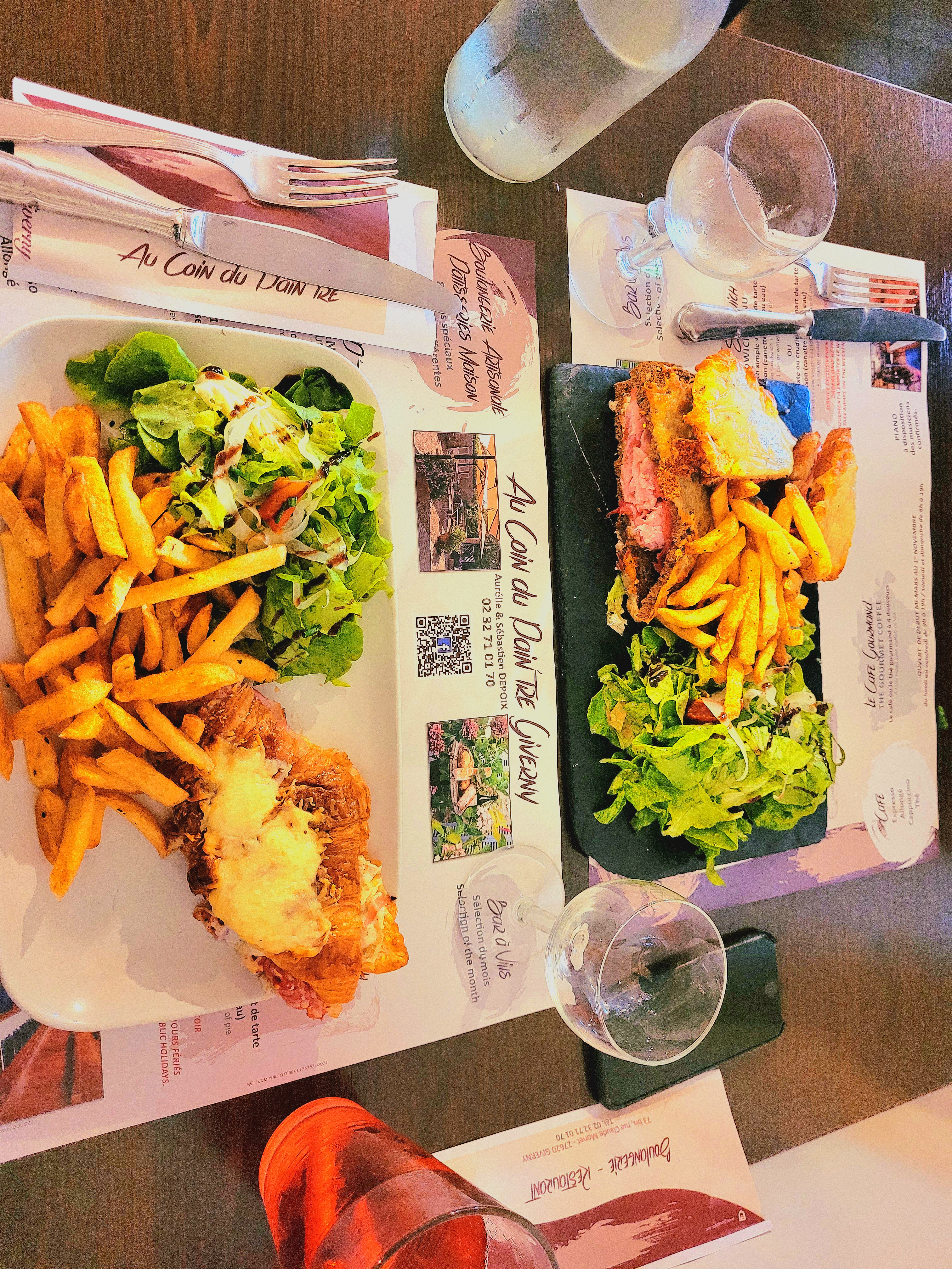 J'ai mangé ici après avoir visité les jardins de Monet. J'ai eu la tartine de saucisses (sandwich grillé ouvert) et ma femme a pris le hamburger. Les pommes de terre rôties avec son burger étaient vraiment bonnes et j'ai apprécié ma tartine.