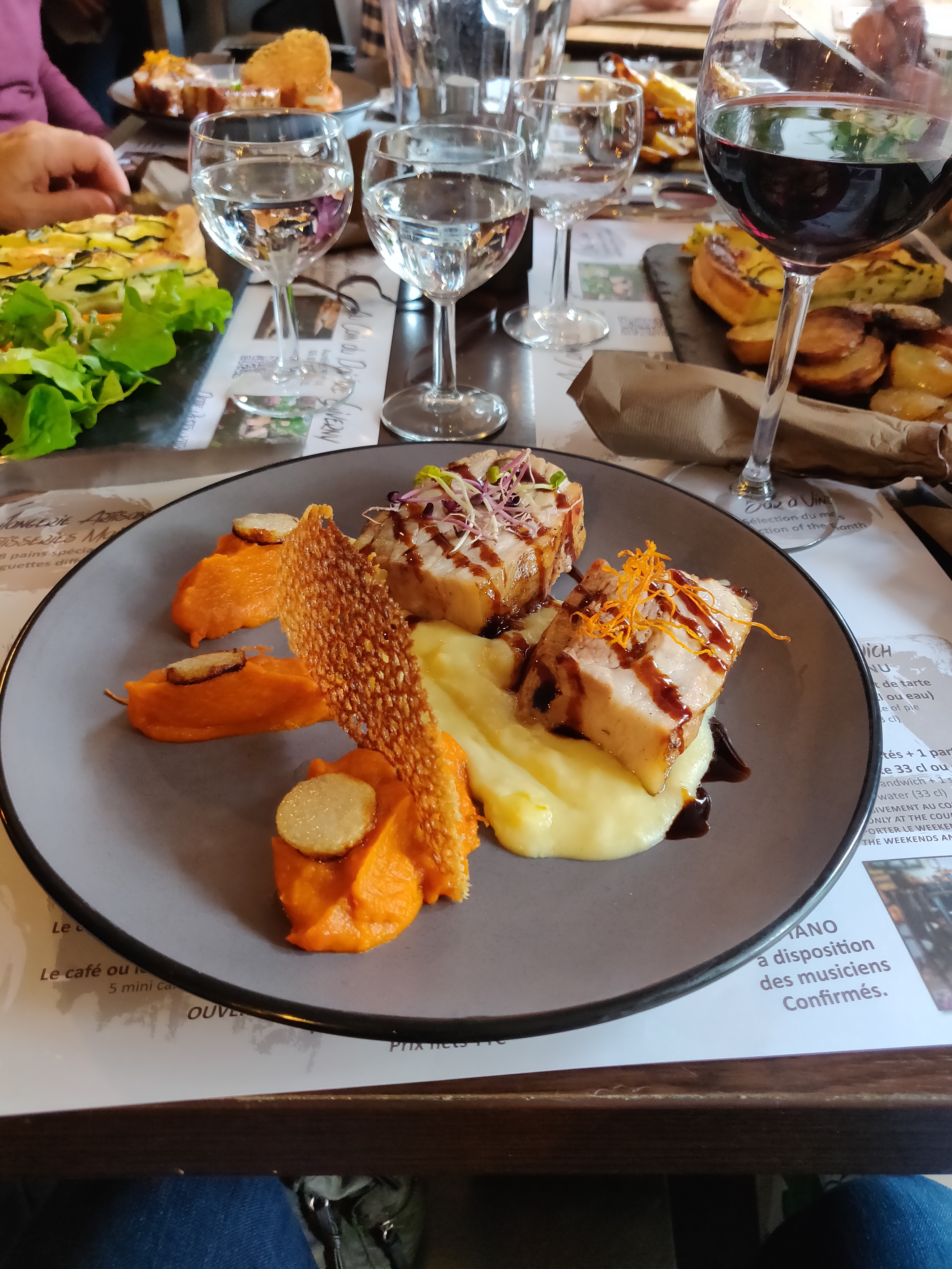 J'ai eu le porc, mon partenaire a eu la quiche, ils étaient tous les deux délicieux. Bien que nous soyons à côté d'un musée Monet, notre serveur a l'air d'avoir sauté d'un tableau de Renoir ! Il a rendu notre repas très agréable.