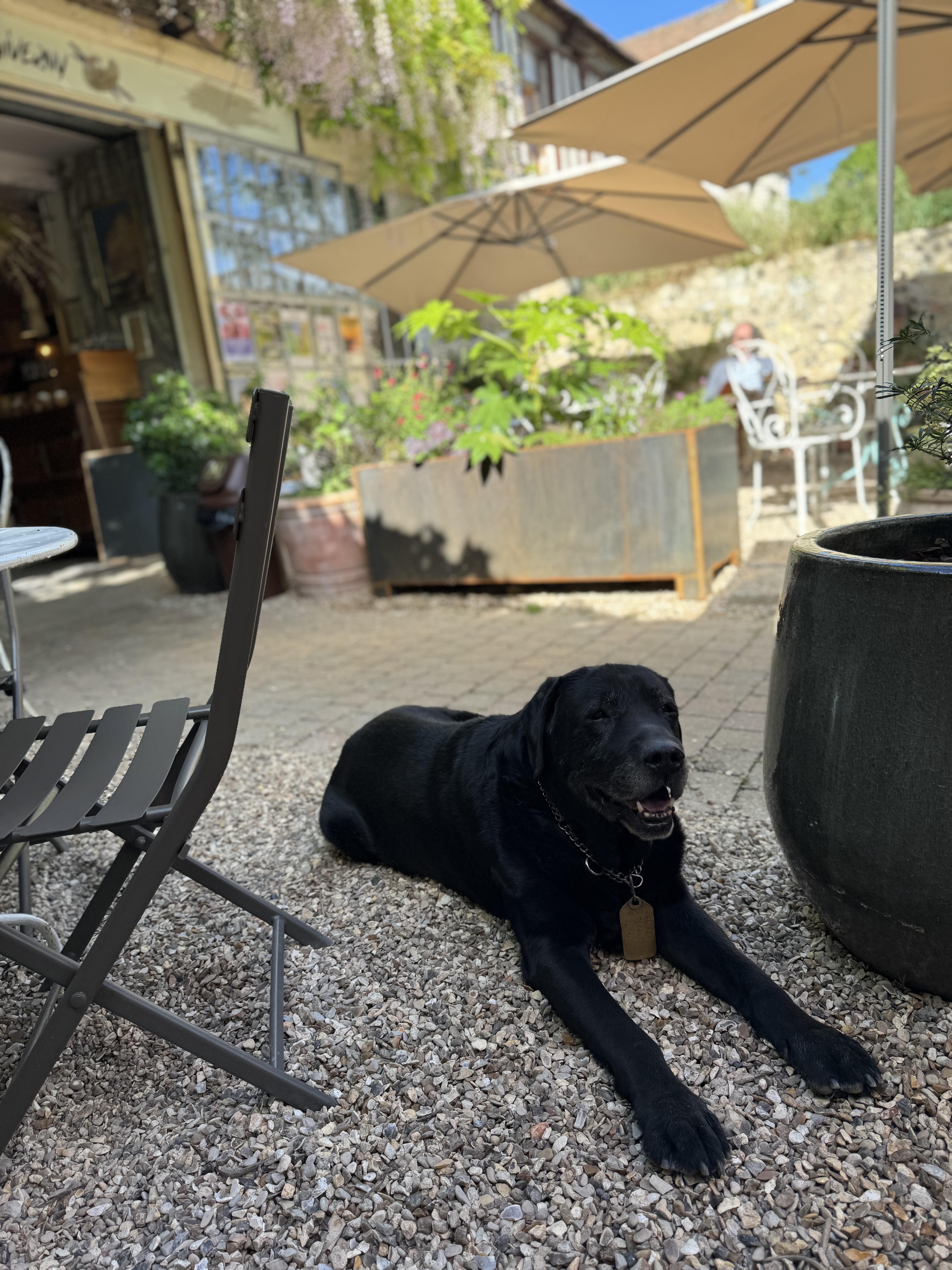 Déjeuner dans un petit jardin. Choix variés personnellement la planche campagnarde très bon. Cerise sur gâteau nous sommes aussi chez un boulanger alors le pain ! J’oubliais les pâtisseries bien entendu faites maison.