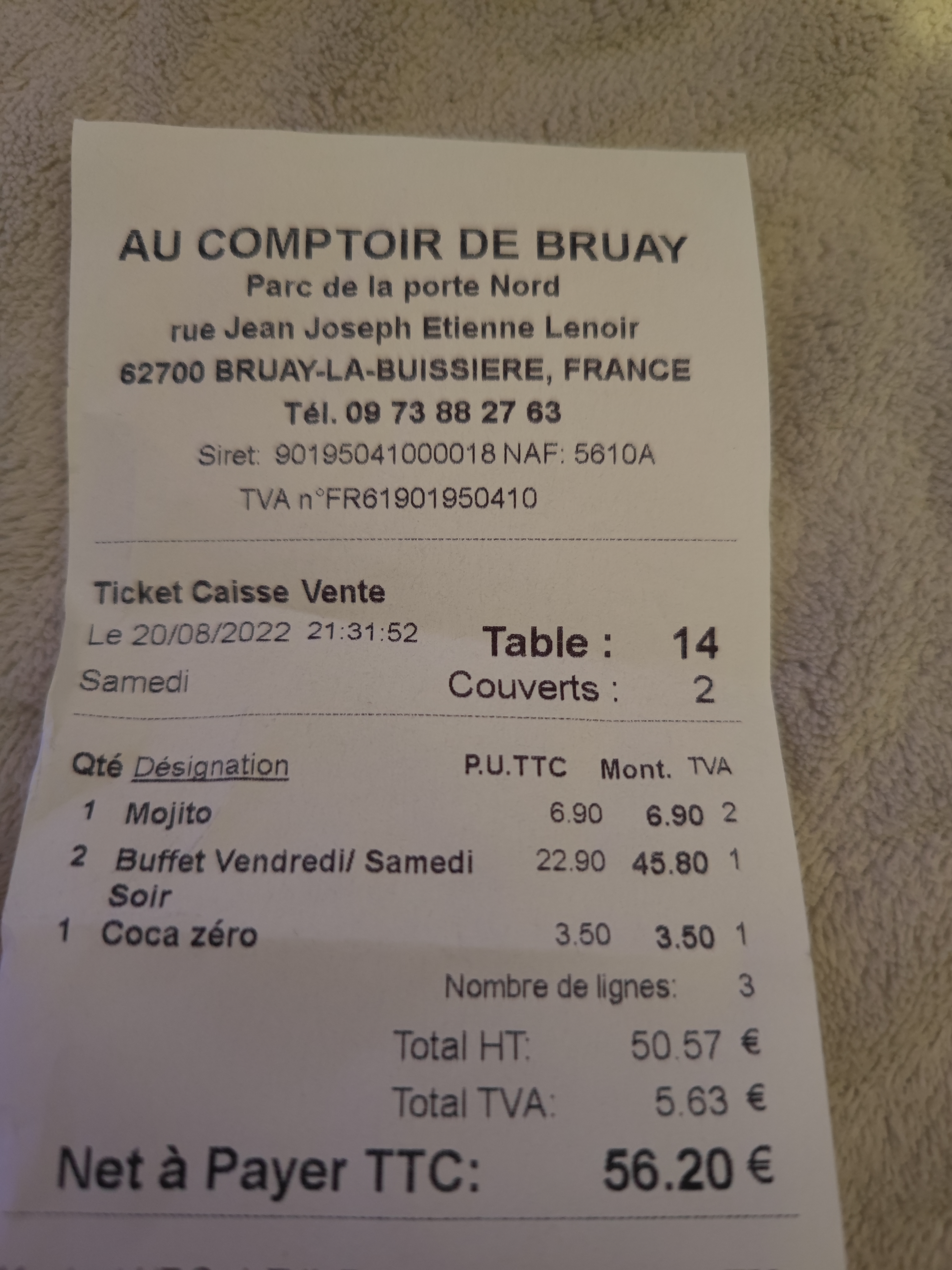 La caissière nous a compté presque 3 euros de trop sur l addition. On a payé en espèces. Elle nous pas donné de ticket de caisse. On a donc pas pu réclamer. Donc chers clients faites bien attention à vos comptes !!