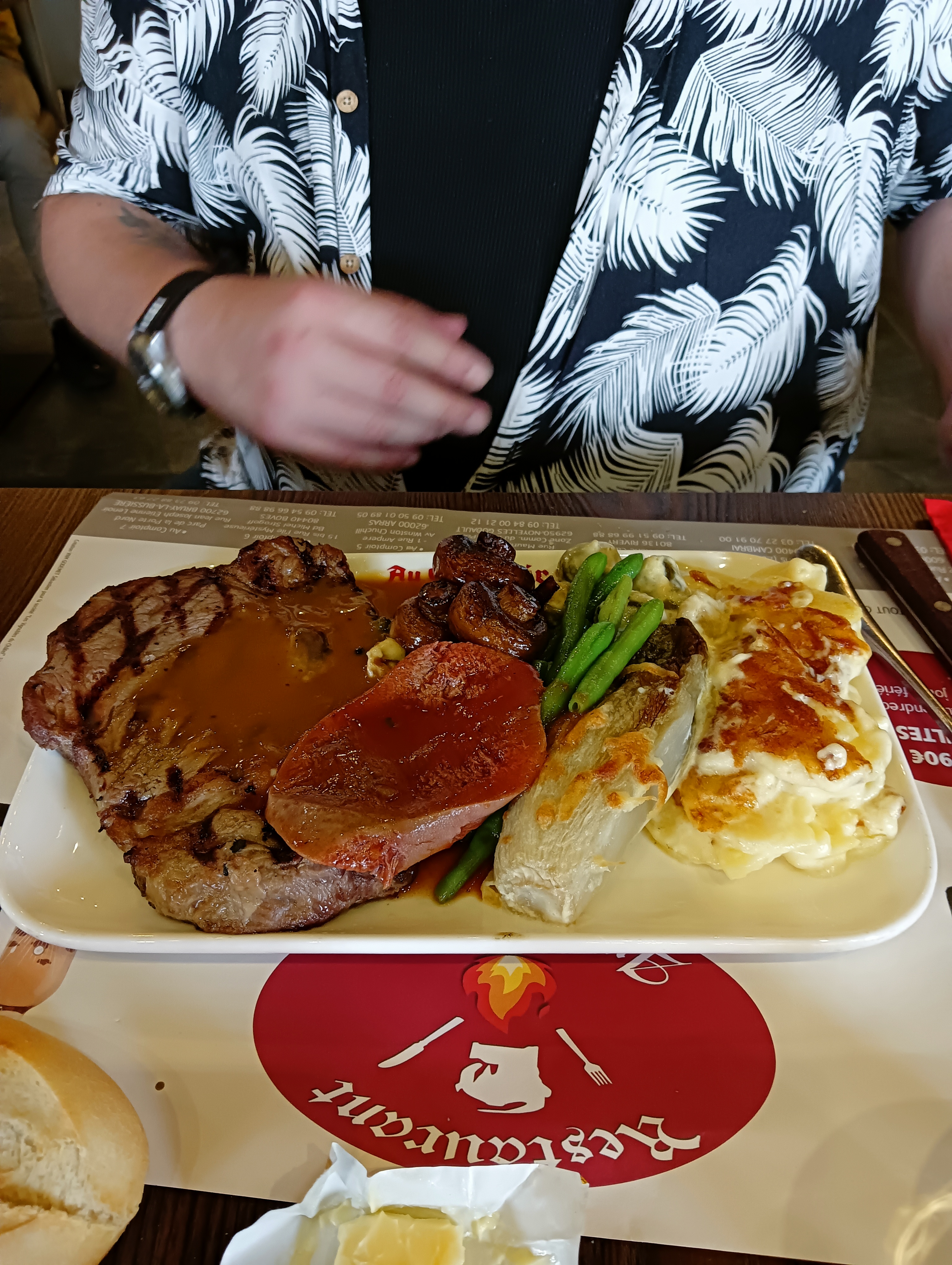 Nous étions trois placés, pas le droit de choisir. Beaucoup de produits surgelés surtout les pâtisseries, rien de fait maison, plus d’entrecôte, 2 légumes au buffet, pas de pâte, attention ⚠️ les poissons 🐟 sont vraiment très bizarres à l’œil !!! Rumsteck très bon , bavette très bonne.
