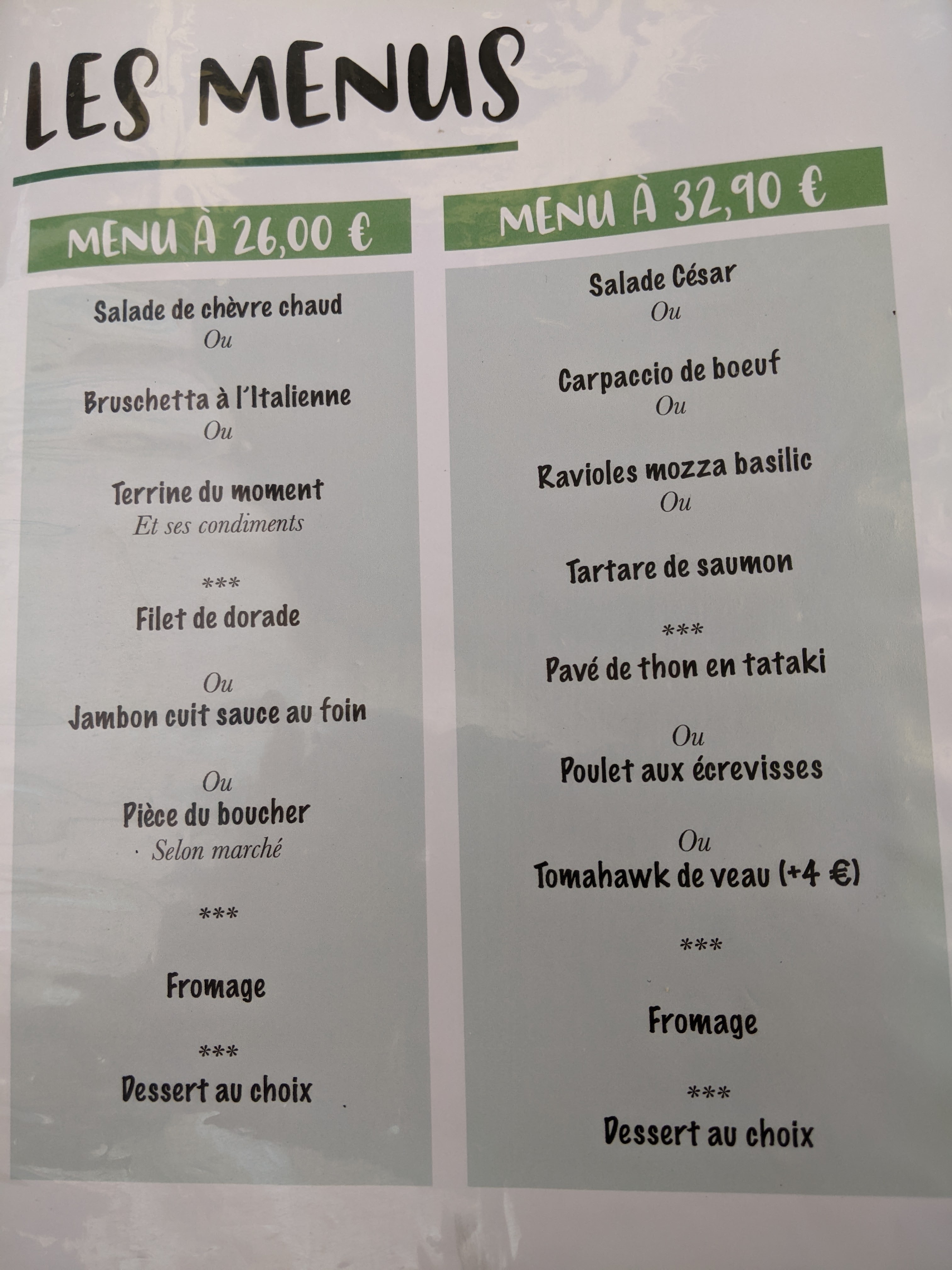 Excellent accueil. Menu du jour (entrée parfaite, viande à revoir et dessert île flottante à revoir) Désolée mais aurait souhaite une viande plus tendre, et présentation de dessert version enfants.