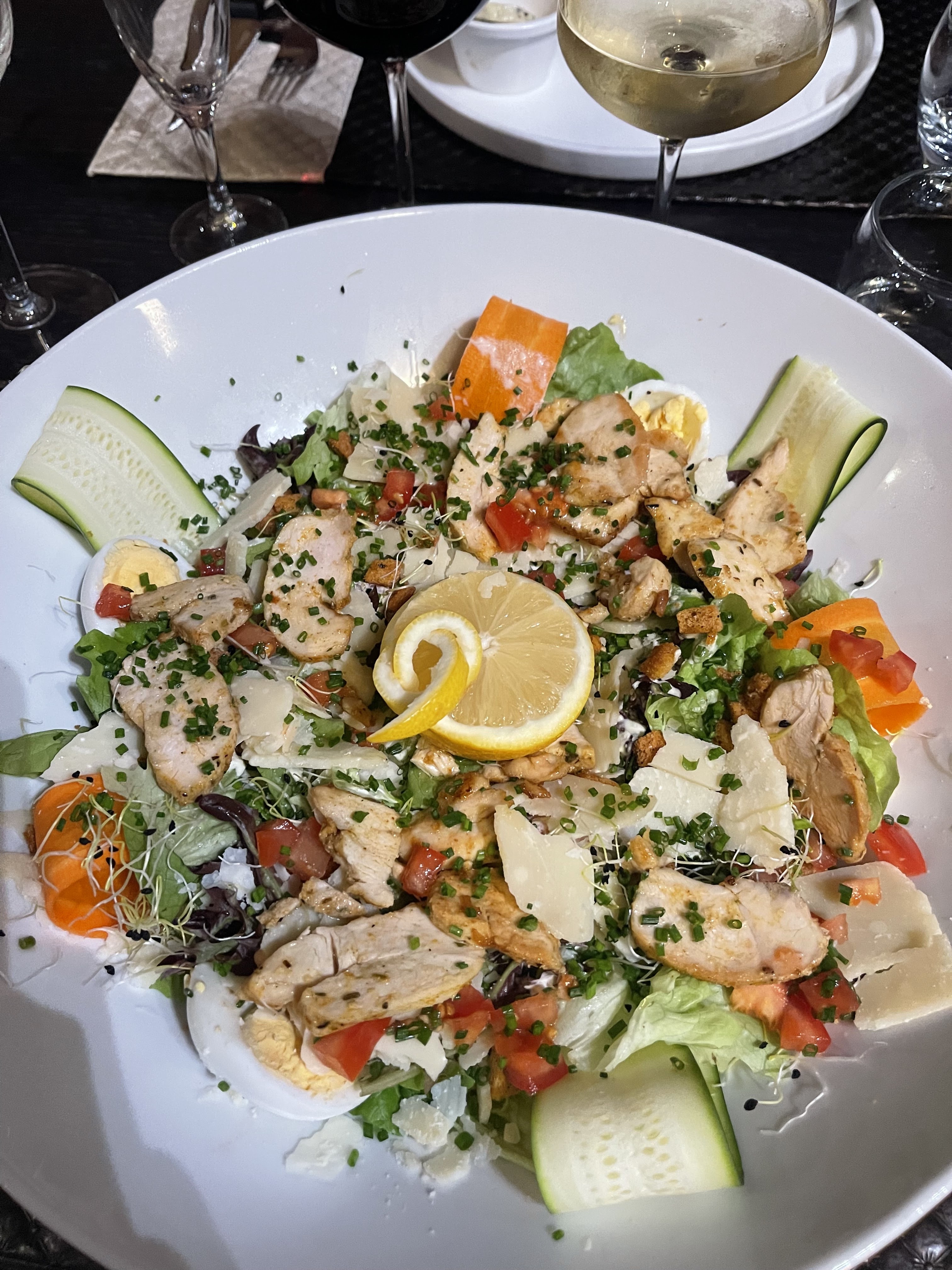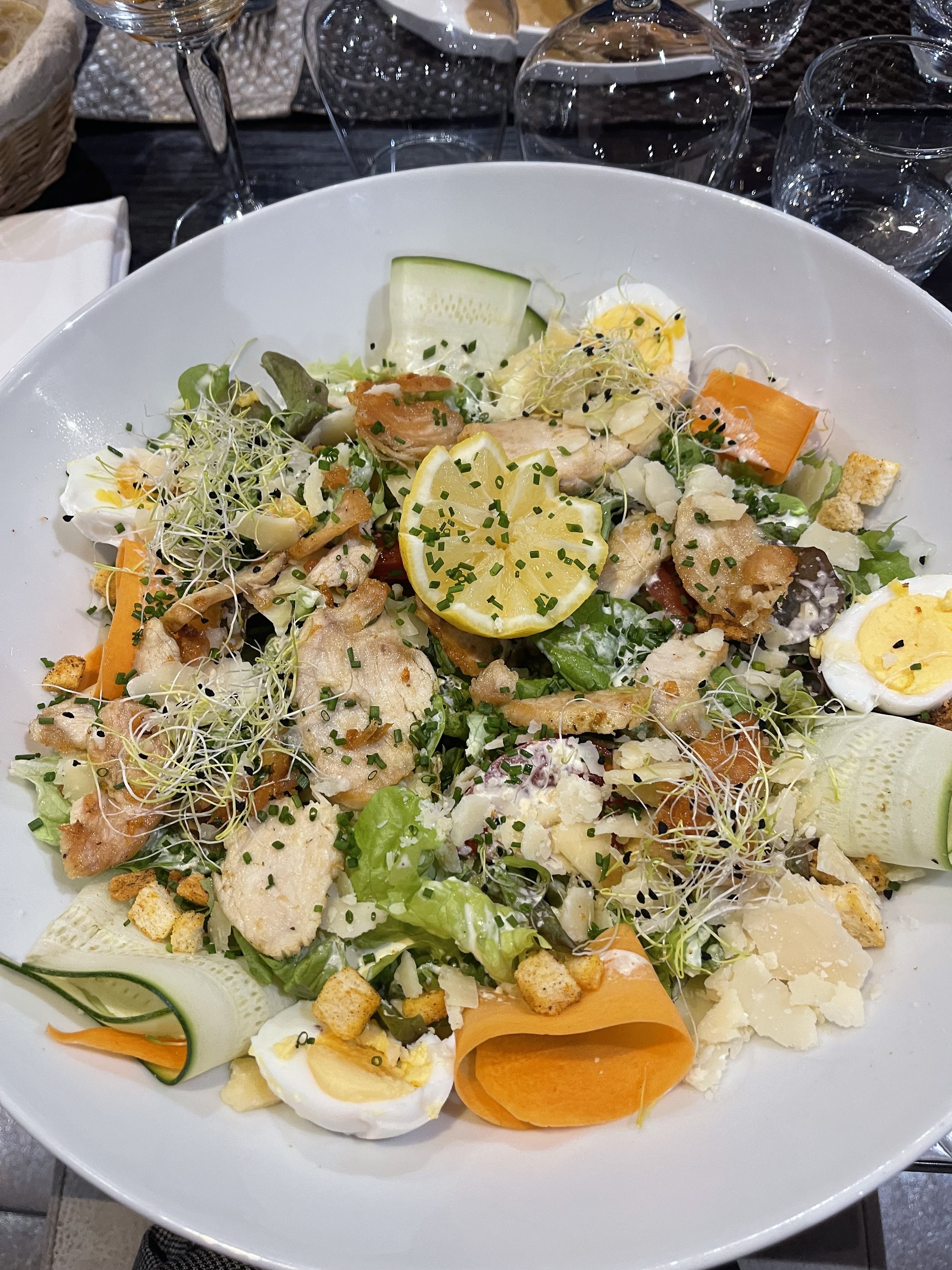C'est délicieux mais trop copieux dommage cela engendre du gaspillage. Assiette de 32 cm de diamètre, salade superbe.