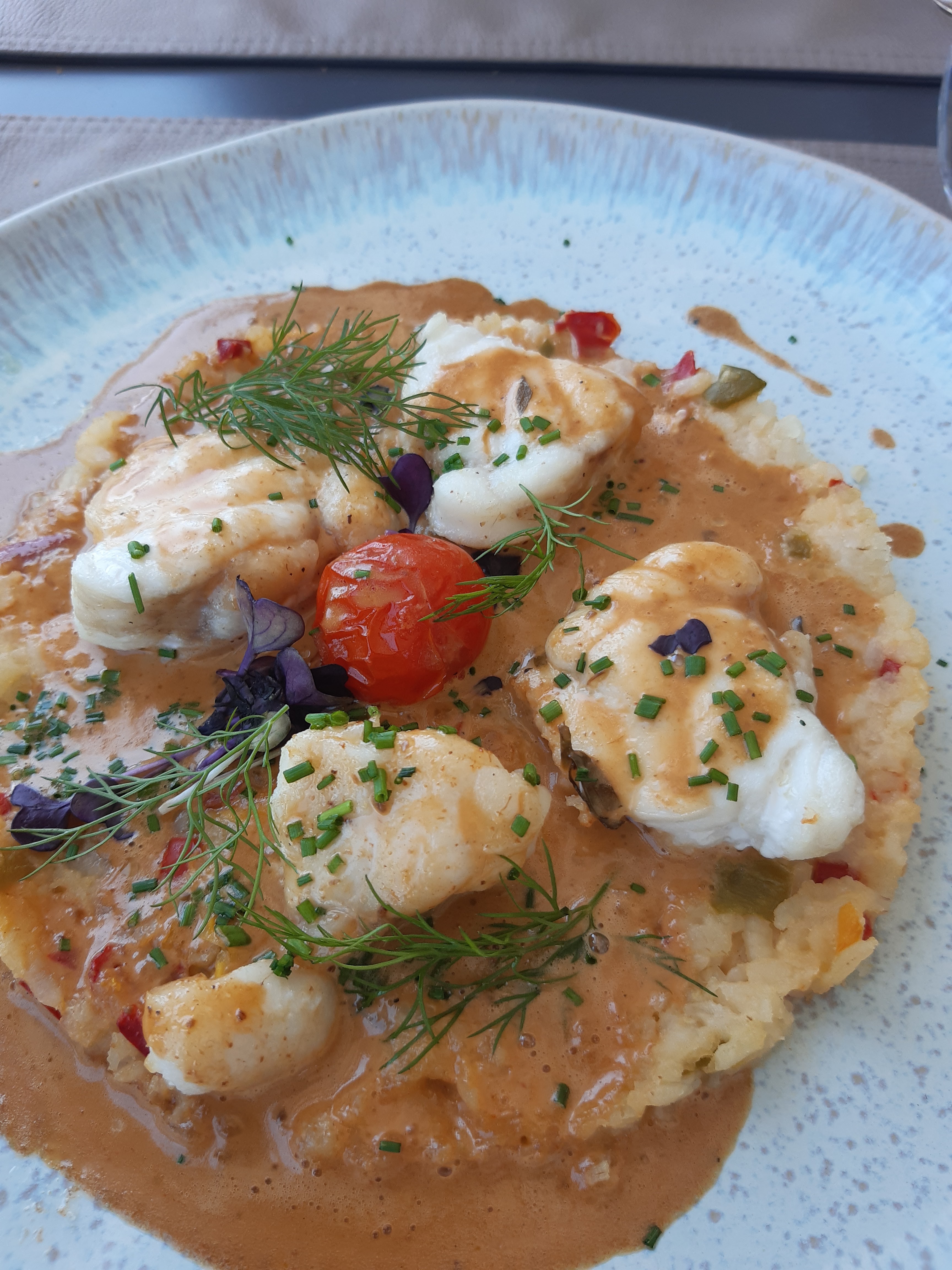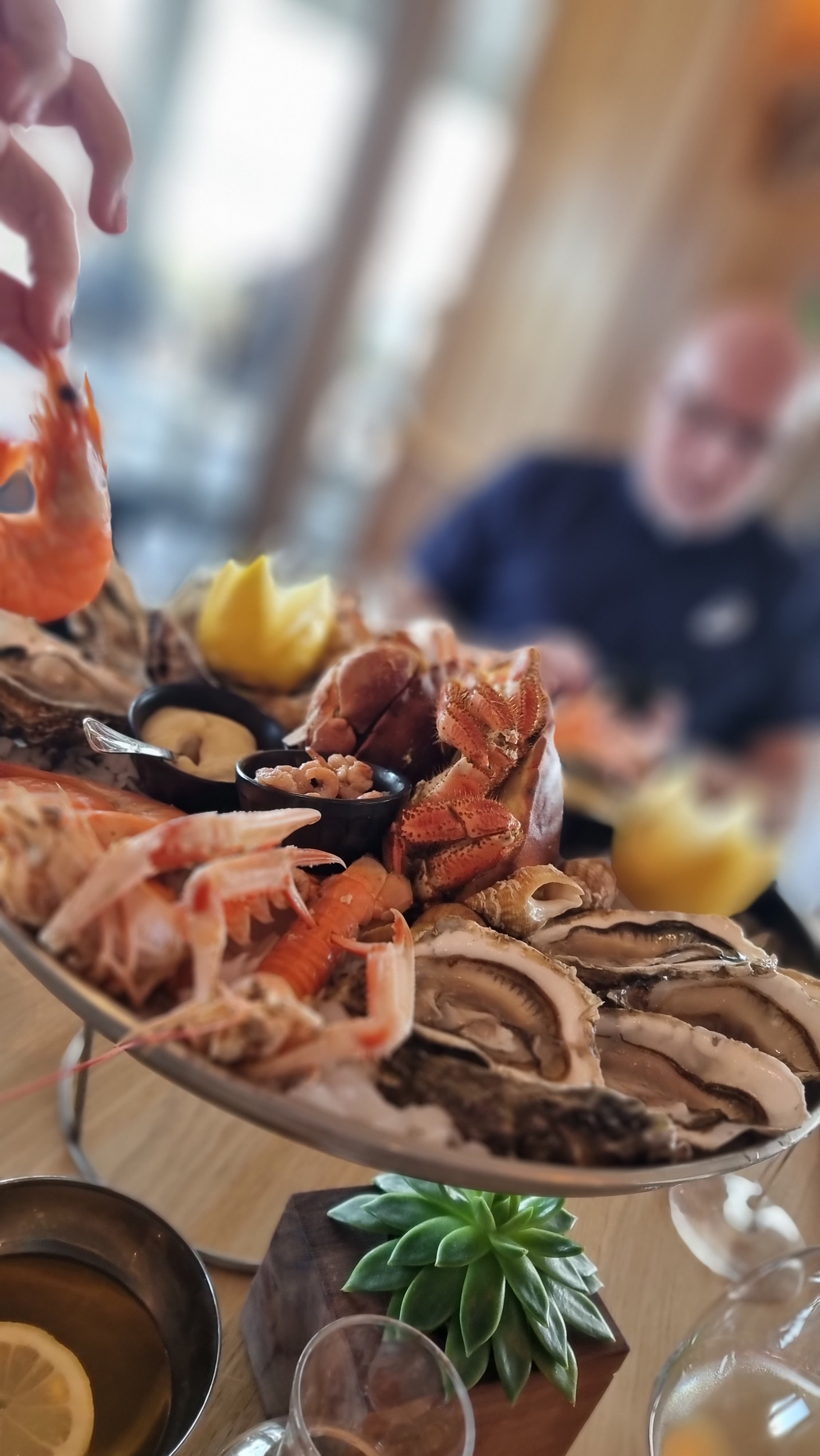 Dans ce décor de bateau soigné avec une vue sur les ferries la carte évidemment sent bon l'océan. Des bons produits bien mis en valeur que ce soit par leur association que dans l'assiette. Atmosphère plaisante personnel aimable service très bien toujours sympa de voir le chef en fin de repas. Au vu de notre nombre un café en fin de repas aurait été bienvenue et le 5* obtenu. Nous y reviendrons.