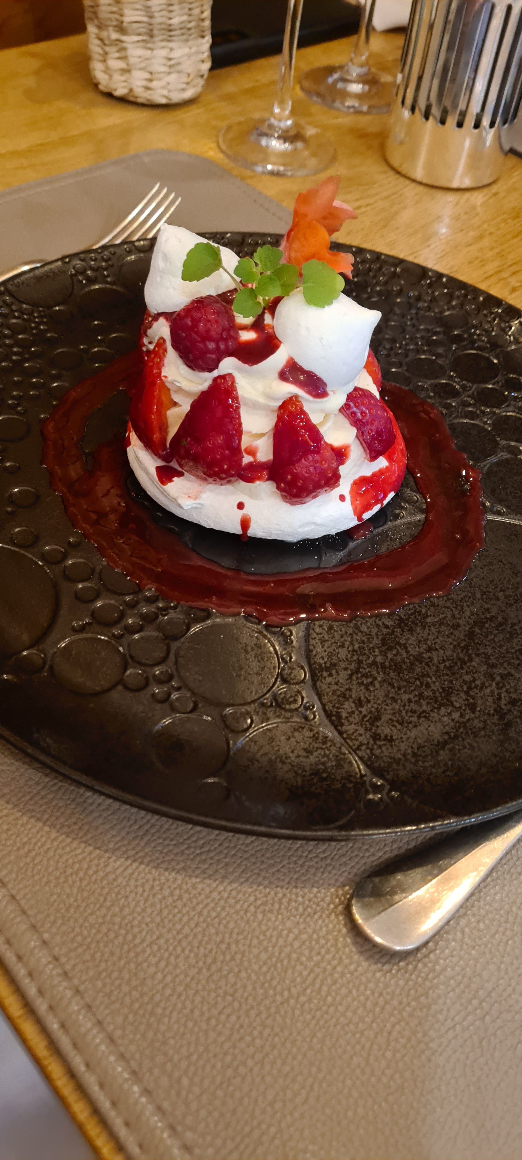 Excellent repas : entrée de crustacé, cabillaud et pavlova aux fraiseS ! Joli cadre.