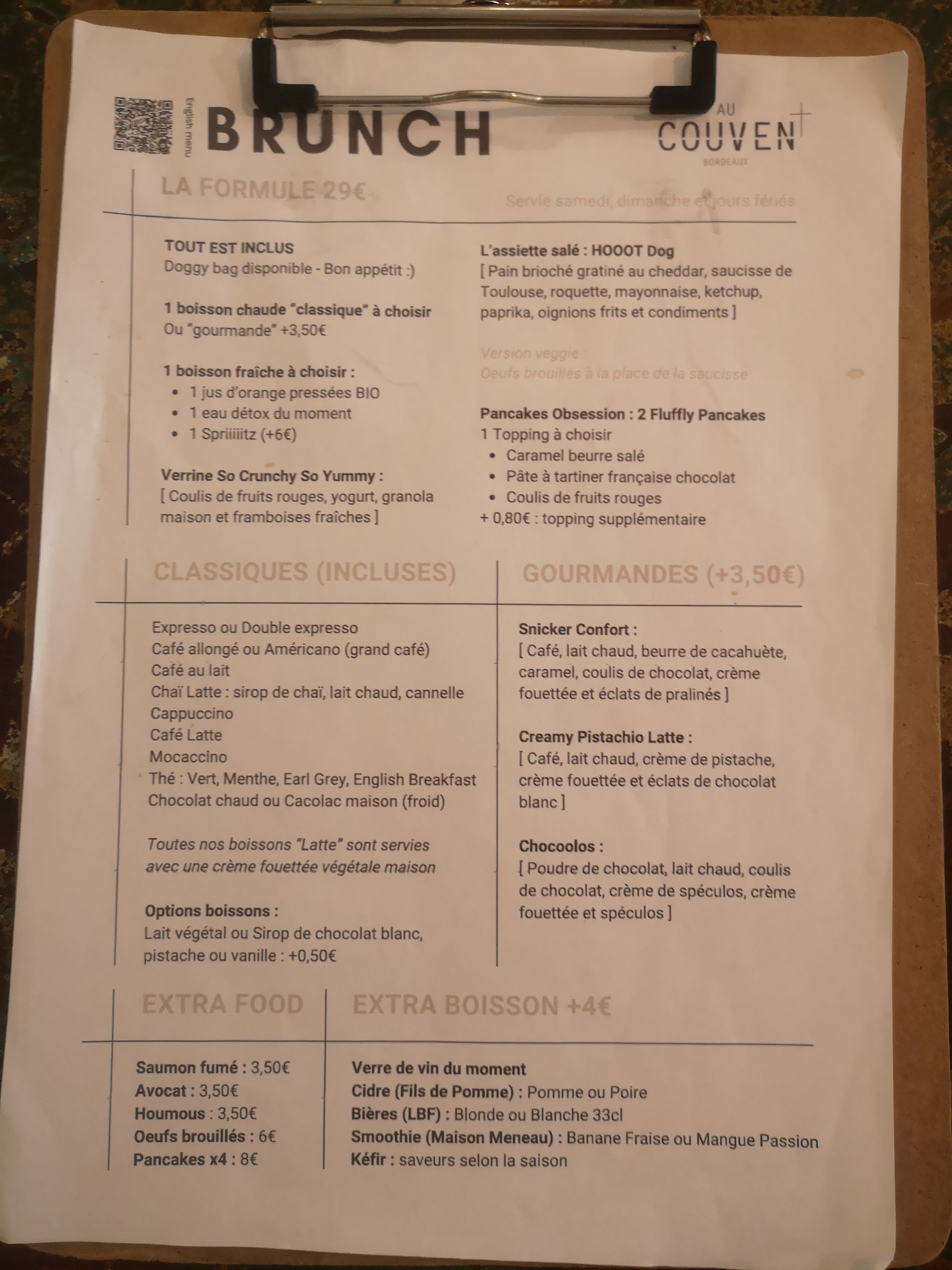 Super expérience au Couvent, un des meilleurs brunchs que nous ayons testé à Bordeaux. La carte est relativement restreinte et directive (dans la formule, nous avons par exemple forcément un hot dog, un granola et des pancakes), ce qui est plutôt un bon point selon nous, nous facilitant le choix. Tout était vraiment délicieux, avec une mention spéciale pour le hot-dog. La déco et l'ambiance sont très sympas Rien à dire sur l'accueil et le service. Le seul défaut semble être le prix un peu élevé mais avec la possibilité de faire un bon cadeau, cela peut en faire une très bonne surprise.