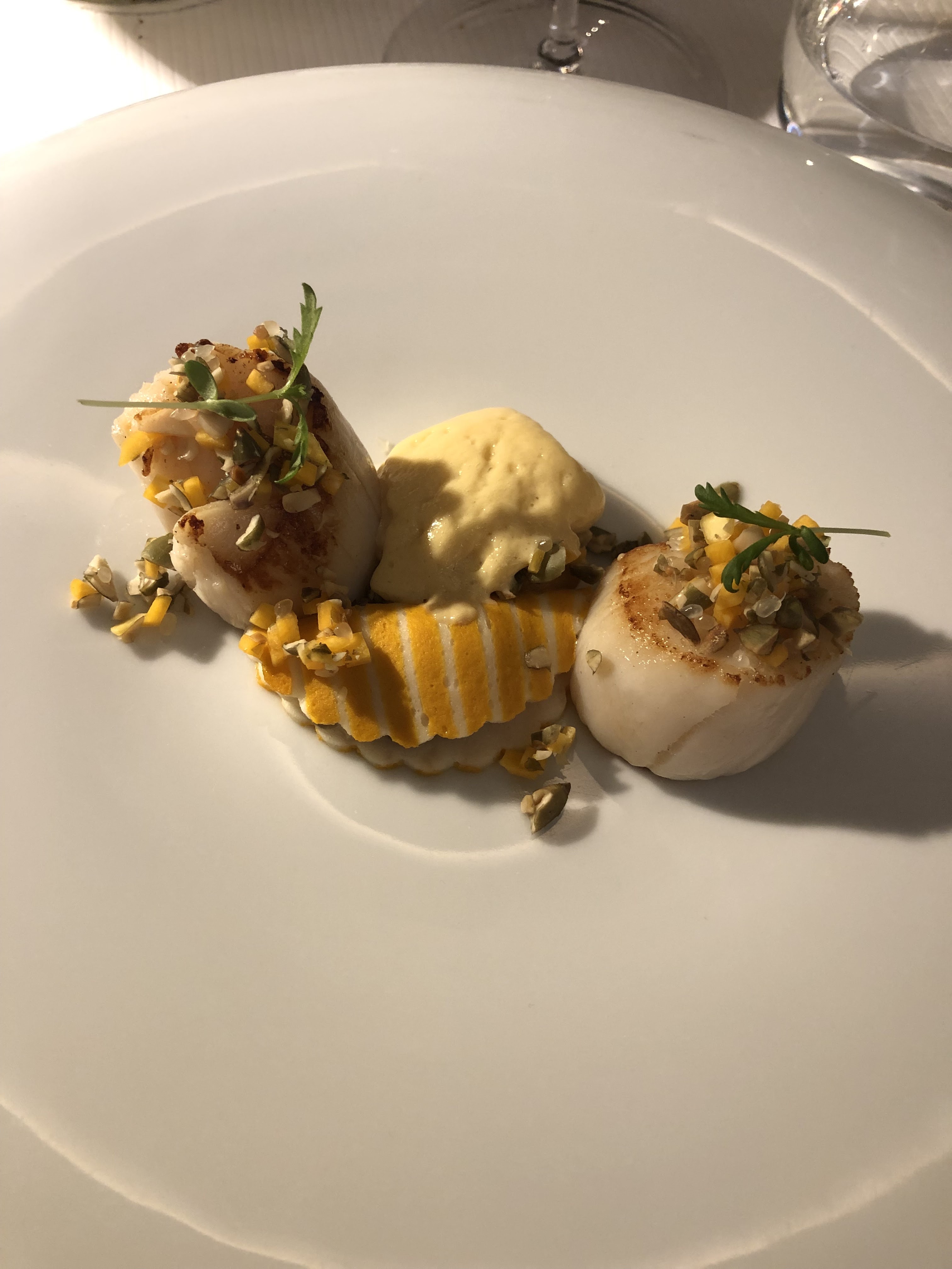 Menu dégustation: les plats sont bien préparés et complémentaires, on s'attendrait tout de même à plus de diversité dans les saveurs et plus de créativité dans la présentation. Bons conseils du sommelier, néanmoins le prix du verre de vin reste élevé Cadre trop impersonnel à mon goût, personnel efficace.