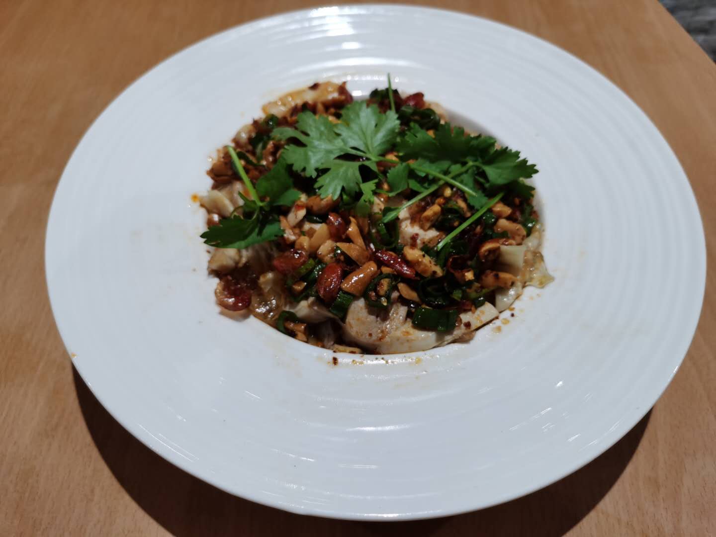 Le poulet bouilli a la sauce au piments chaud est un pure délice! Accompagné d'aubergines sauté a l'ail et de ravioli au boeuf qui fondent dans la bouche un réel plaisirs gustatif ! Bravo au chef