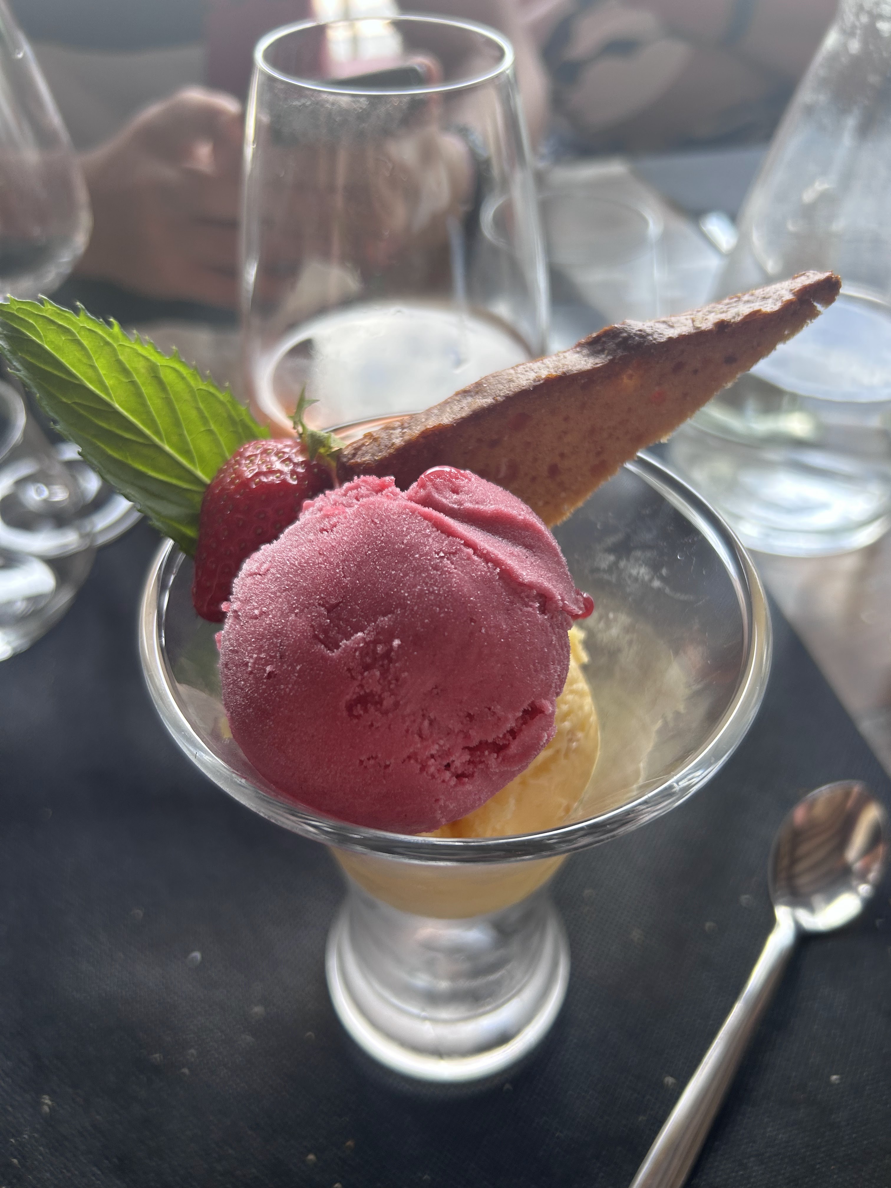 Accueil glacial du patron vraiment désagréable heureusement le serveur était très gentil souriant et aimable. Les glaces étaient très bonnes et le cadre mélangé a la vue est vraiment sympa. Dommage que ca n' égaye pas plus le proprietaire!