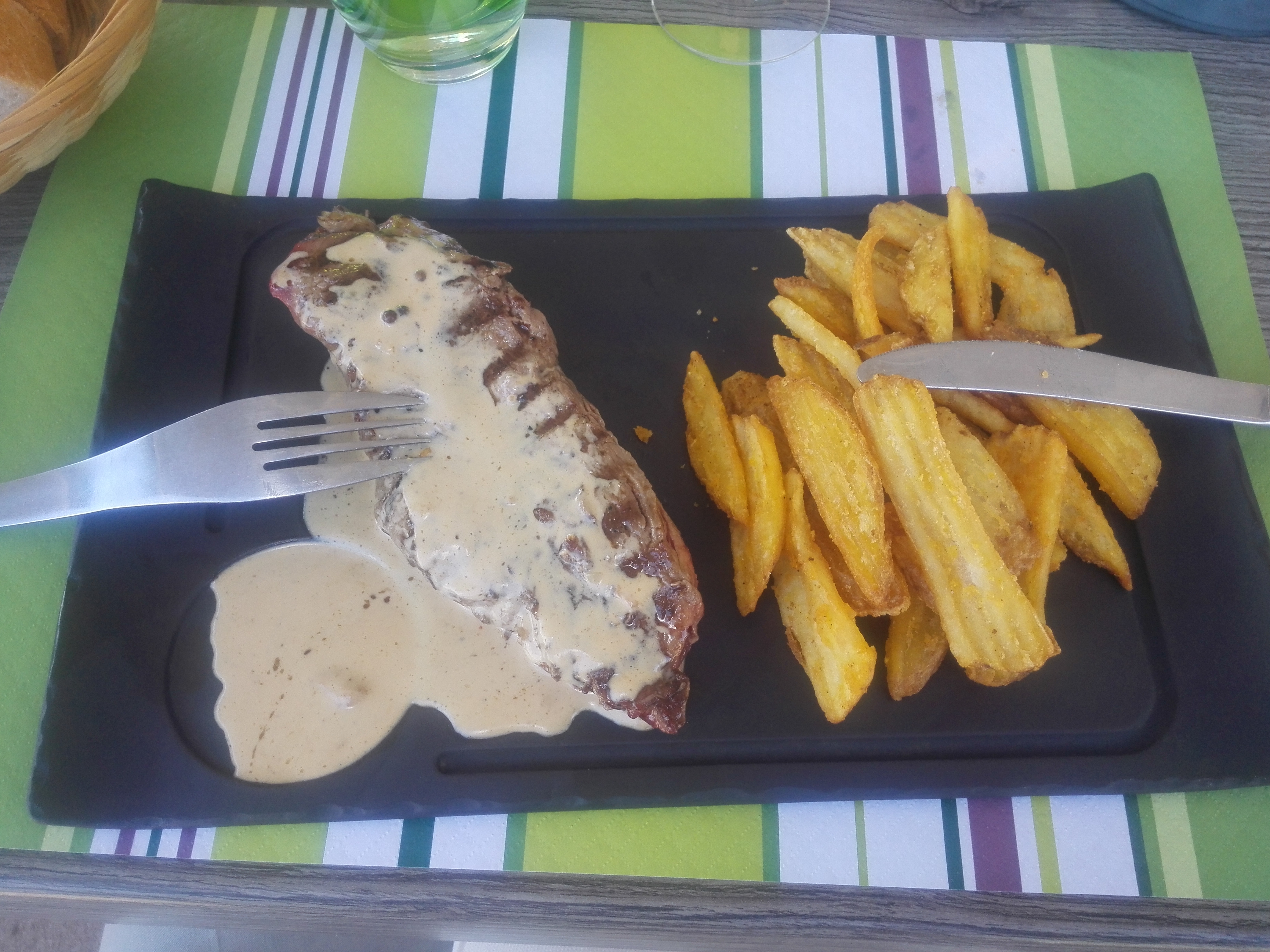 Nous nous sommes arrêtés avec un amis en rentrant d'un tour de moto donc pas a l'hôtel mais en terrasse au bord de la rivière, un endroit sympa très bien accueilli et servi