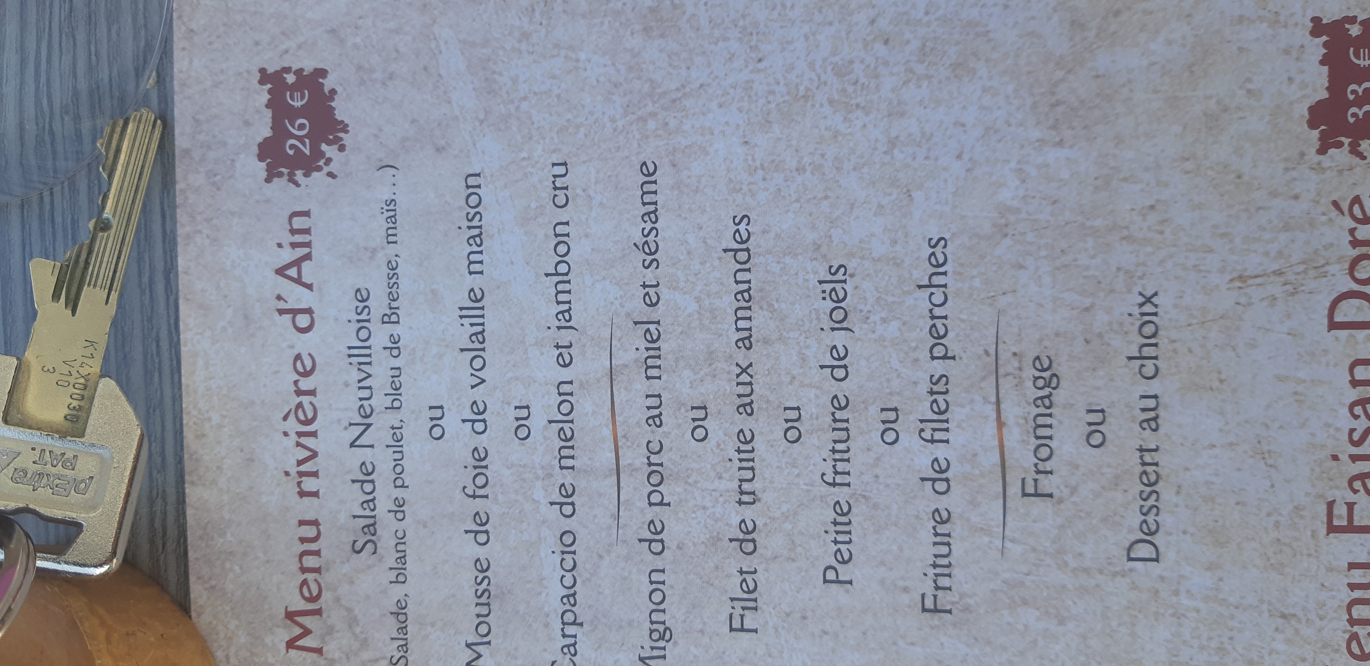 Ne pas prendre le menu à 37€ trop cher question qualité prix, en outre, les cuisses de grenouilles et les gratins etaient froids, le service n'etait pas à la hauteur. Sinon la terrasse offre une belle vue sur la rivière de L'Ain.