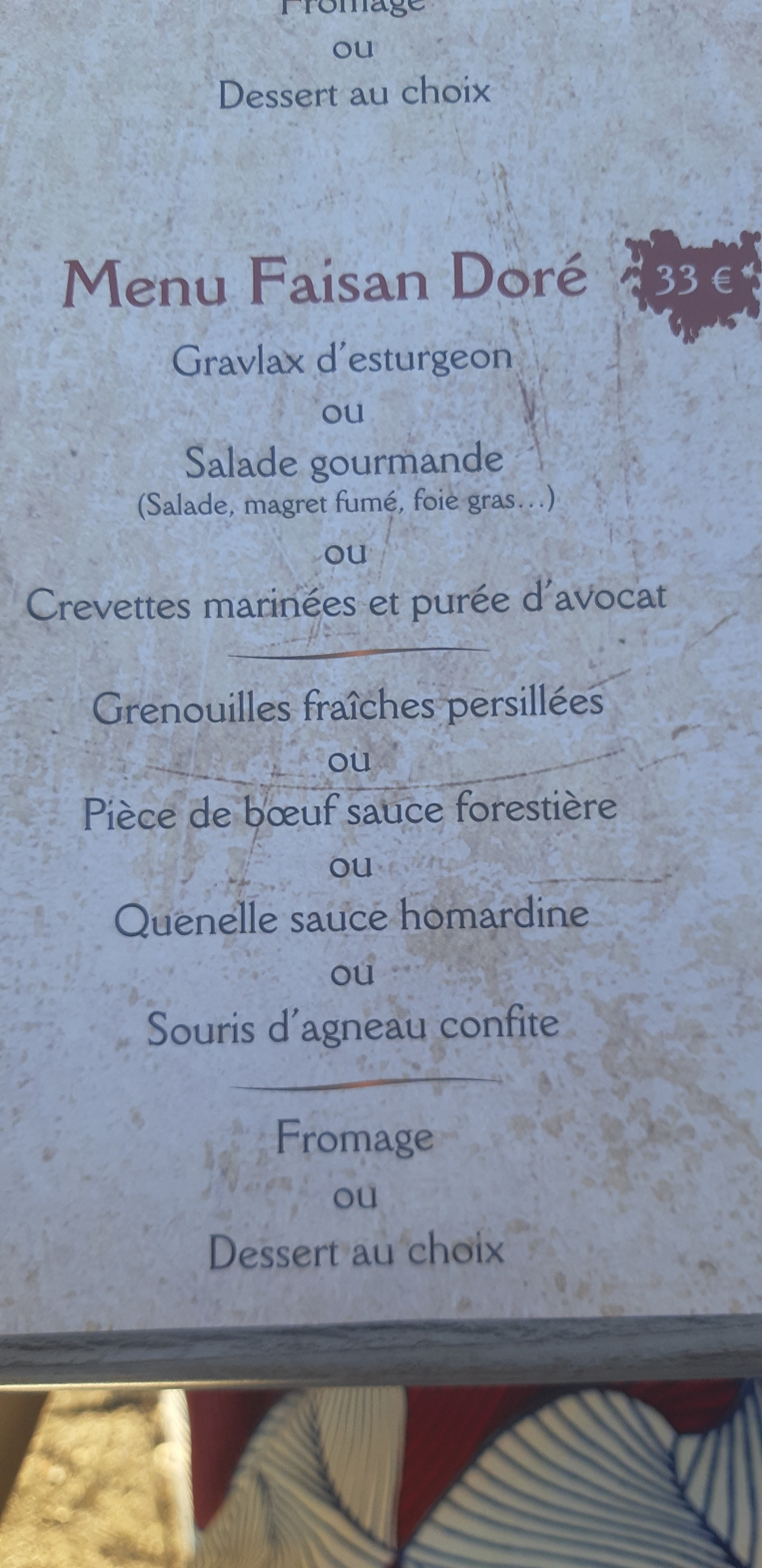 Venu seulement pour manger au restaurant les menus allait de 22 à 33 euros. J'ai prix un menu grenouille avec entrée foie gras+ salade gesier+crème brulé en dessert. Entrée et dessert très bon par contre grenouille un peu fade dommage.