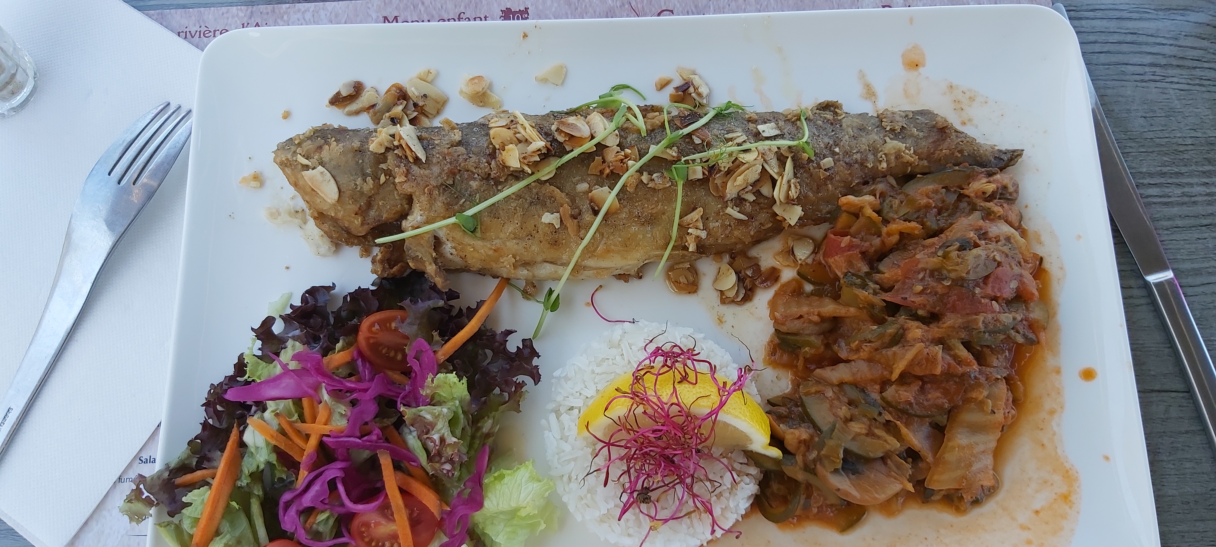 De copieuses salades en entrée, plats et desserts savoureux, tout était bon. Service impeccable et sympathique. Joli cadre, tant en terrasse au bord de l'Ain qu'à l'intérieur. Nous y retournerons.
