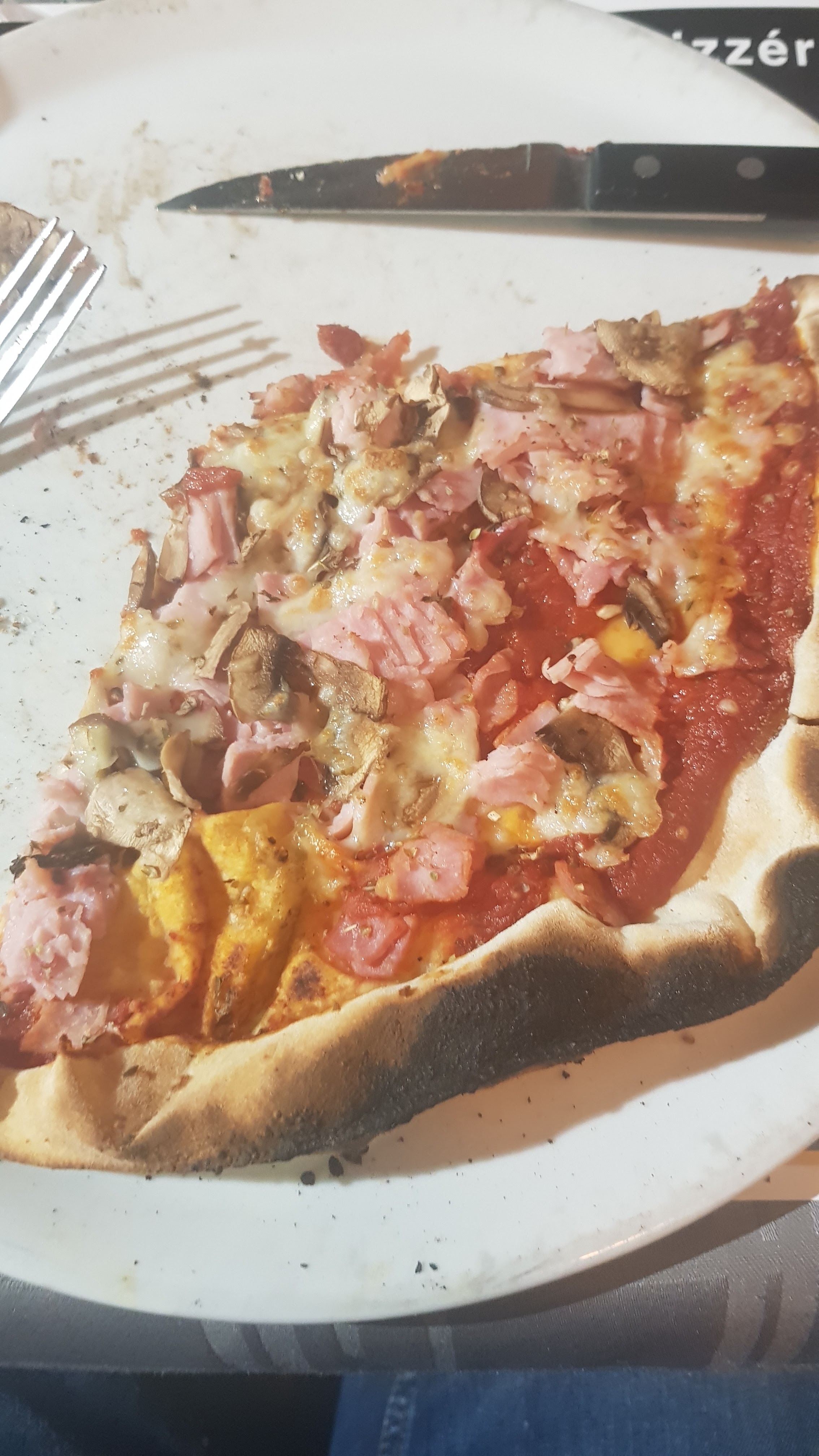 Pâte à pizza fine et croustillante du fait de la cuisson au feu de bois. Les ingrédients de la garniture sont bas de gamme. Voir photo où les carrés prédécoupés de jambon sont encore collés (surgelés ?) Accueil correct sans plus. Un ensemble moyen.