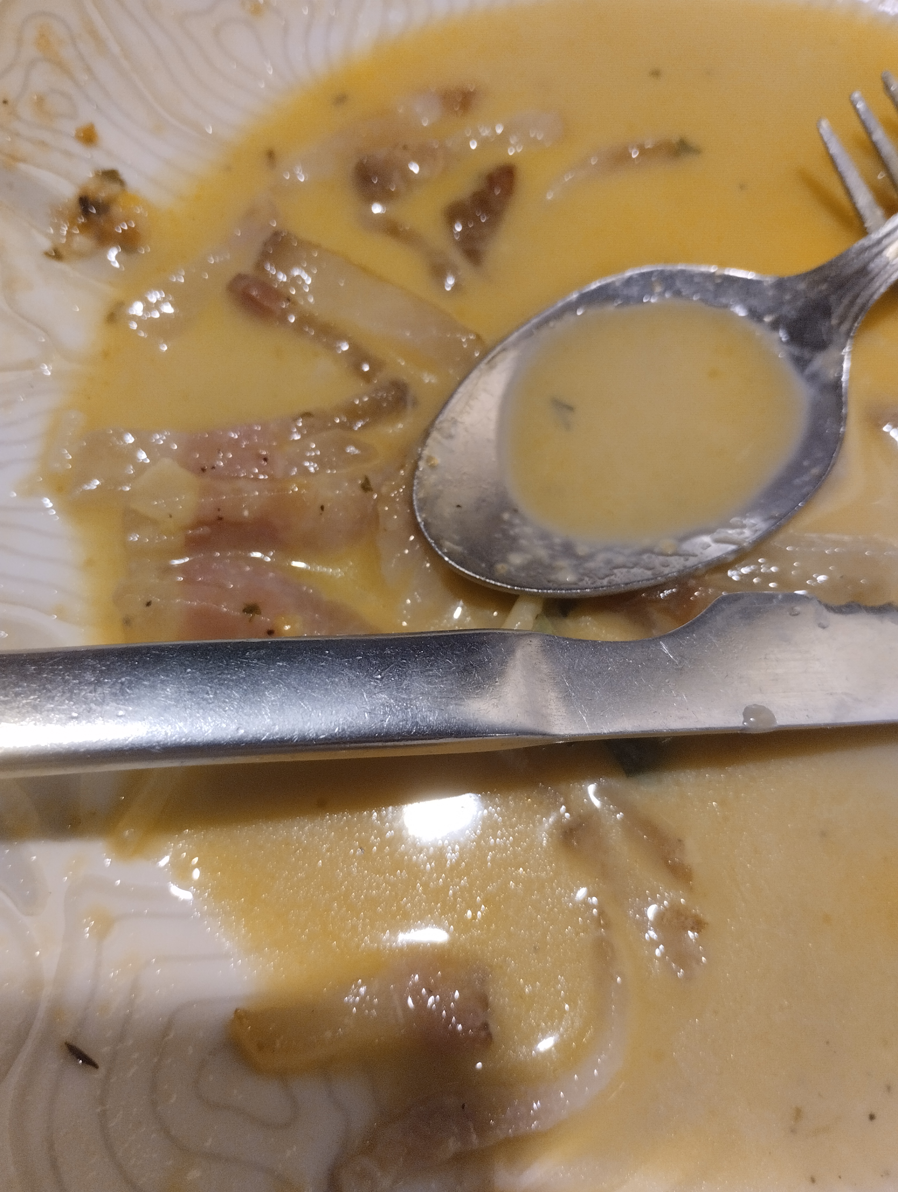 Pate carbo pleine de sauce. La viande c’était du gras cru. Immangeable. Le patron n’a rien voulu savoir au début. Heureusement il ne m’a pas fait payer le plat mais je n’ai pas mangé. J’allais ne rien mettre en com mais comme je vois que je ne suis pas le seul à me plaindre de ce plat, je temoingne pour que d’autre client ne se fasse pas avoir.
