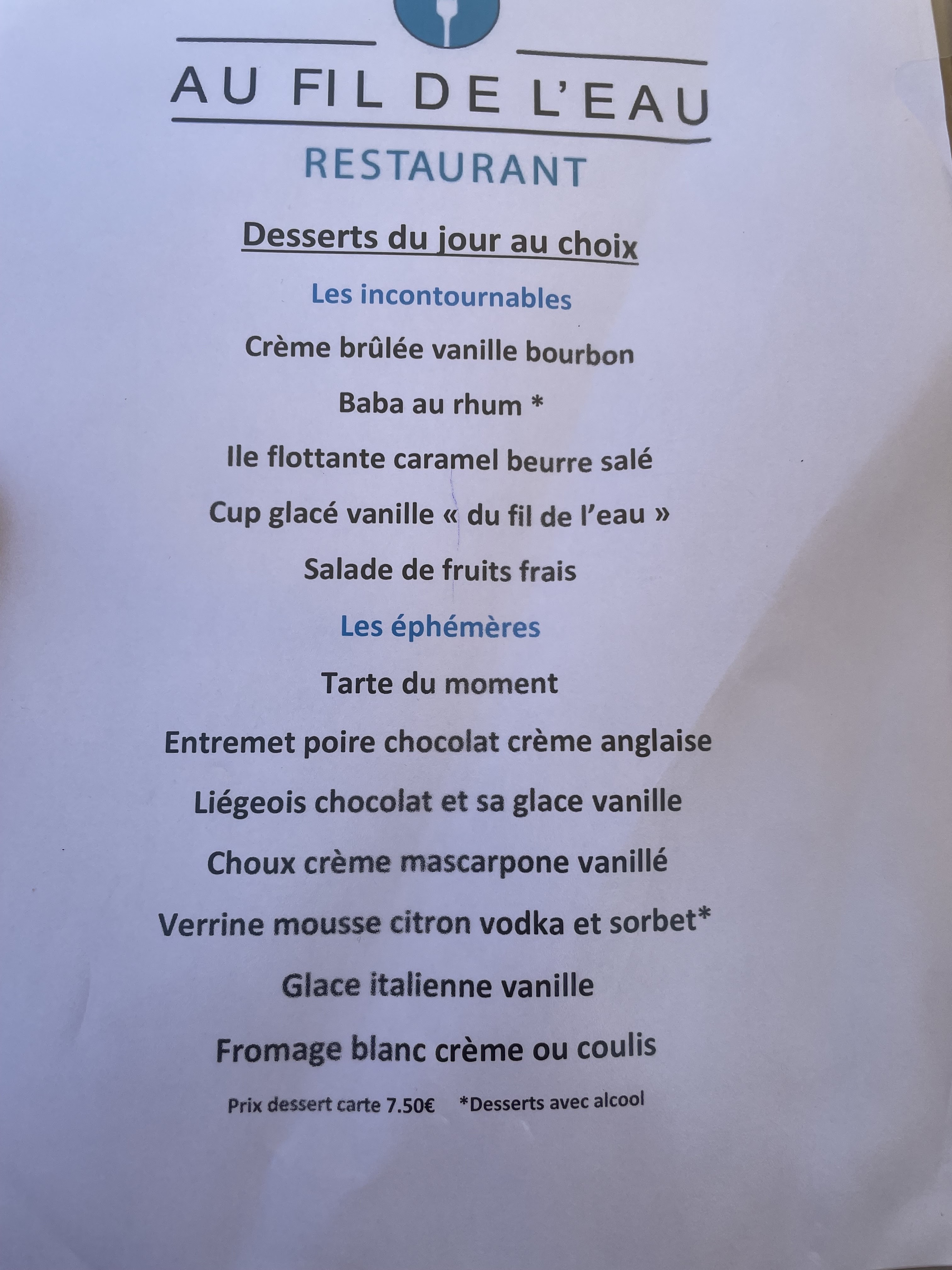 Nous avons mangé Au Fil de l'eau le 24 septembre au soir. Nous avions réservé et avons été très bien accueilli par le jeune serveur. Nous avons pris des cuisses de grenouilles ce fût un plaisir des papilles. Suivi par un dessert mousse au chocolat maison et crème brûlée maison juste une tuerie de délice. Nous conseillons ce lieu. Le chef cuisinier est venu nous voir et nous avons apprécié .Étant camping-caristes nous allons parlé de votre restaurant qui mérite d être connu par ses plats extraordinaires. Bonne continuation au plaisir de revenir