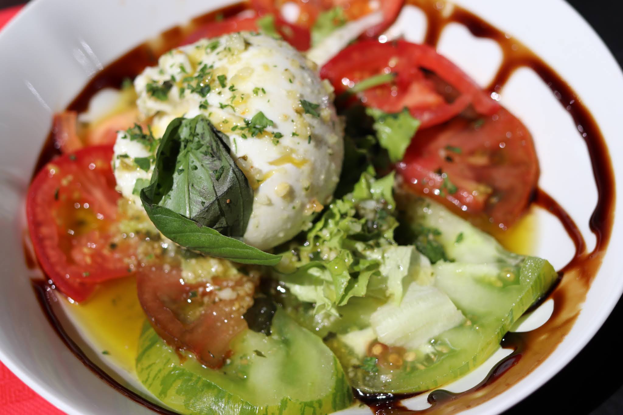 J'ai choisi de fêter mon anniversaire au fil de l'eau. Vous comprendrez pourquoi avec le visuel de mon plat : Mozzarella burrata, méli mélo de tomates, pesto basilic ;)