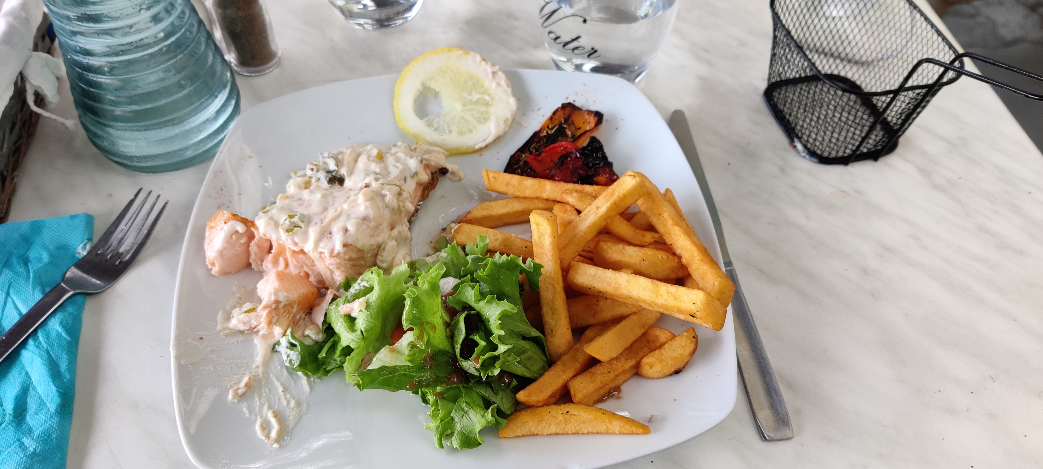 Grande déception, l'espadon était mauvais, dur, sans goût, tel un poisson congelé, les frites étaient également mauvaises.
