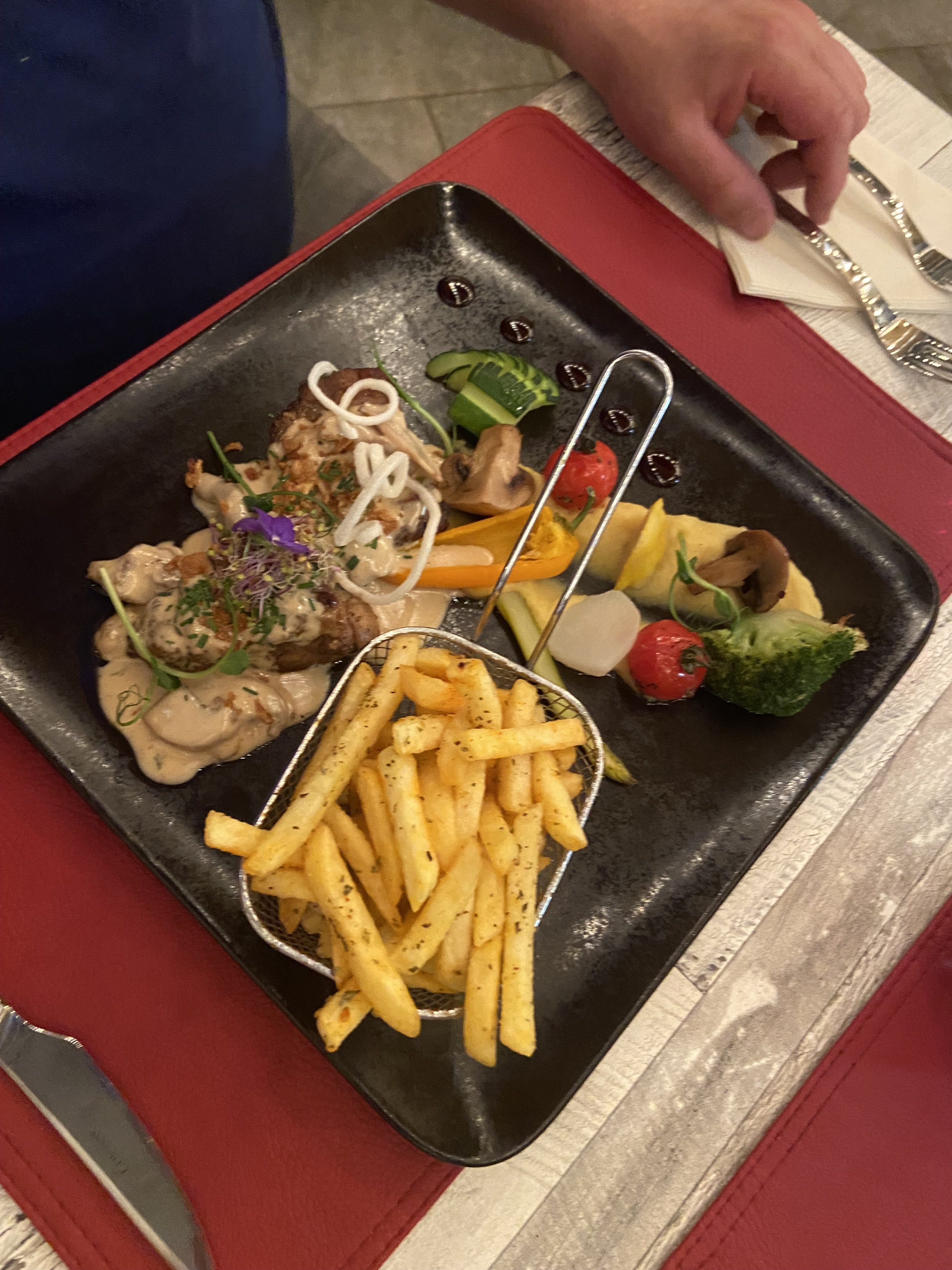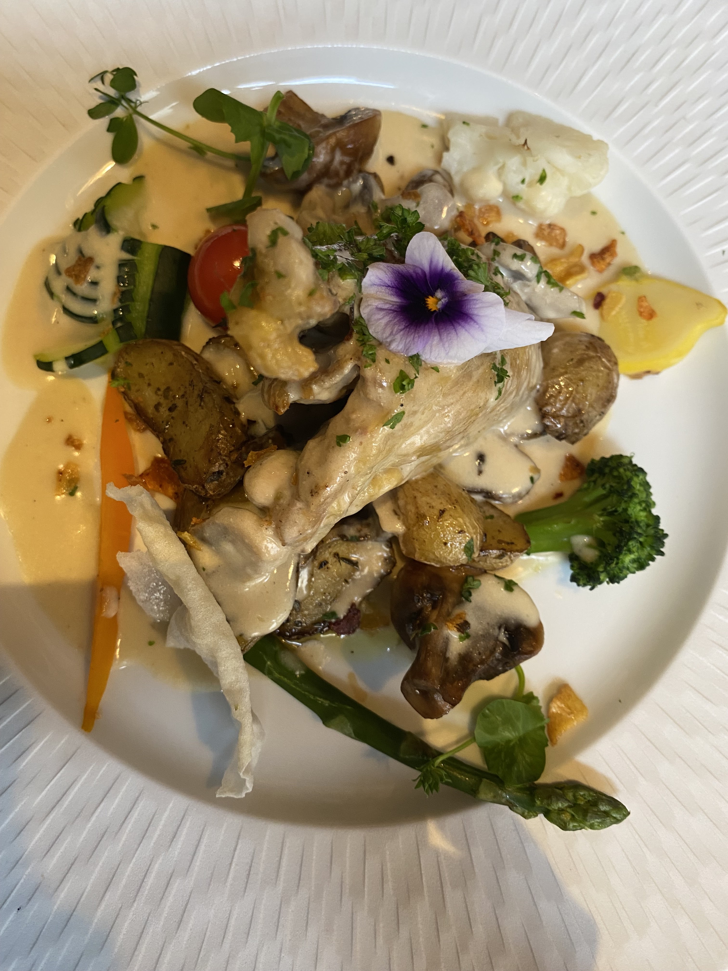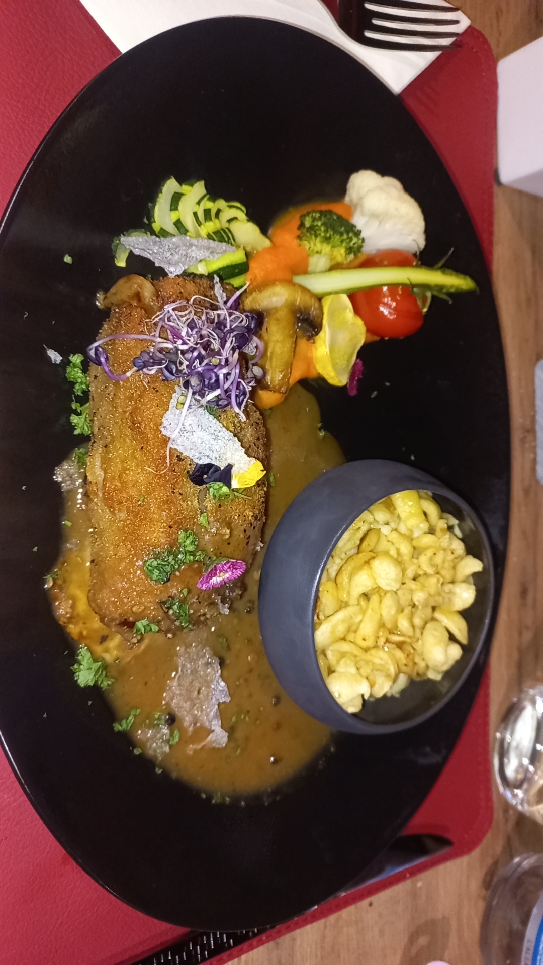 Ayant l’habitude de dîner dans des restaurants proposant une cuisine de qualité (semi gastronomique), j’ai été déçue du rapport qualité prix. Les plats sont bien présentés mais je déplore que l’ont puisse couper une carotte grossièrement en fleur mais que l’ont le coupe pas une pomme de terre pour en faire des frites maison. La portion de foie gras n’était pas généreuse, le foie était mi-cuit (non spécifié) et mal denervé. La cuisson du porc était limite et le cordon bleu bien que généreux était caoutchouteux et la sauce forestière immangeable (sentait très fort le fond de veau) La cuisine correspond plutôt à celle d’un bon restaurant routier mais le prix des plats n’est pas justifié.