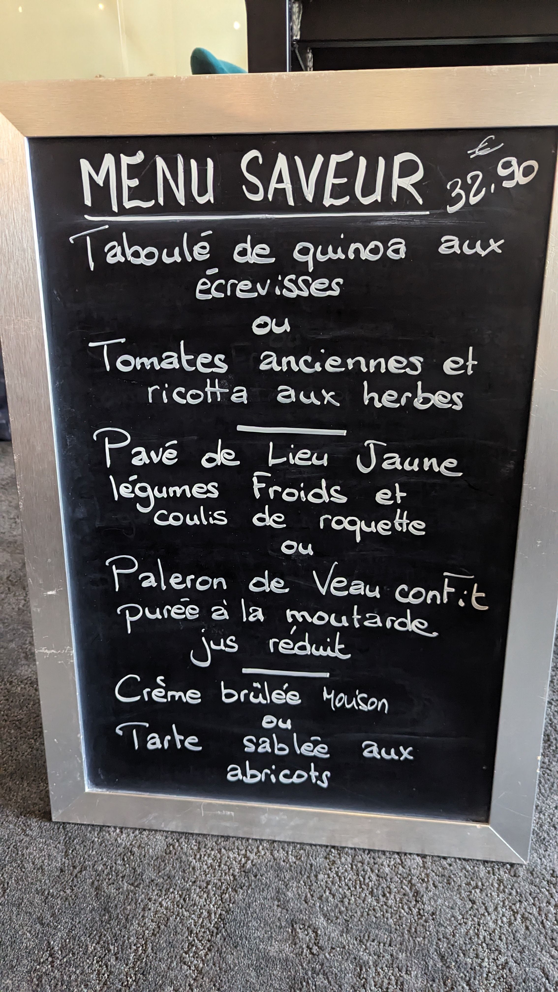 Un menu à 34,90 euros très surprenant par sa qualité : des produits frais, de saison . Je recommande