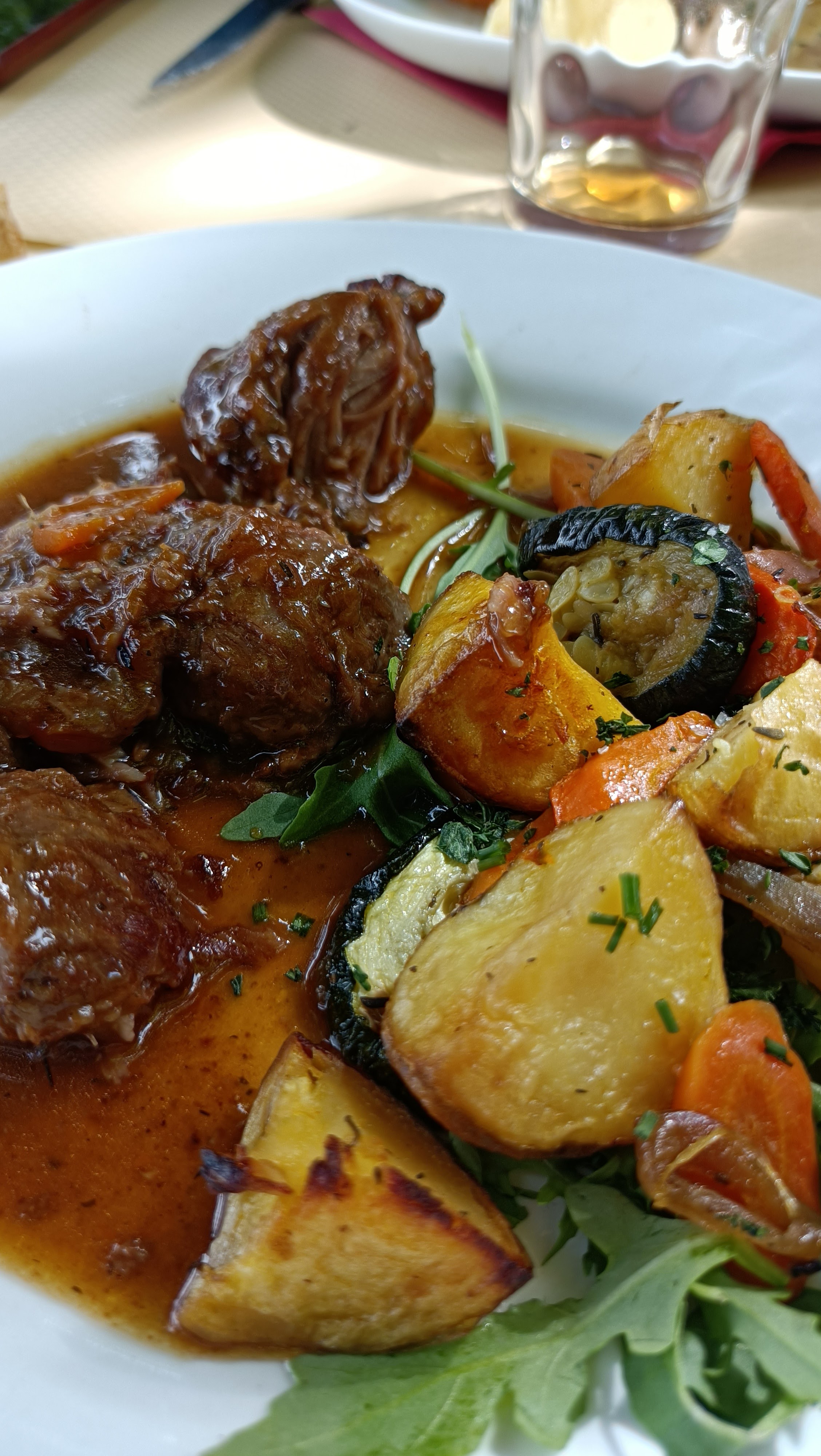 Après avoir été incapables de dîner dans le lieu choisi, nous avons trouvé ce restaurant ouvert et avons été accueillis. Un cadre magnifique dans une vallée de montagne sous des arbres matures, nous avons dégusté un très bon repas joliment présenté par une hôtesse chaleureuse. Ma poitrine de poulet farcie aux asperges et au jambon était savoureuse et tendre avec une aide de légumes rôtis. Nous avons mangé du plat du jour à un prix très raisonnable à 23 euros. Dans l’ensemble, je le recommande vivement.