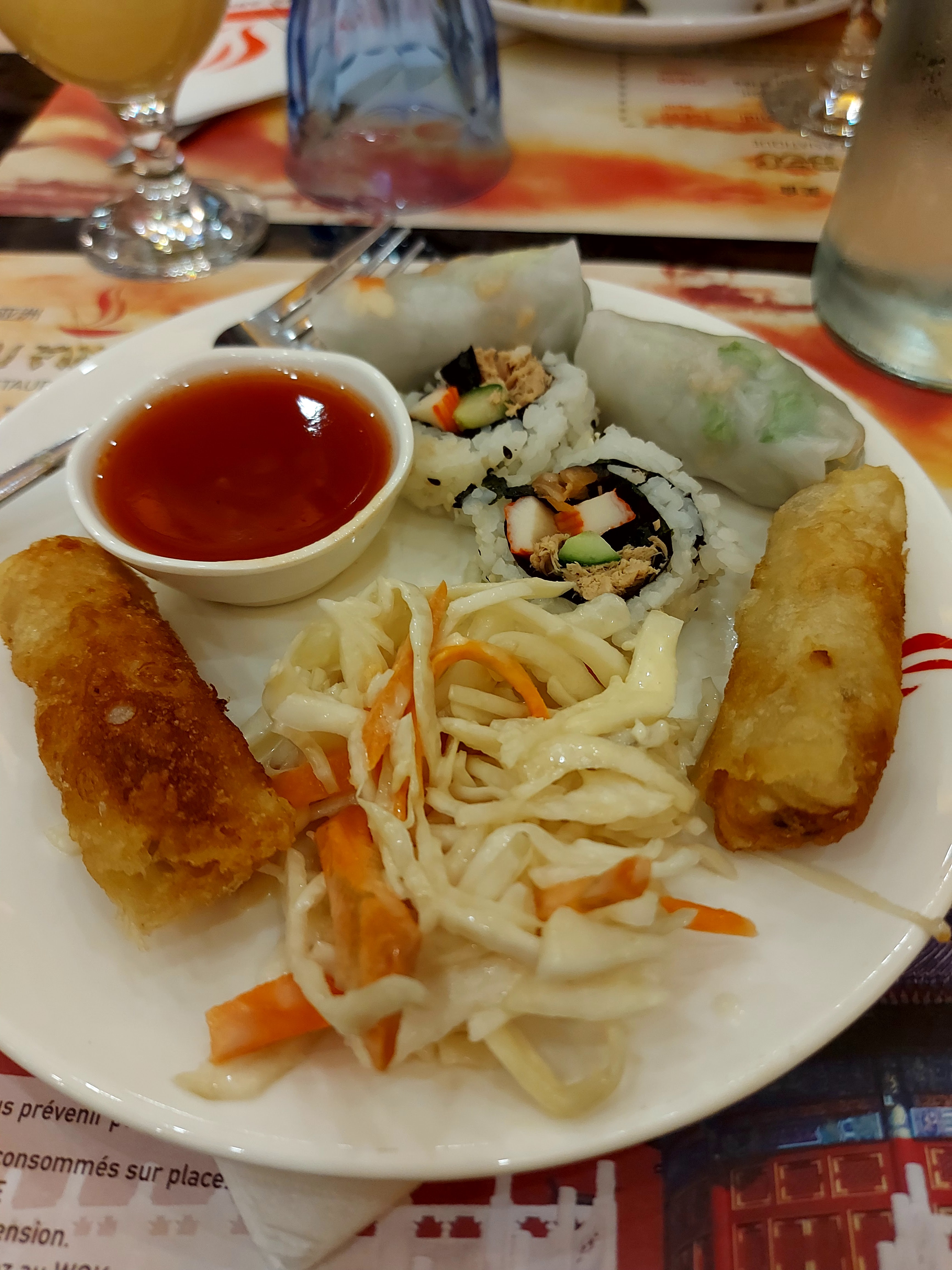 Un beau restaurant mais j'ai trouvé qu'il manquait un peu de choix dans les plats chauds. Et le rouleau de printemps à éviter