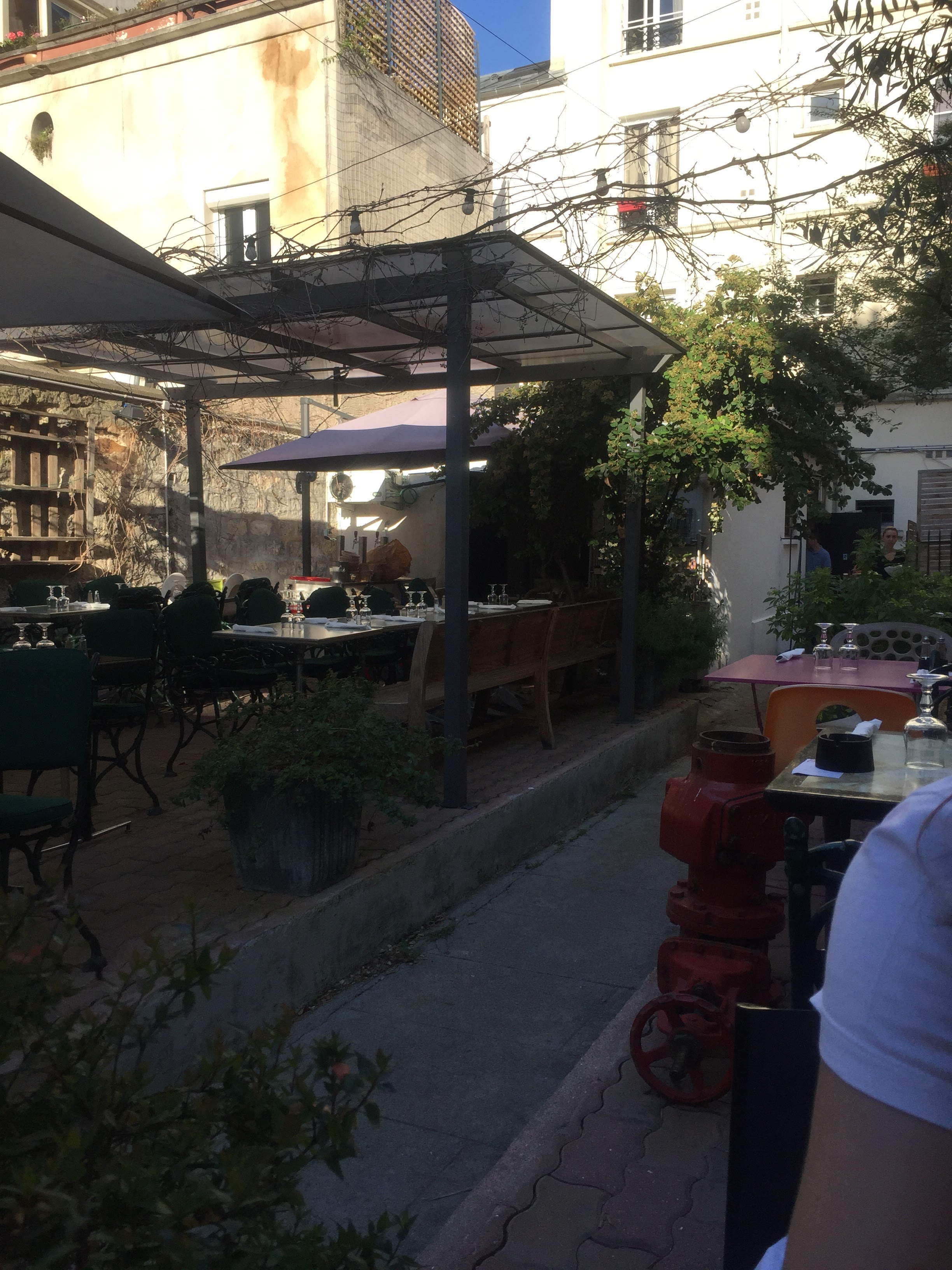 super jardin-terrasse a l'arrière, rare dans le quartier. la deco est aussi agreable a intérieur. très bonnes pizzas et service sympa. un peu déçu par les salade mais peut être juste un mauvais jour.