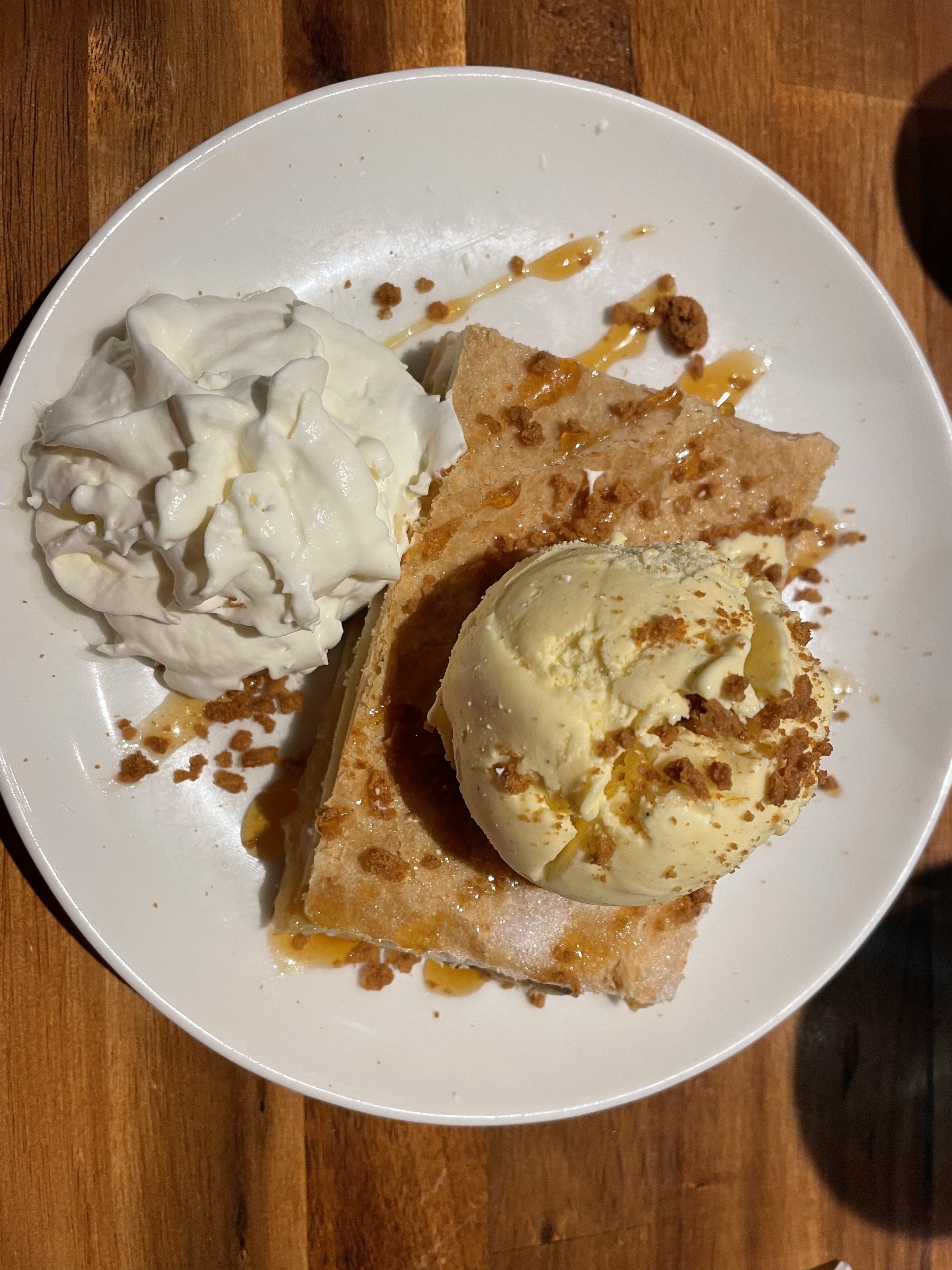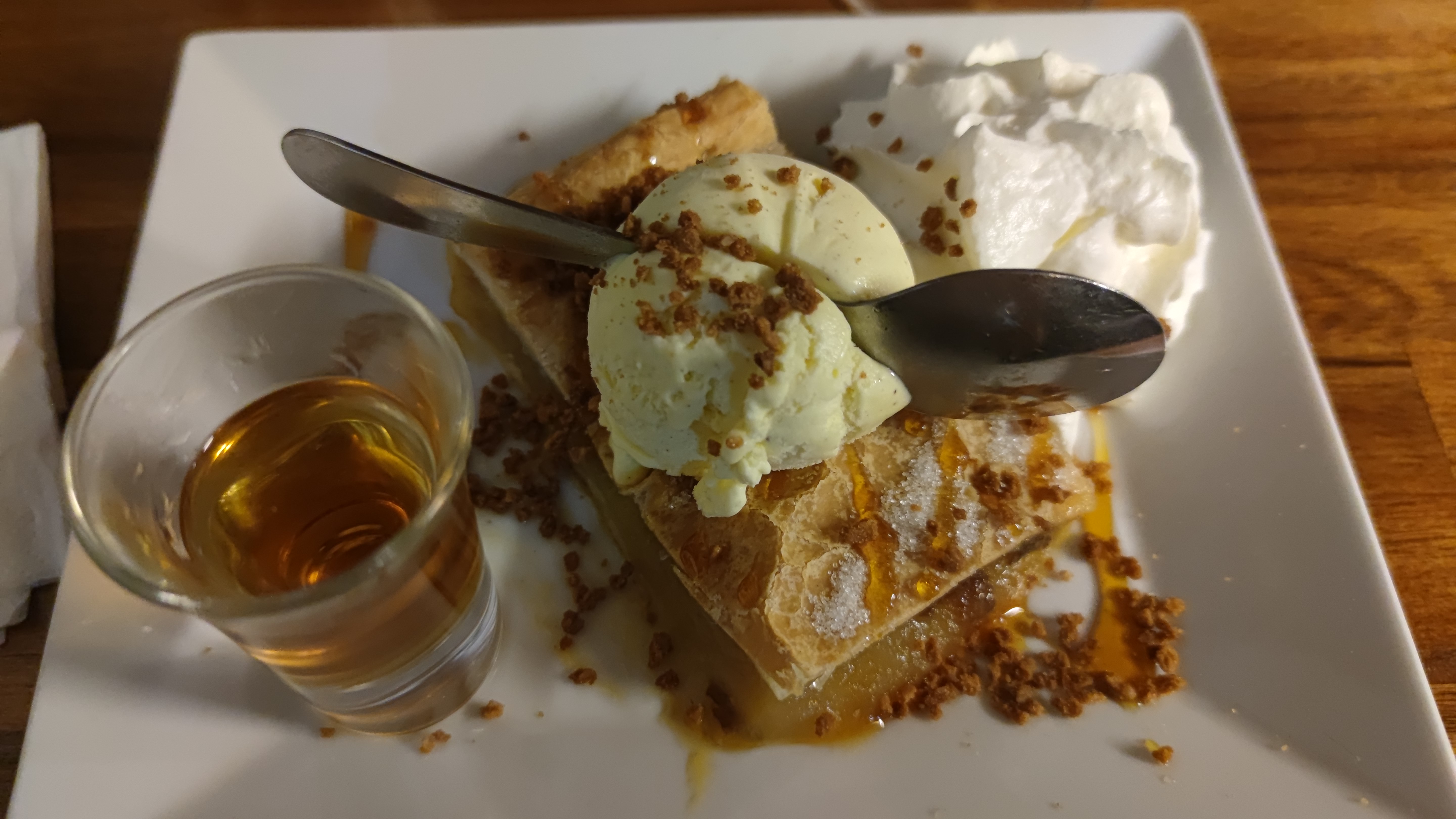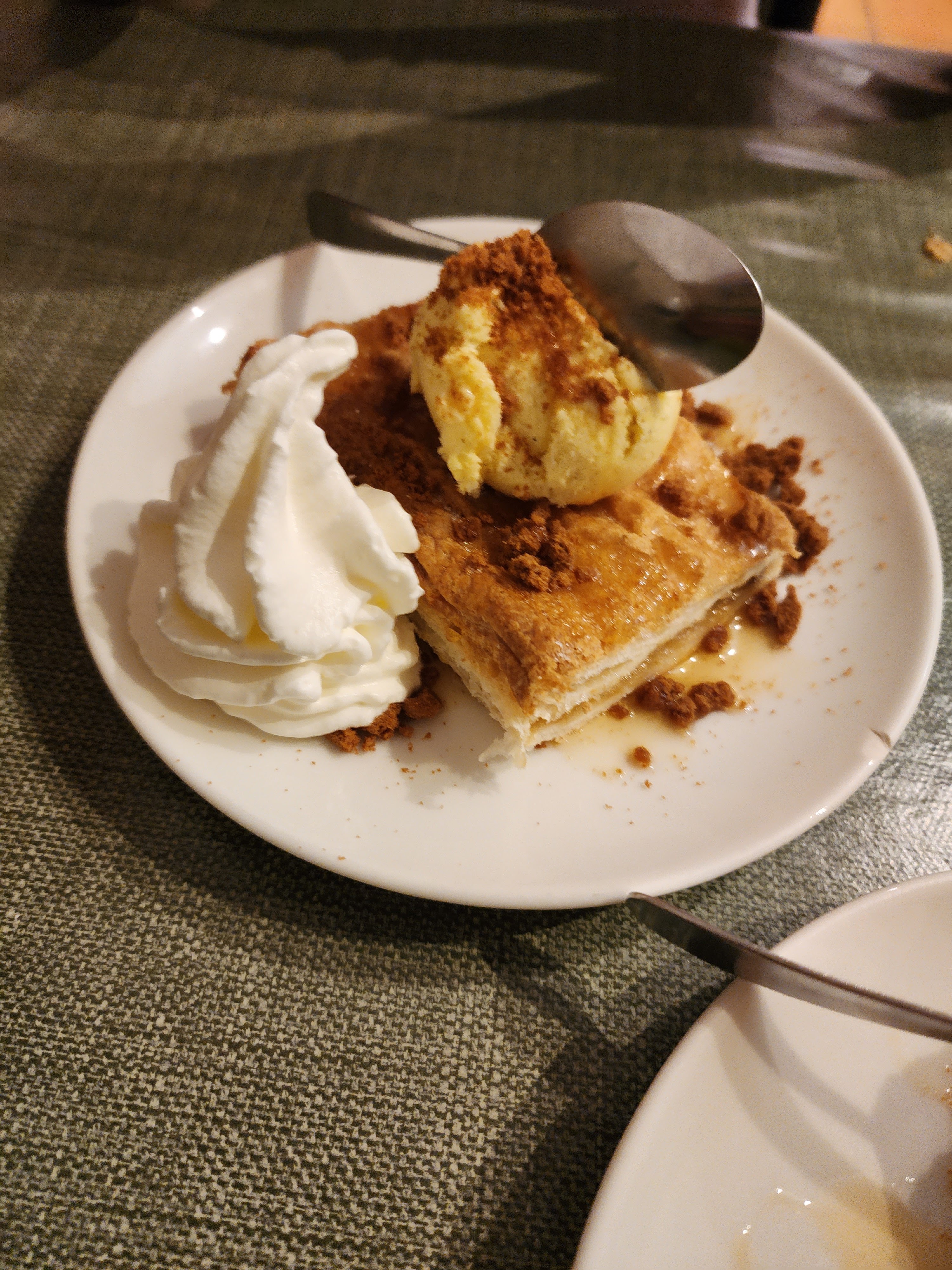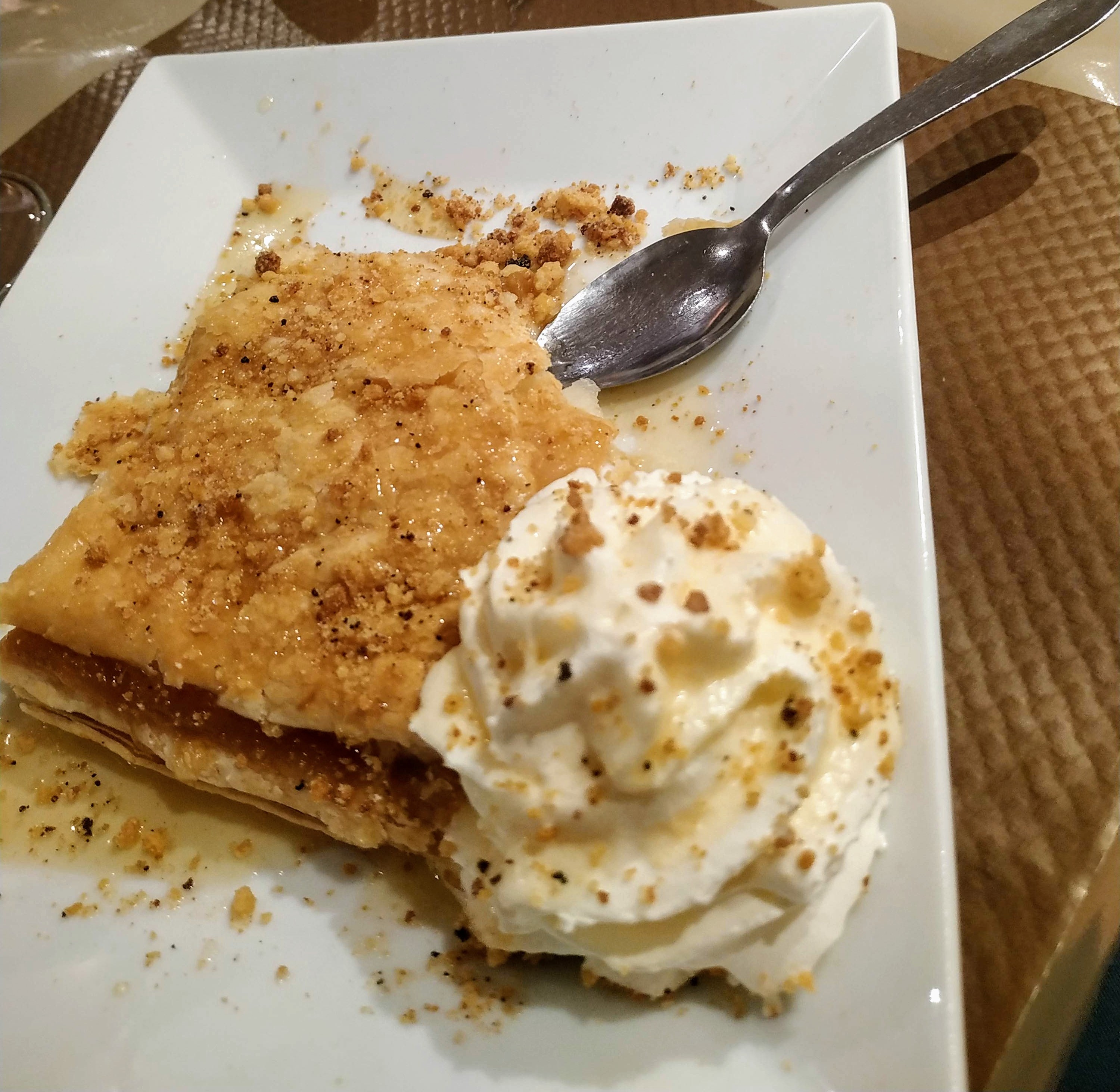 Il n'y a pas de moules dans ce restaurant, c'est un fait... mais heureusement vous ne venez pas pour ça : Salade avec foie gras parfaitement préparée (vraie texture de vrai foie gras) Cassoulet au top, conforme à mes attentes en qualité et quantité ! (si vous le finissez il y a moyen de négocier une surprise !) Mon jeune a testé le Hambur'Gers, et a spontanément indiqué la bonne expérience (rare de sa part) Il faut également tester la Croustade du Chef, un regal, servi de plus avec un Armagnac bien utile... Je n'ajouterai pas de photos (sauf la Croustade), tout y est déjà et en mieux... J'ajouterai par contre un gros plus pour le personnel : serveur très à l'écoute et aux petits soins, y compris dans les exigences les plus incongrues pour les boissons, et chef de cuisine très discret (mériterait d'être rencontré). Que dire : avec également un tarif très mesuré, l'expérience est un vrai bonheur, pourvu que ça dure !!