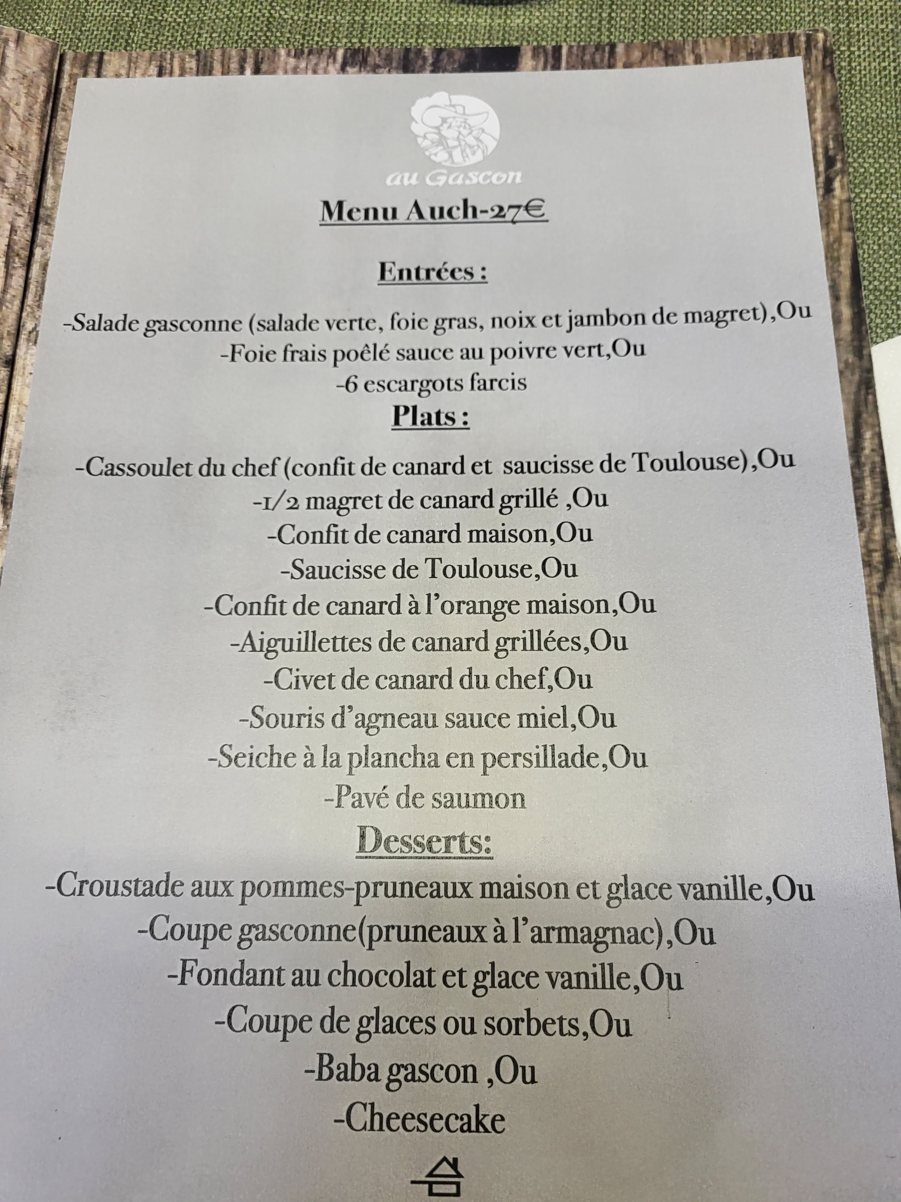Contrairement à notre habitude, nous avons pris le menu Auch. Il faut bien changer un peu. C'est super. Beaucoup de choix, kir en apéro et même le petit verre d'Armagnac. Service rapide. Toujours très bien.