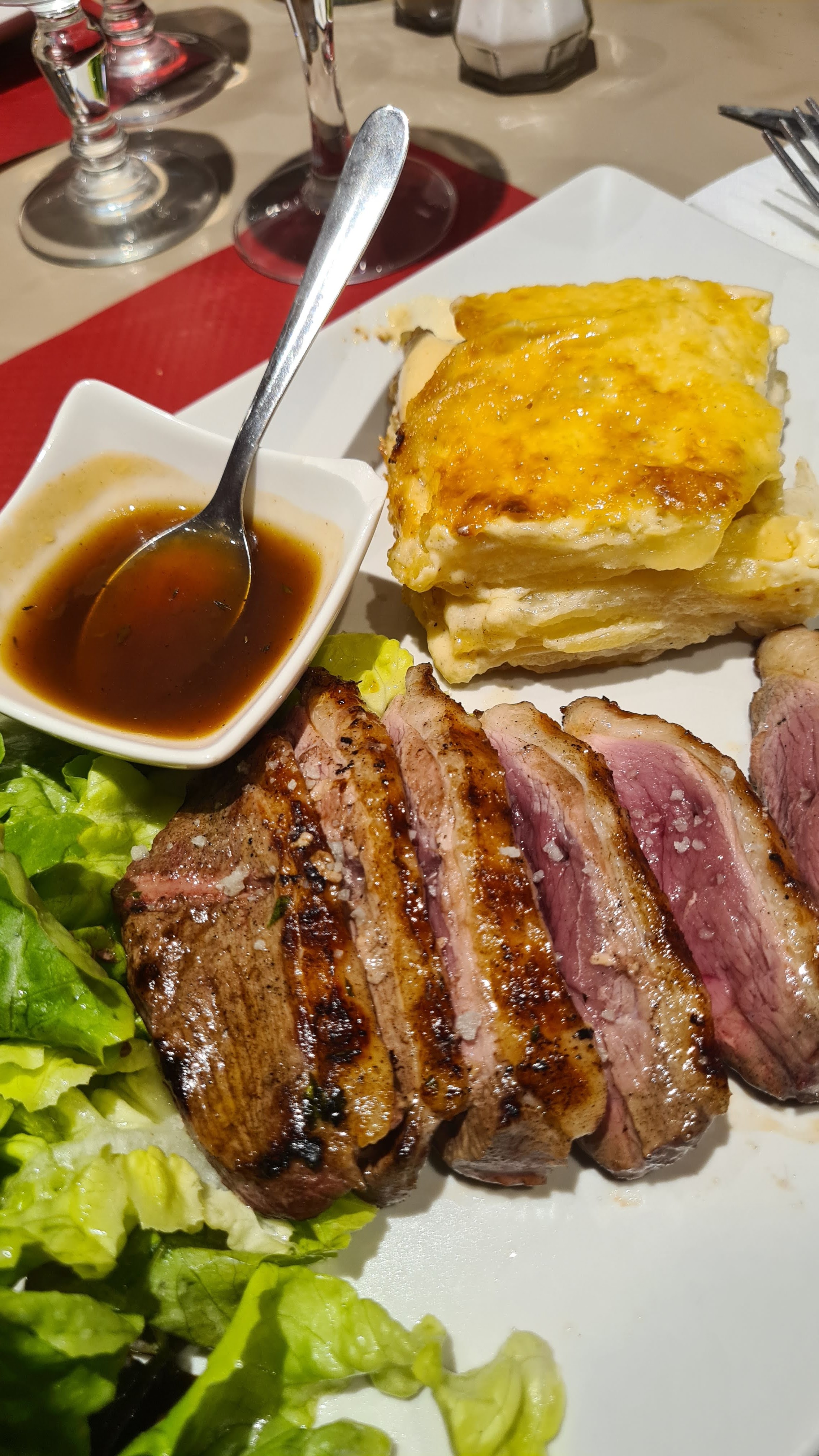 Pour ma part ma commande étais de l'onglet et la viande étais tendre avec un bon goût accompagné avec une sauce fromagére (manquait de gout) et des pommes de terre excellent je recommande fortement ce plat.