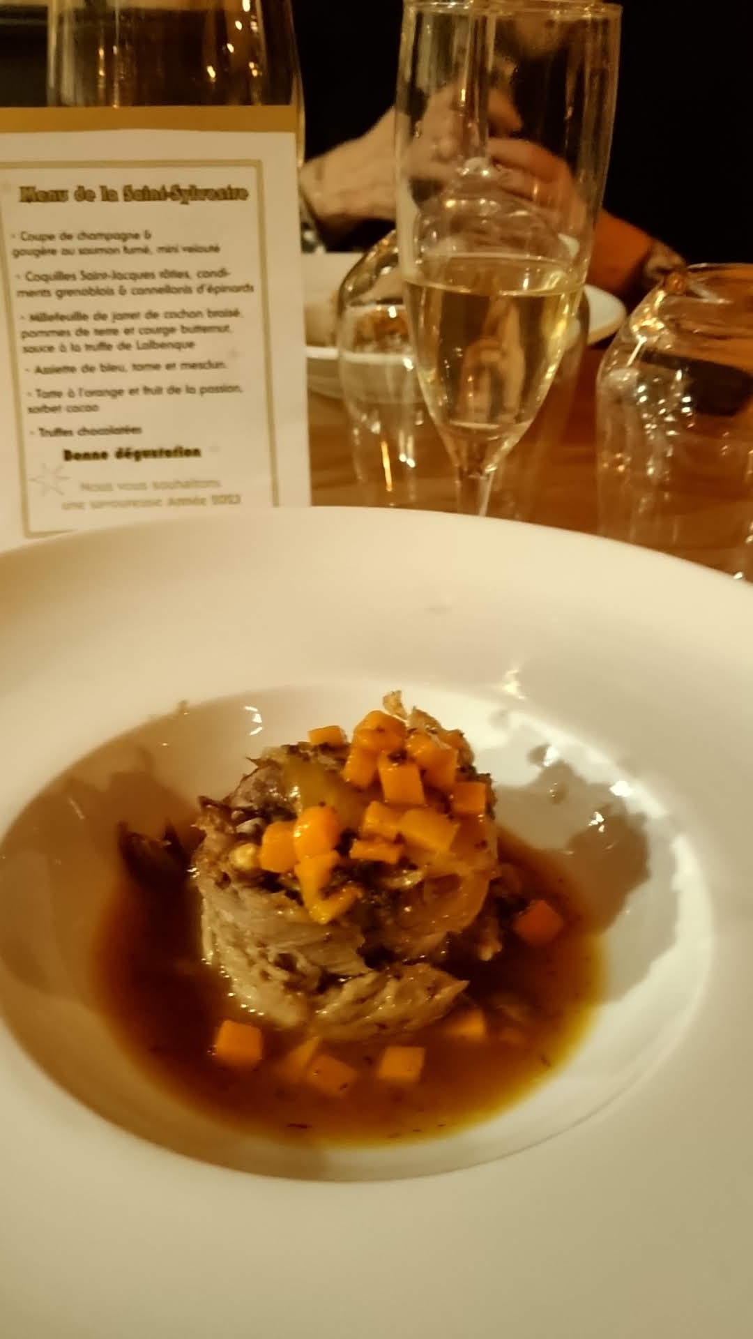 Un dîner de réveillon mémorable: menu raffiné, portions équilibrés, un savoir-faire, une maîtrise exceptionnelle de A à Z. On se souviendra des Coquilles Jacques rôties, condiments grenoblois & cannelloni d'épinards et du Millefeuille de jarret de cochon braisé et pommes de terre + courge butternut, sauce à la truffe de Lalbenque Tarte à l'orange et fruit de la passion, sorbet cacao Et pour cela, pas du tout besoin de faire sauter Lalbenque!!!