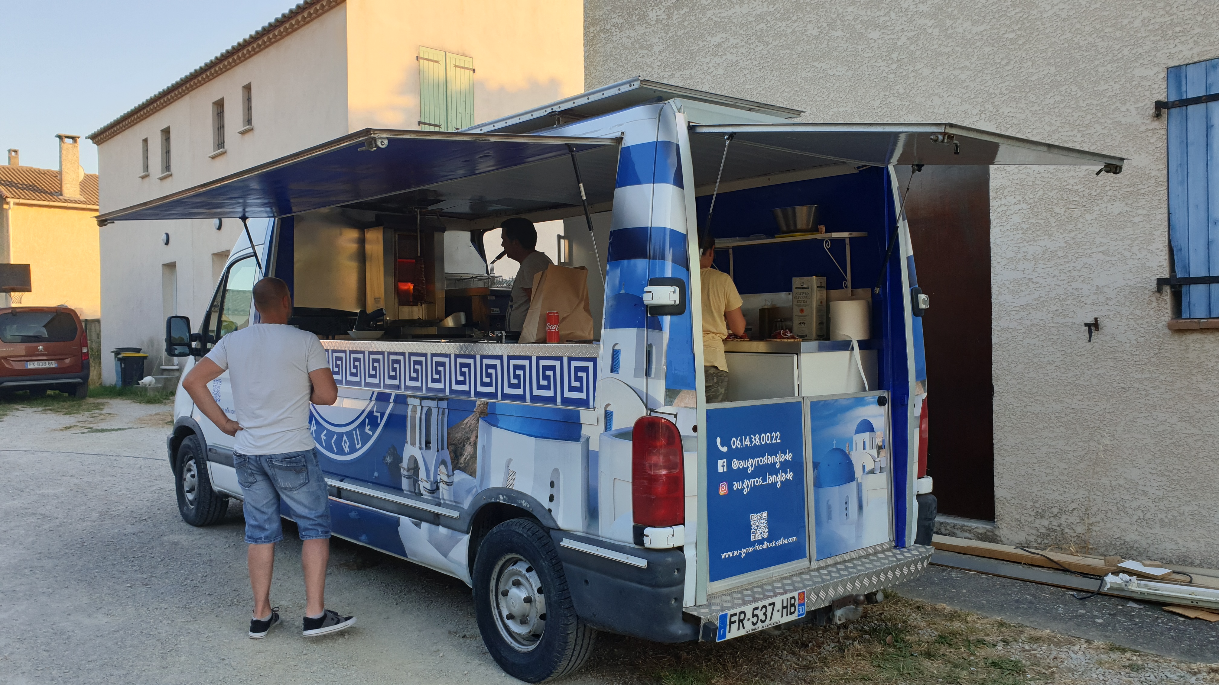Le camion spécialisé dans la nourriture grecque est garé sur le parking de langlade à côté de la pharmacie. Le patron est dynamique et très communiquant. C’est lui-même qui fait son gyros et il ne tarit pas d’éloges sur son produit. Les produits sont absolument frais. Le gyros est excellent. La clientèle est au rendez-vous. Les habitués passent leur commande par téléphone.