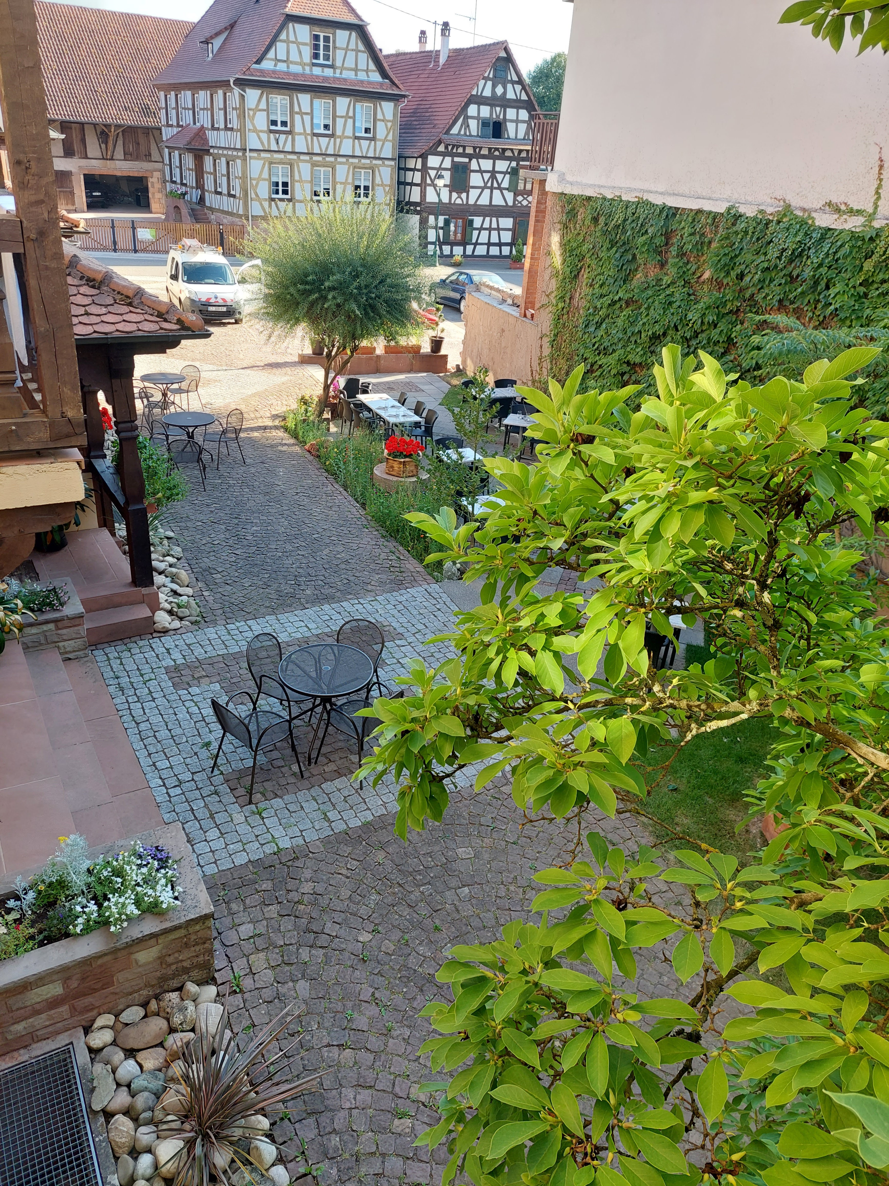 Très belle maison à colombages. Il y a un petit coin salon à l'extérieur, mais pas une très belle cour. L'hôtel, comme toute la zone frontalière, est un peu hors du temps ; on a l'impression d'être transporté vingt ans en arrière. Mais les gens sont gentils, le petit déjeuner est copieux et les lits étaient bons.