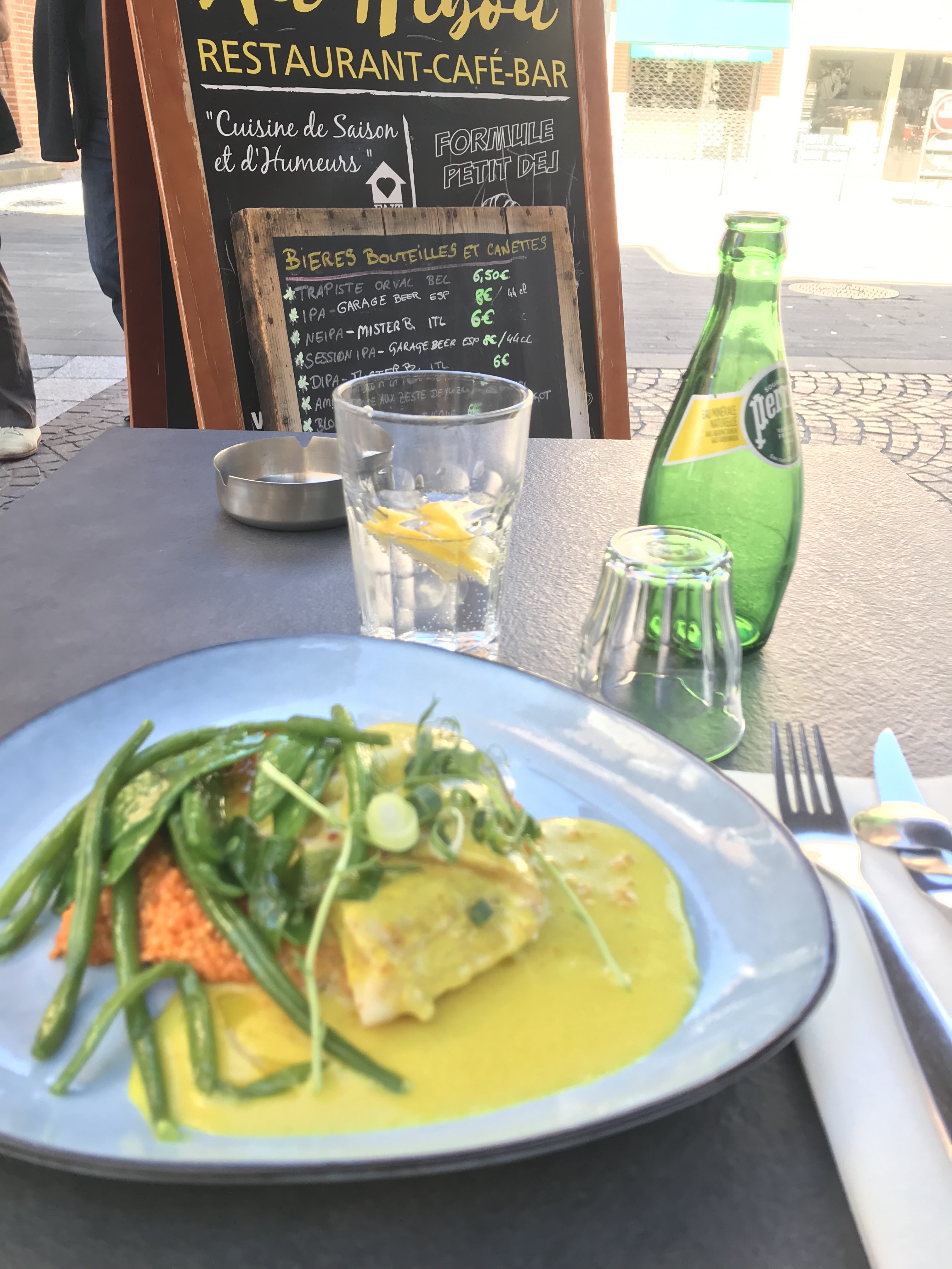 Plat du jour excellent : filet de lieu avec purée d'agates à la moutarde à l'ancienne ..c'était délicieux. Prix corrects. Et en plus, terrasse sympa à côté du marché couvert 😎