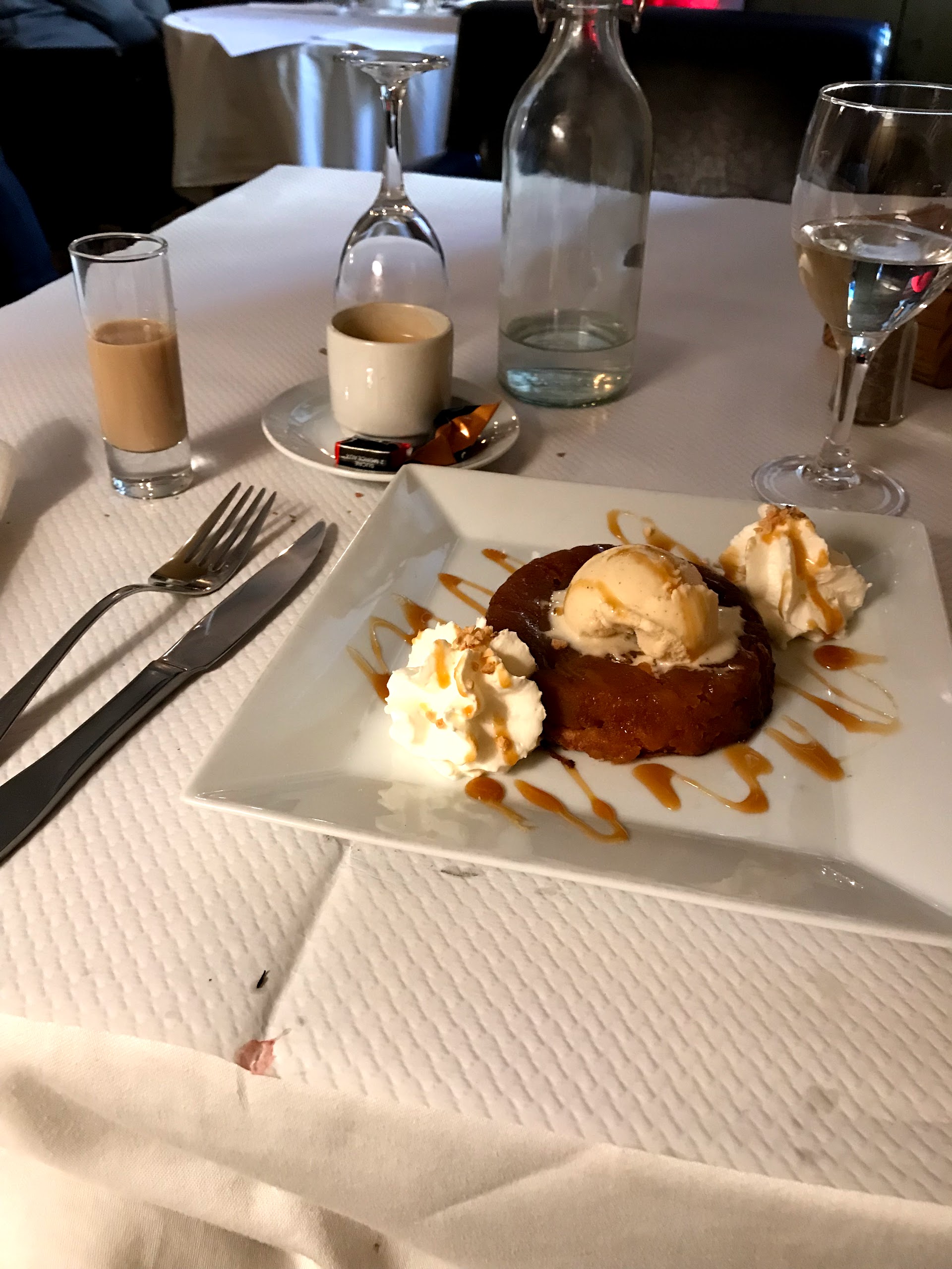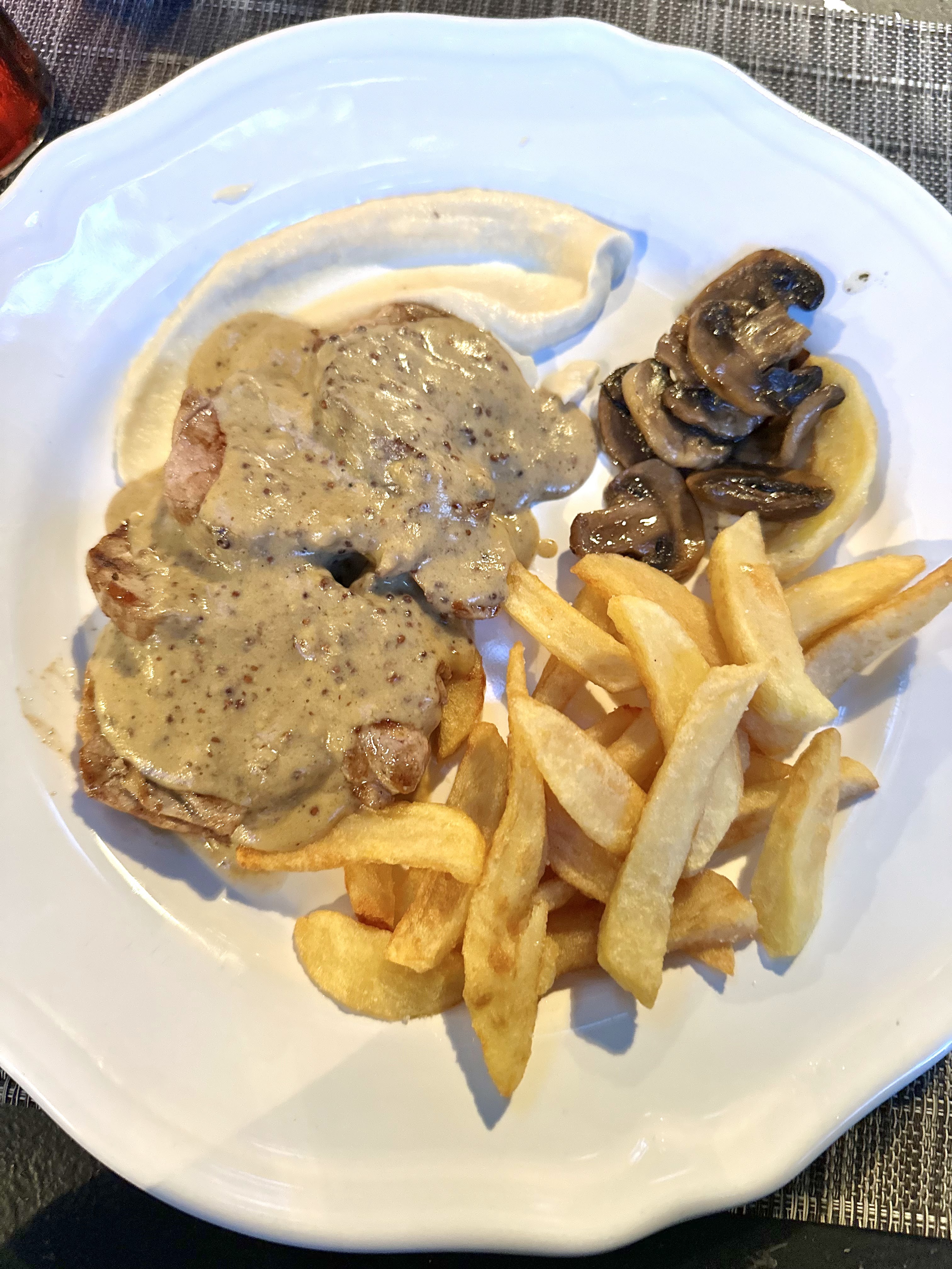 La nourriture est assez délicieuse (notamment le magret de canard). Le prix un peu élevé, surtout si l'on parle de bière, comme dans tout le pays voisin, ce qui me semble fou. Nous avons dû demander de l'eau trois fois pour qu'ils nous la donnent, presque aussitôt que nous sommes arrivés aux desserts.