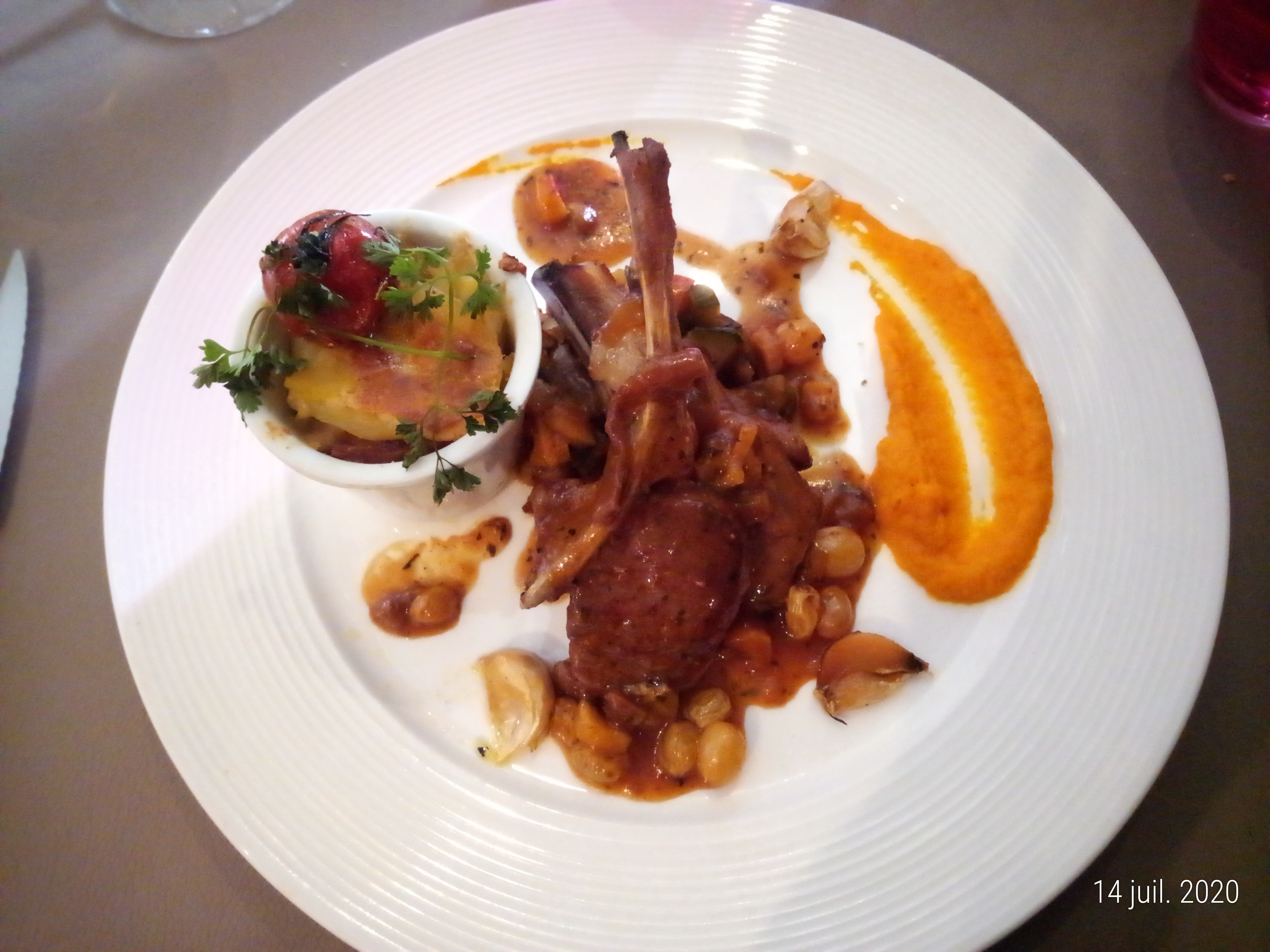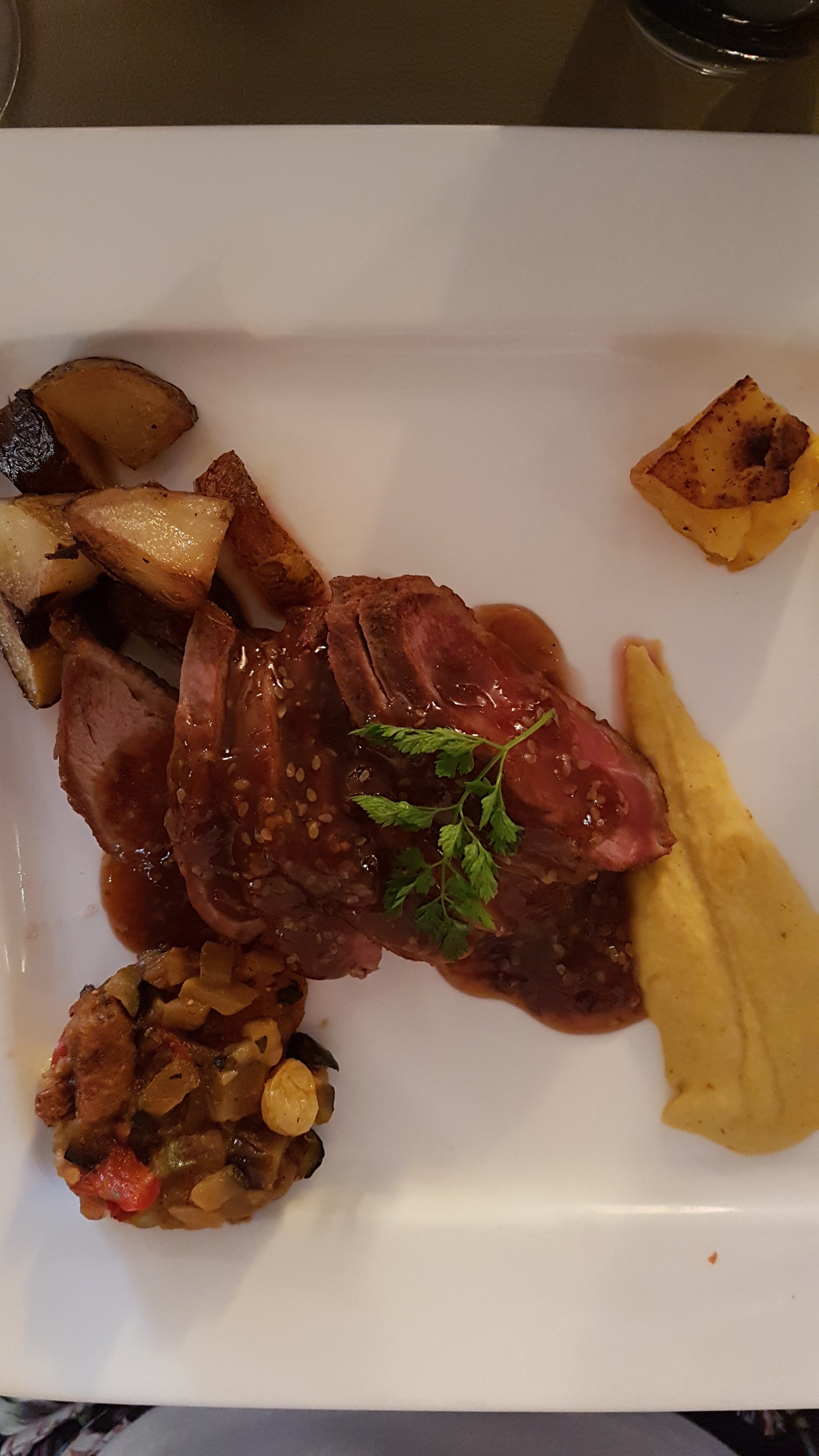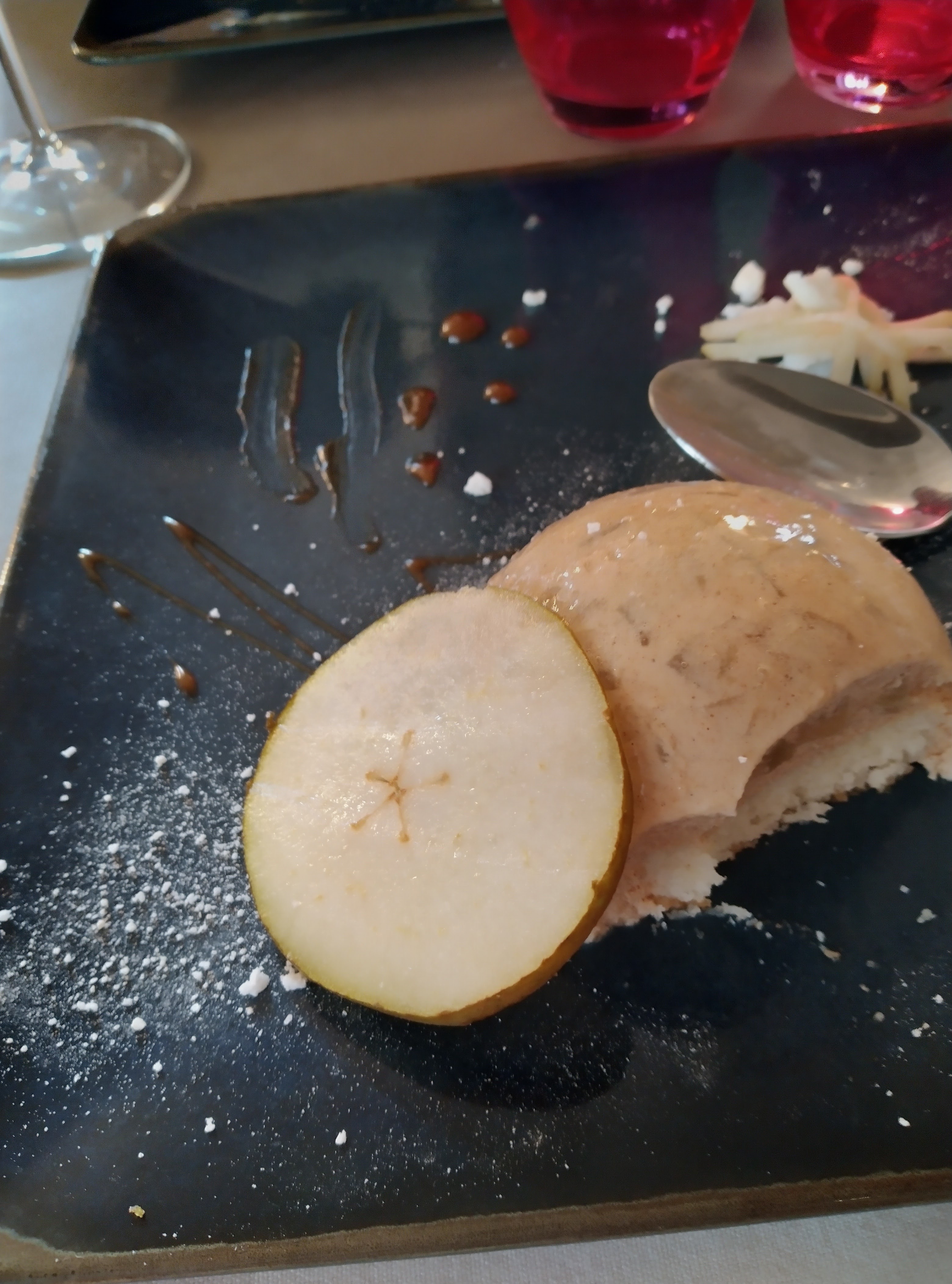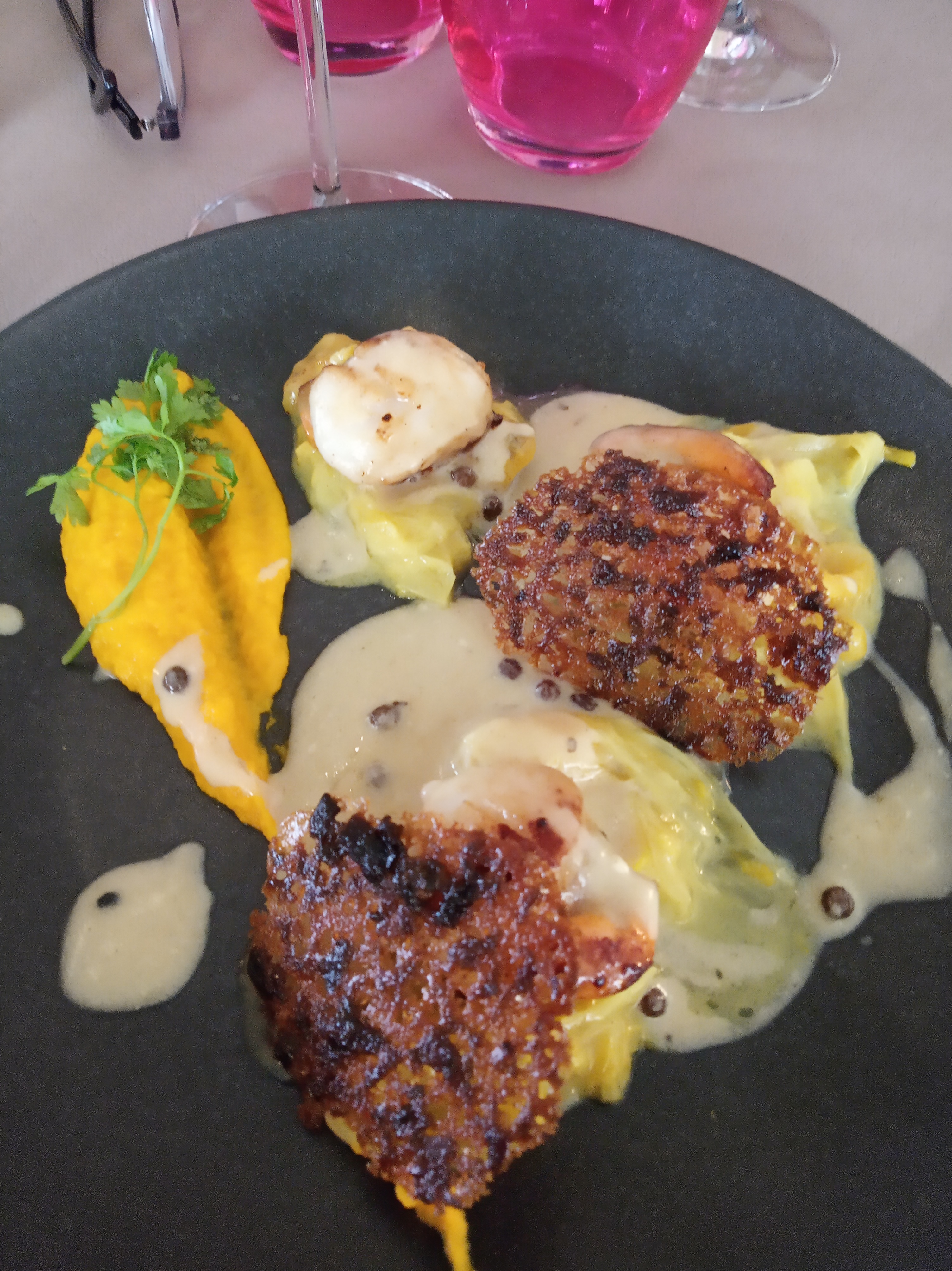 Tout est parfait accueil décoration et surtout quel régal et cette petite touche a l apéritif une petite verrine de consommé potiron patate douce ...... Ce que mes papilles ont détectées