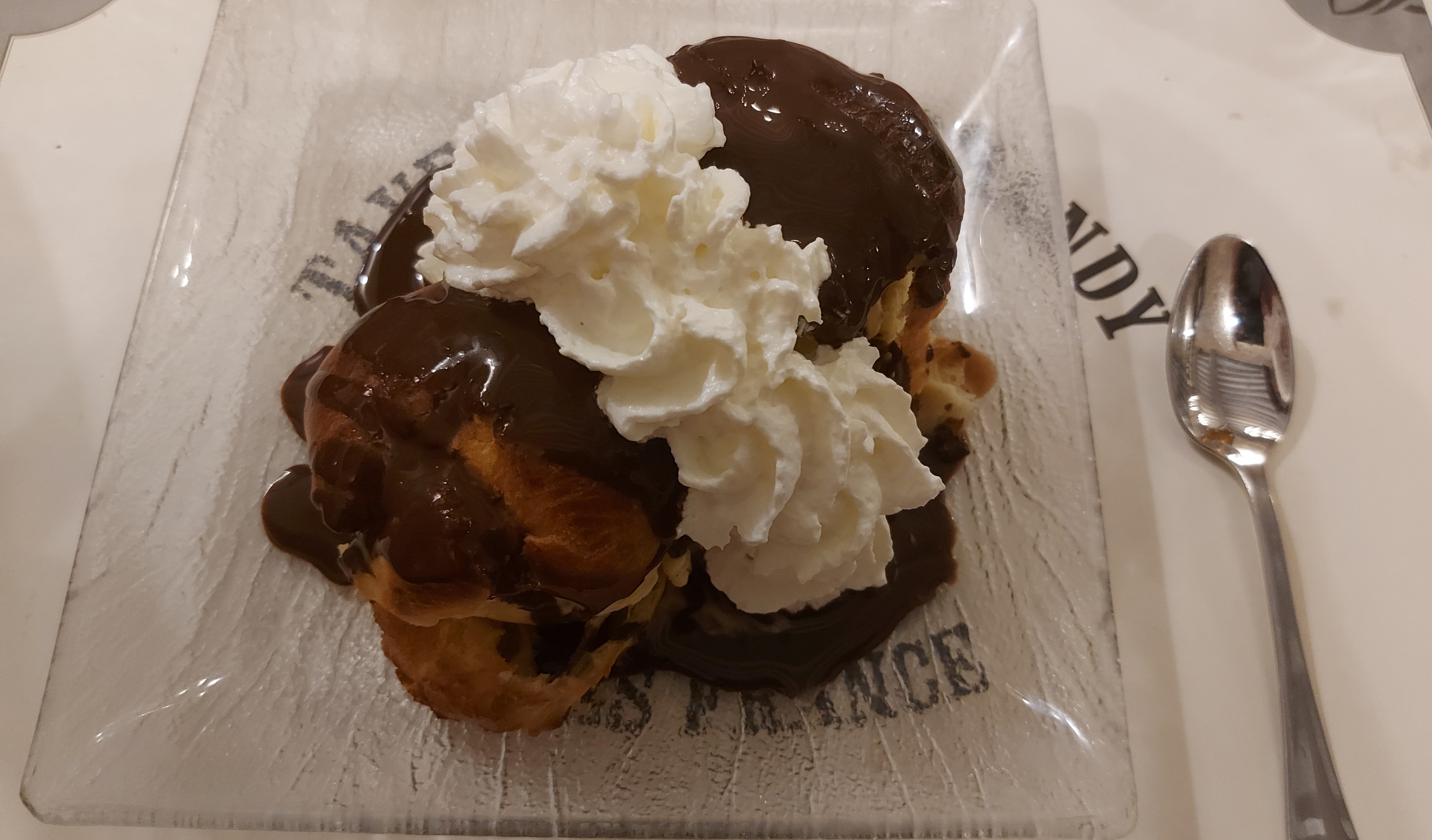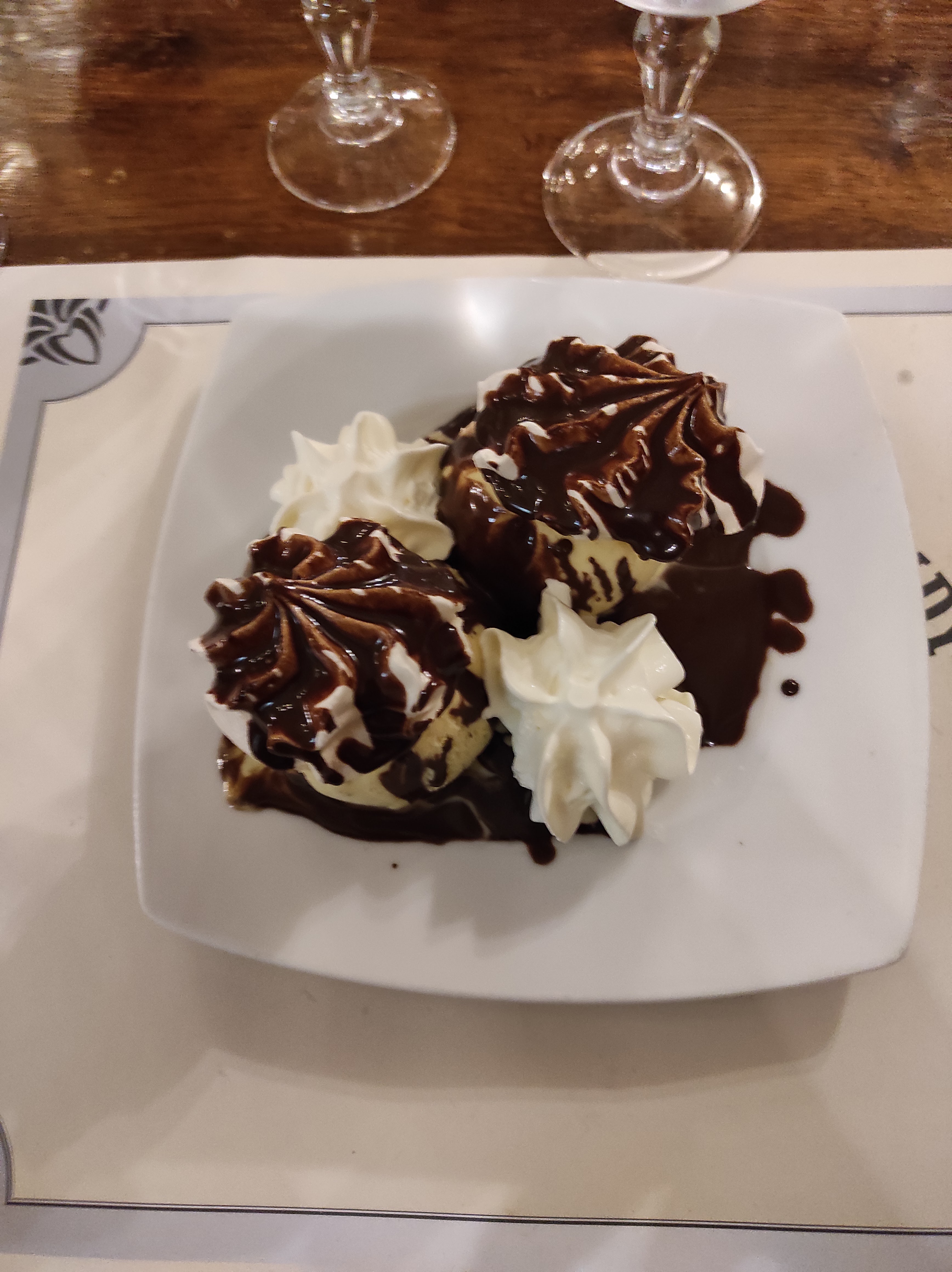 Très belle entrée avec un pain brioché au saucisse avec sa fine touche de salade qui donne de la fraîcheur Un plat, avec un beau pavé de cabillaud accompagné de pom vapeur à la crème Un beau dessert avec une double crème vanille chocolat accompagné d’un chantilly fouetté. Des serveurs à l’écoute, Très bon repas et très abordable