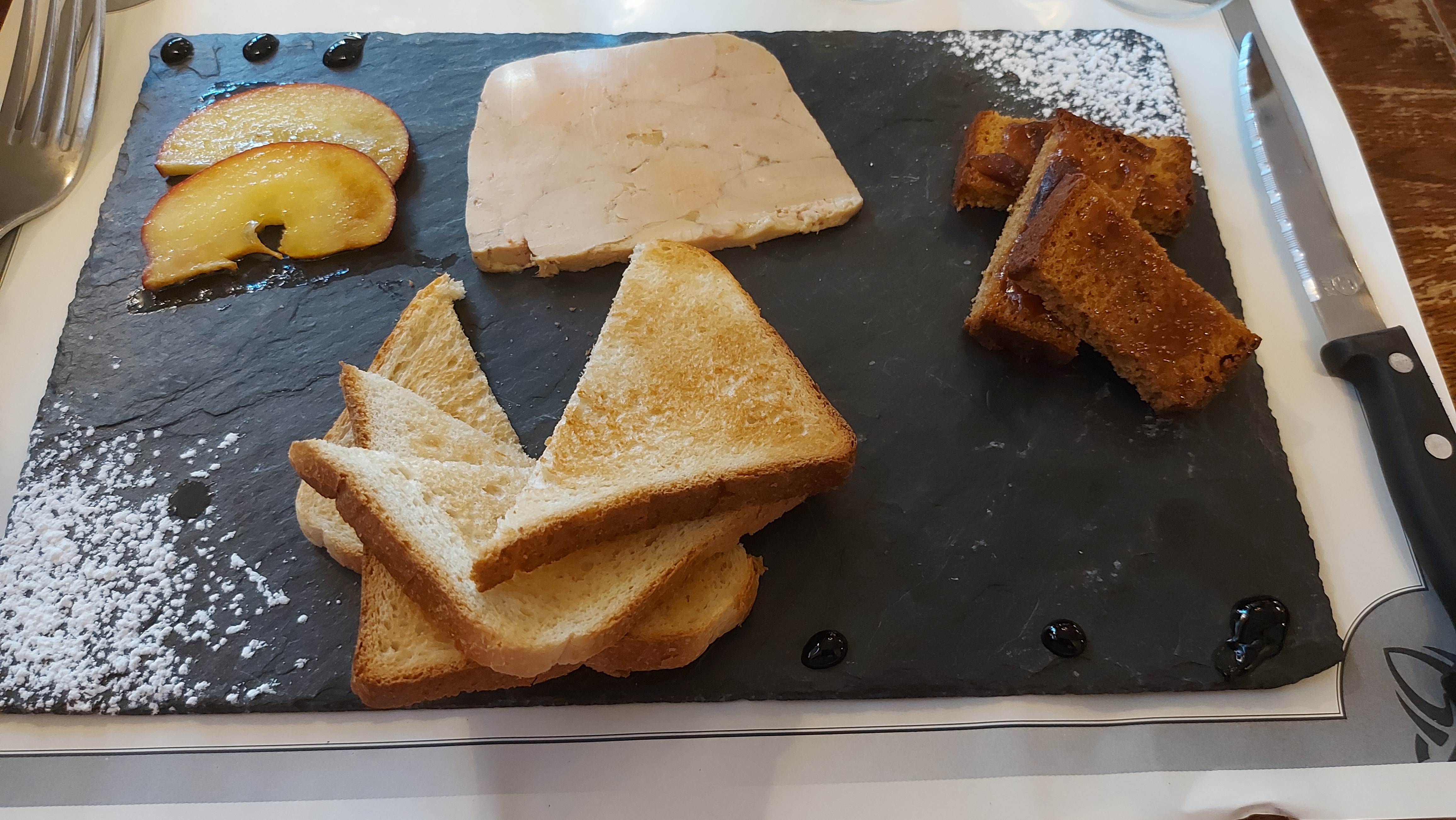 Nous avons pris le foie gras maison, pour 2 c était délicieux, pommes tiedies dans du beurre, pain épicé maison.. Puis des planches de viandes qui sont gargantuesques. Et pour finir une profiteroles avec du bon chocolat chaud. Rien à dire. Serveuse souriante et aimable... Le tout dans des vieux murs joliment restaurés