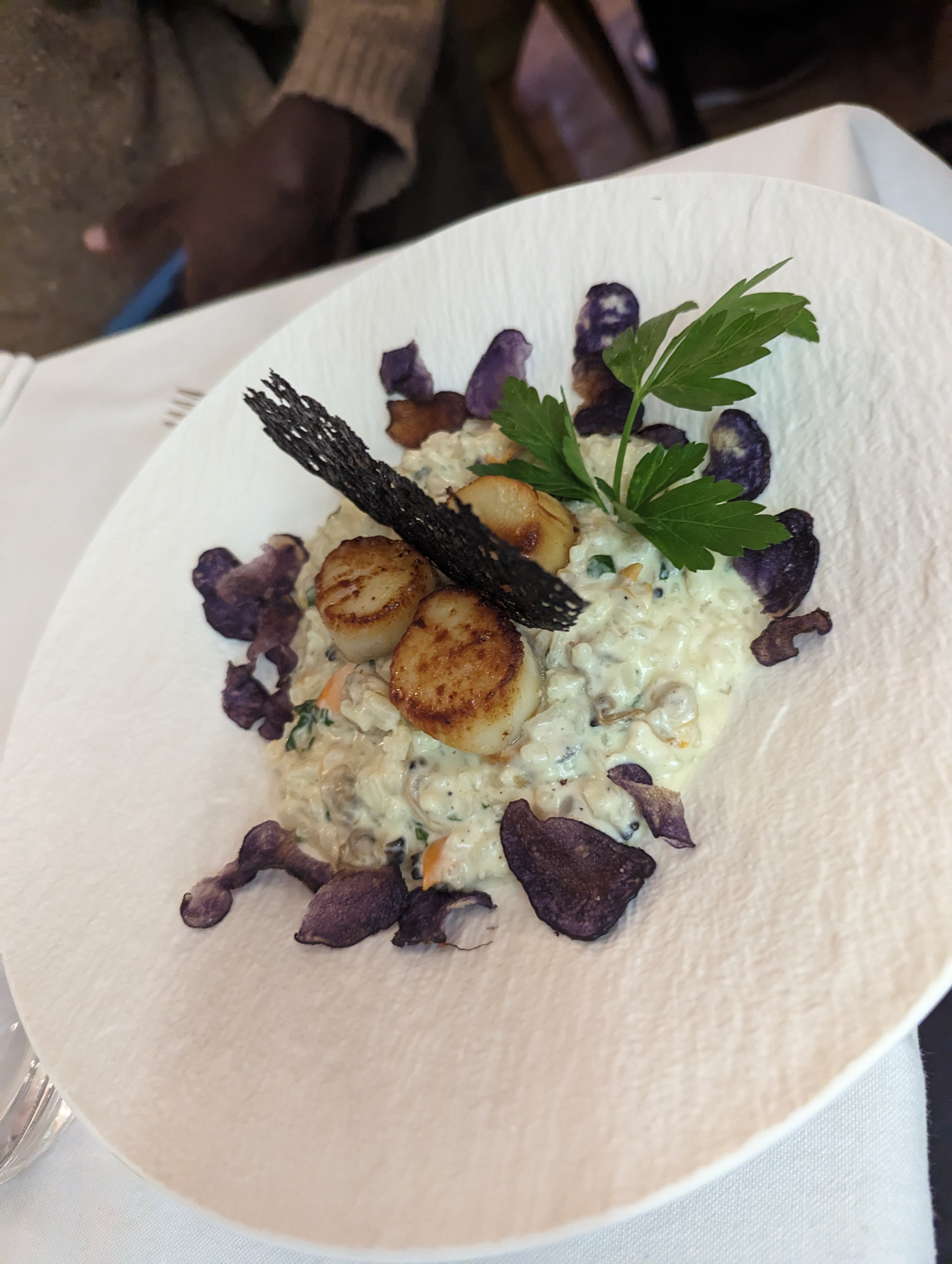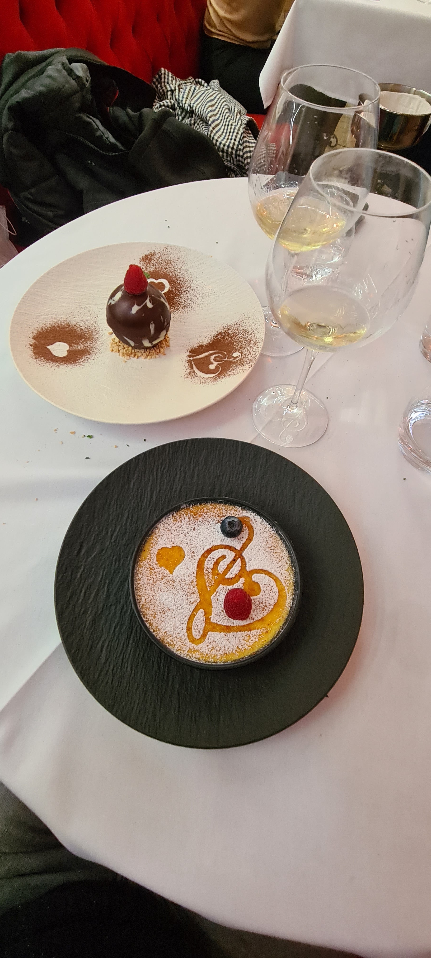 Un dîner de vendredi soir avant d'aller voir un spectacle. Tout était délicieux : les plats (risotto aux St Jacques et noix d'entrecôte), les desserts (cheesecake et fondant au chocolat) et le vin (malheureusement je n'ai pas mémorisé le nom...). C'était un moment de pur bonheur ! Je recommande sans hésitation :)