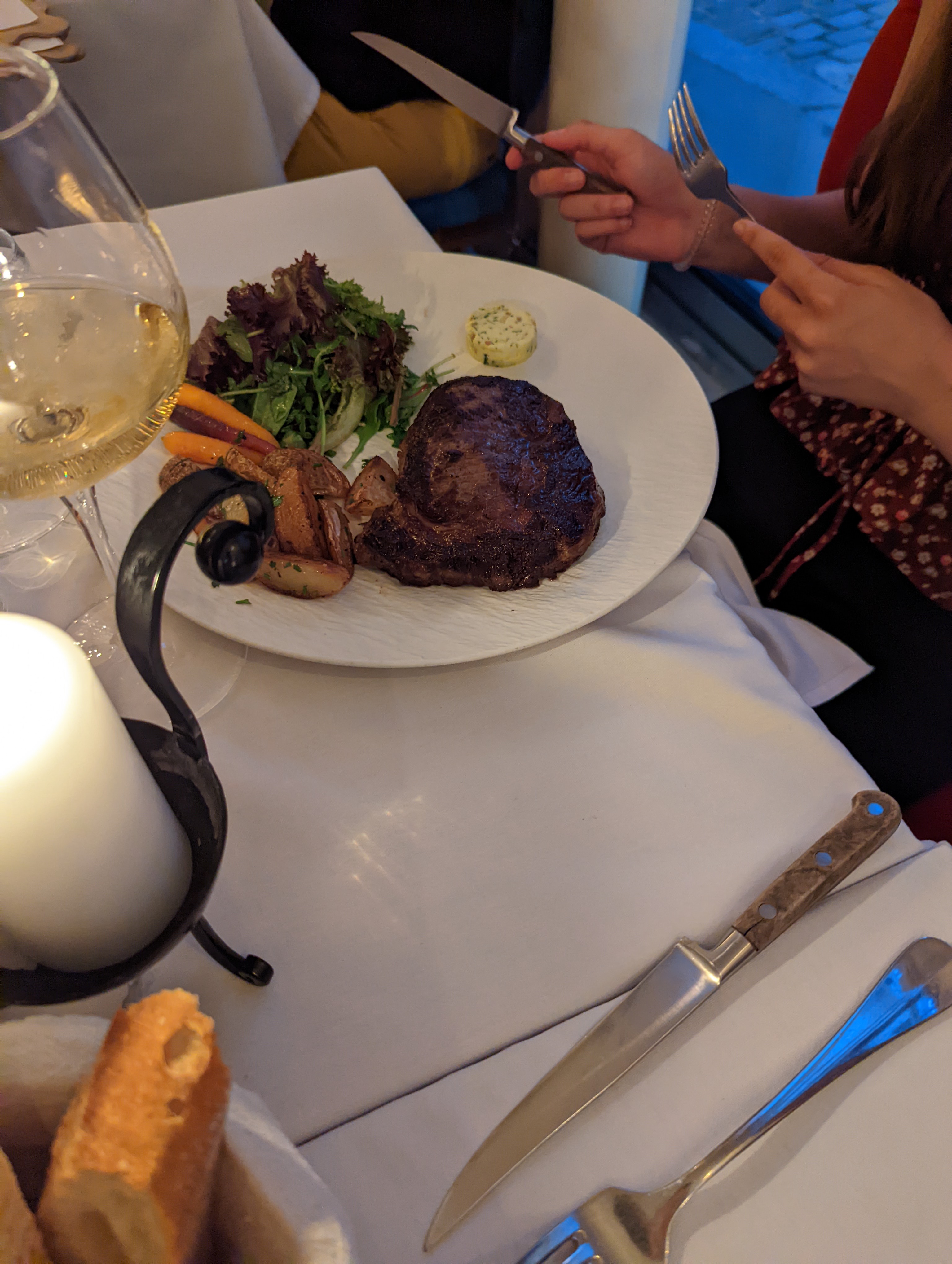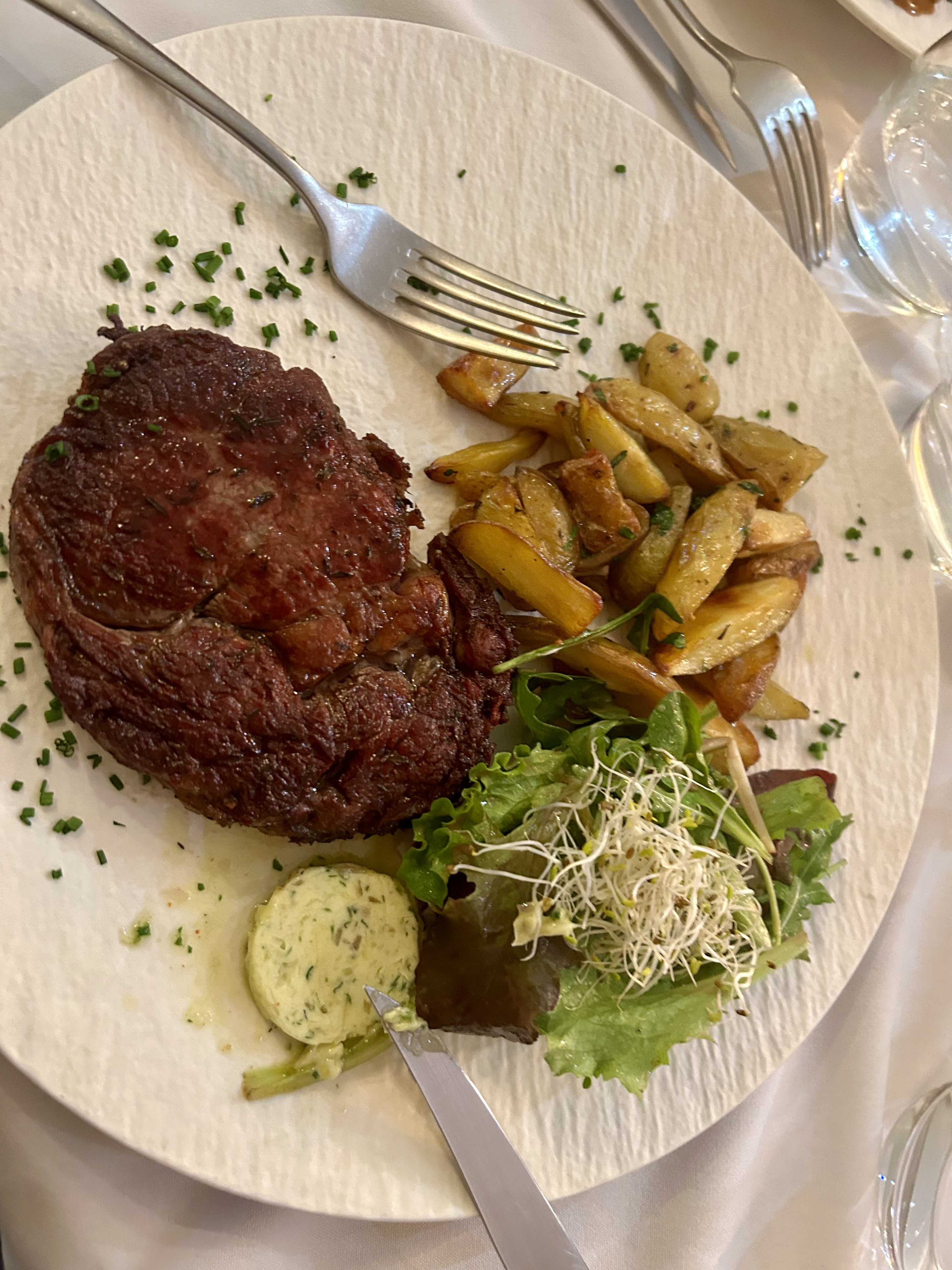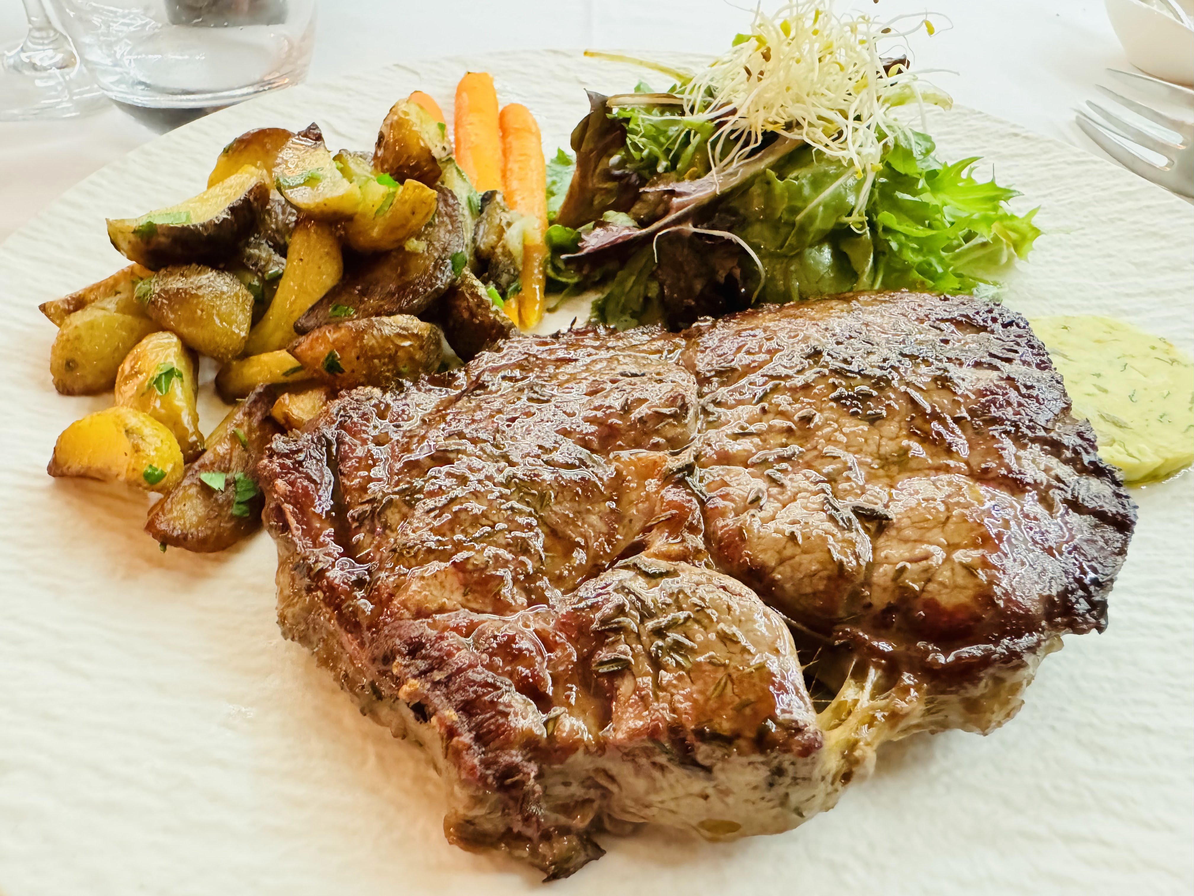 Un superbe bijou qui vaut vraiment le score. Arrivé pour un dîner, le personnel était super sympa, souriant et serviable. Il y avait le plateau de fromages en entrée - tout était super frais et la baguette était précieuse. Entrecôte pour plat, parfaitement cuite à point. Le beurre d’estragon est un ajout sucré à ce plat classique. La crème brûlée était excellente, bonne croûte et pas trop sucrée.