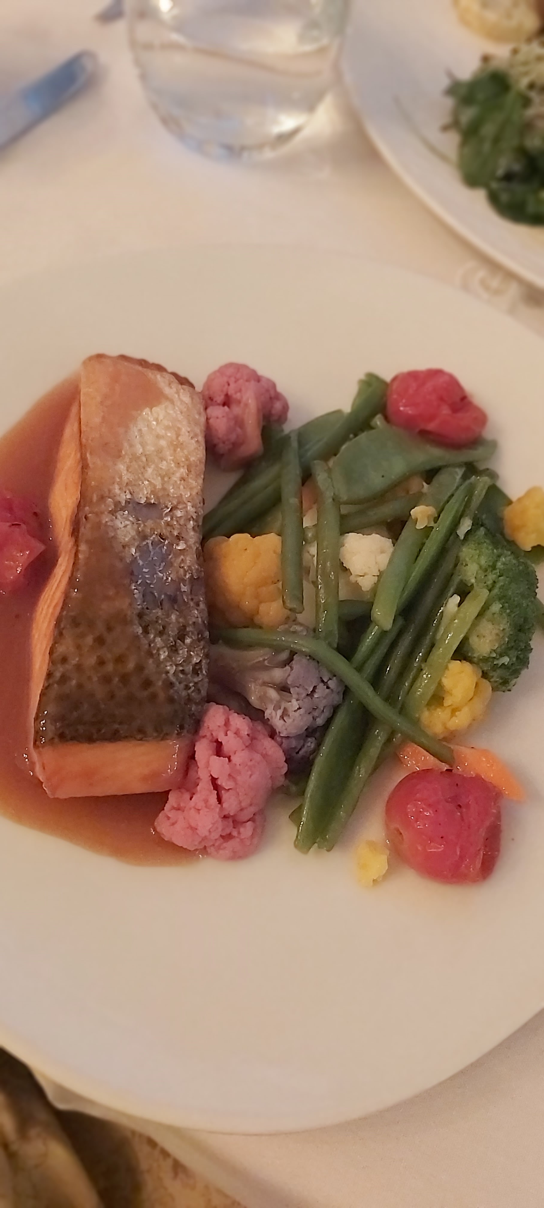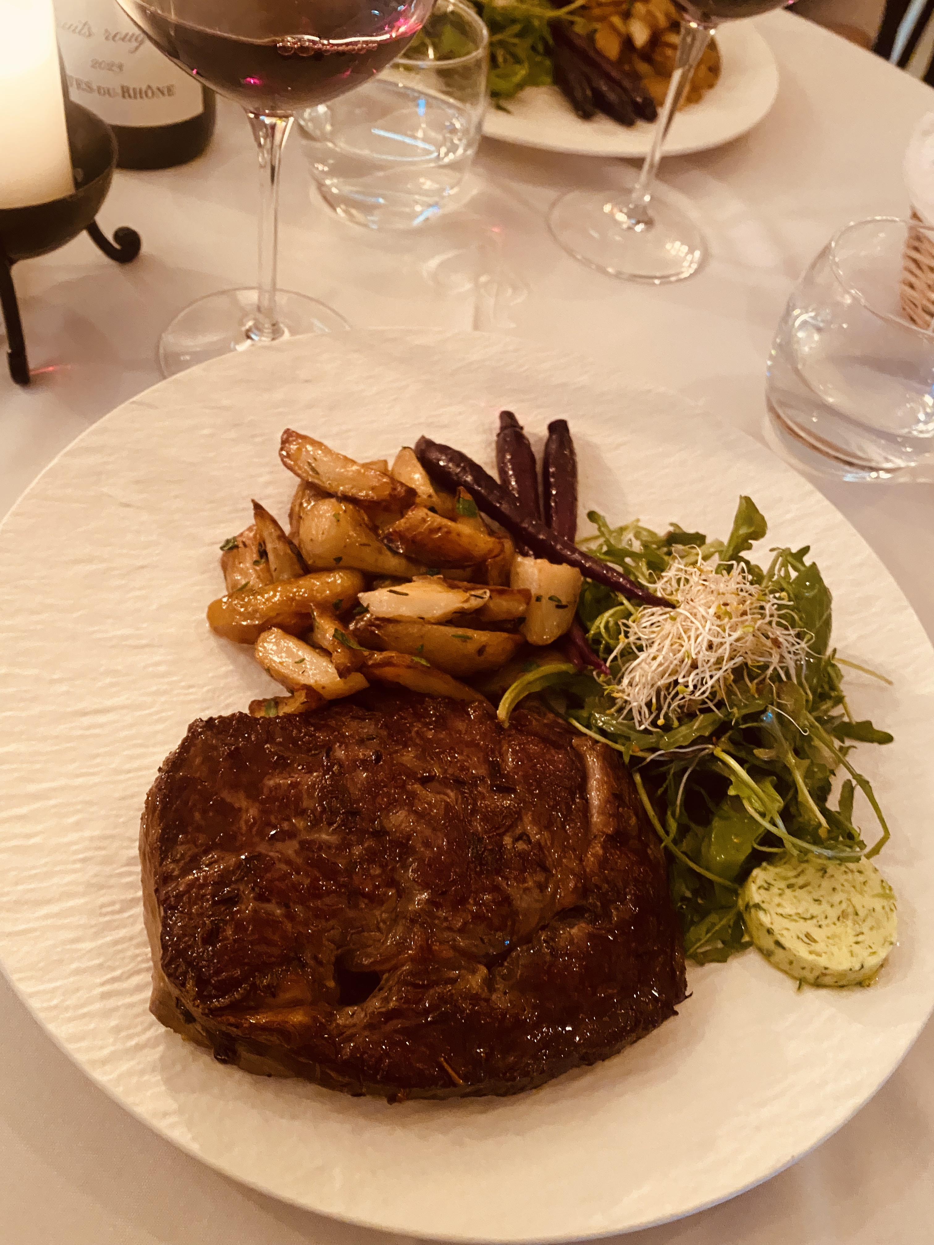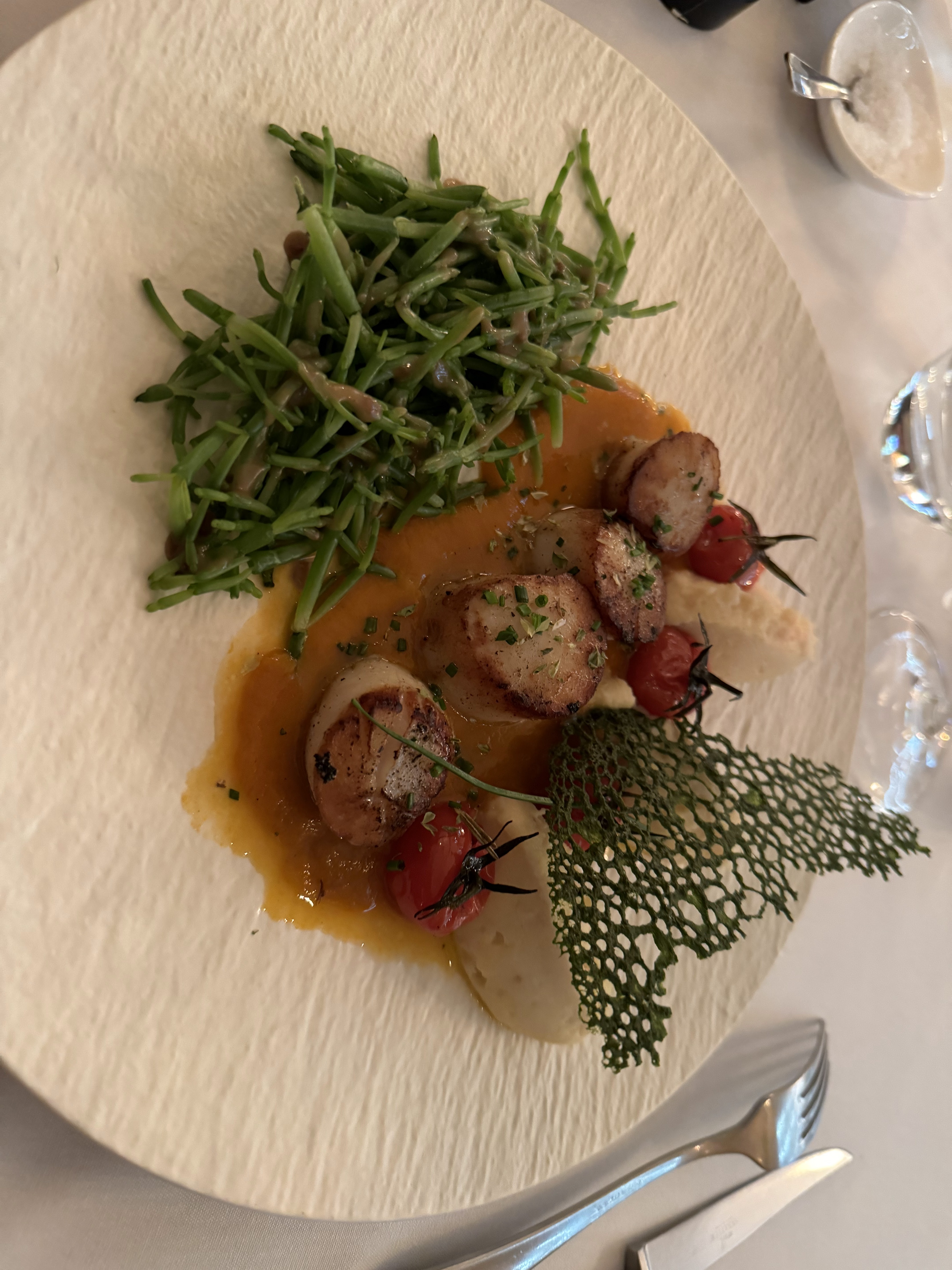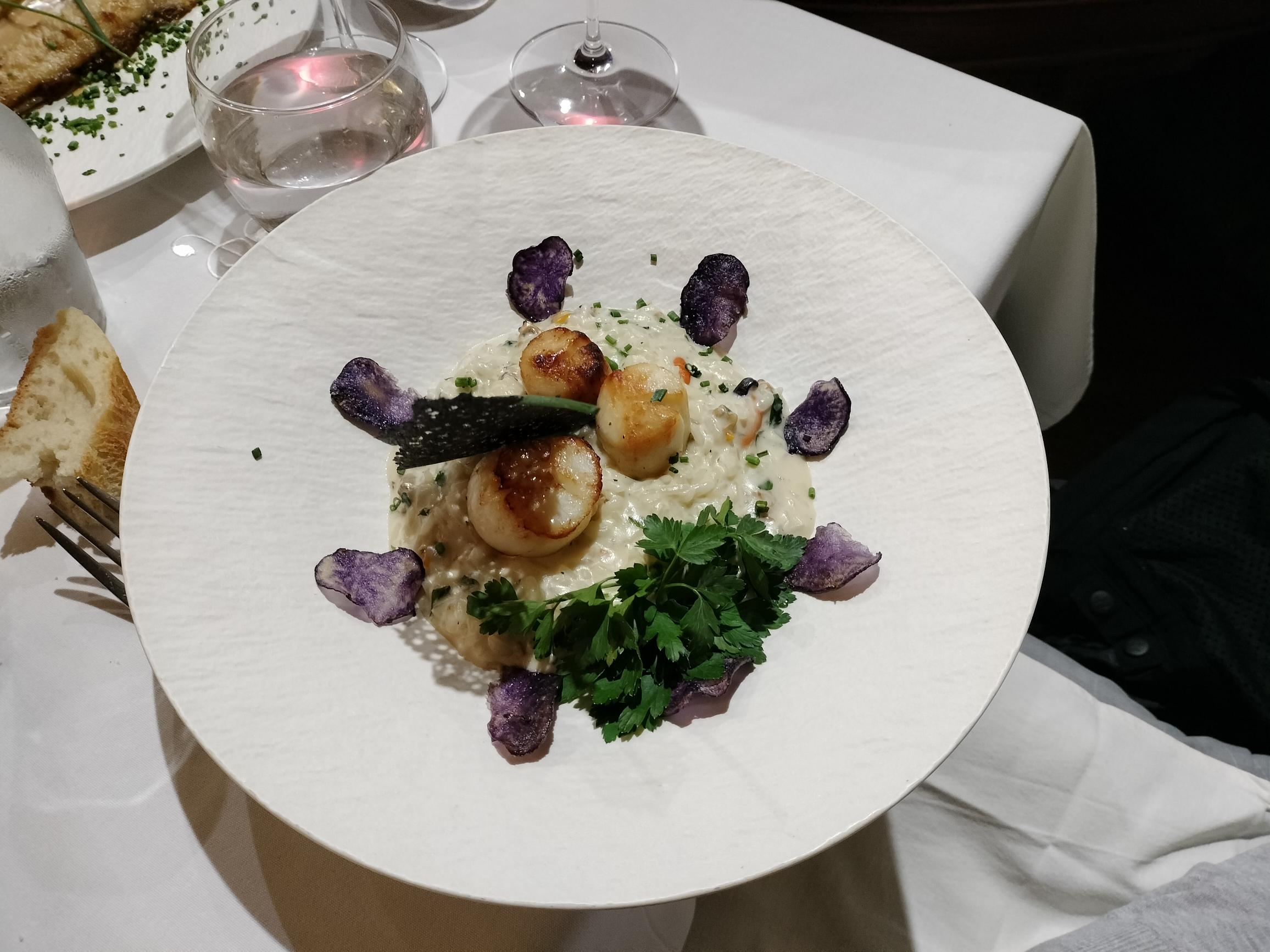 Dîner très agréable, tout est frais et soigné. Différence de portion un peu déséquilibrée entre nos deux assiettes de Saint Jacques-très juste-et pièce de bœuf-très génèreuse et un vrai régal.