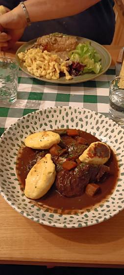 Salle de toute petite taille... Lorsque vous dinez à une table aux côtés d'un groupe de 15 ou 20 locaux qui ne tournent pas qu'au Coca Zéro, votre repas devient rapidement un enfer. Très bons Käseknepfle, mais alors quantité adaptée à un moineau (à un bébé moineau ?) À 16 € l'assiette : on ne se mouche clairement pas du coude...