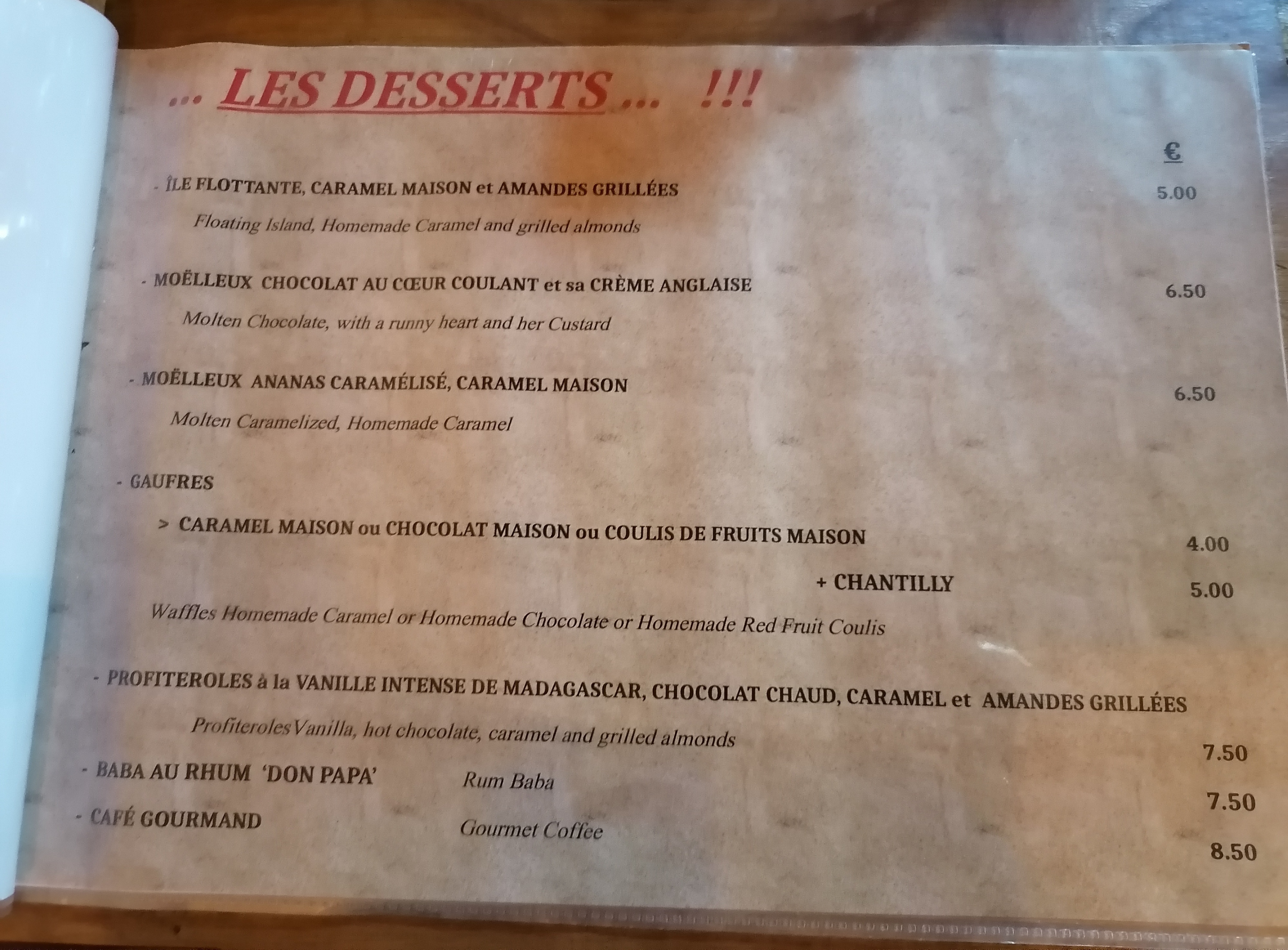 Une bavette décevante, manque de tendresse. Les frites sont bonnes. Le vin est bon. Les desserts, il y a un problème avec le coulis de chocolat, nous en avions chacun sur notre dessert, il était très mauvais!!