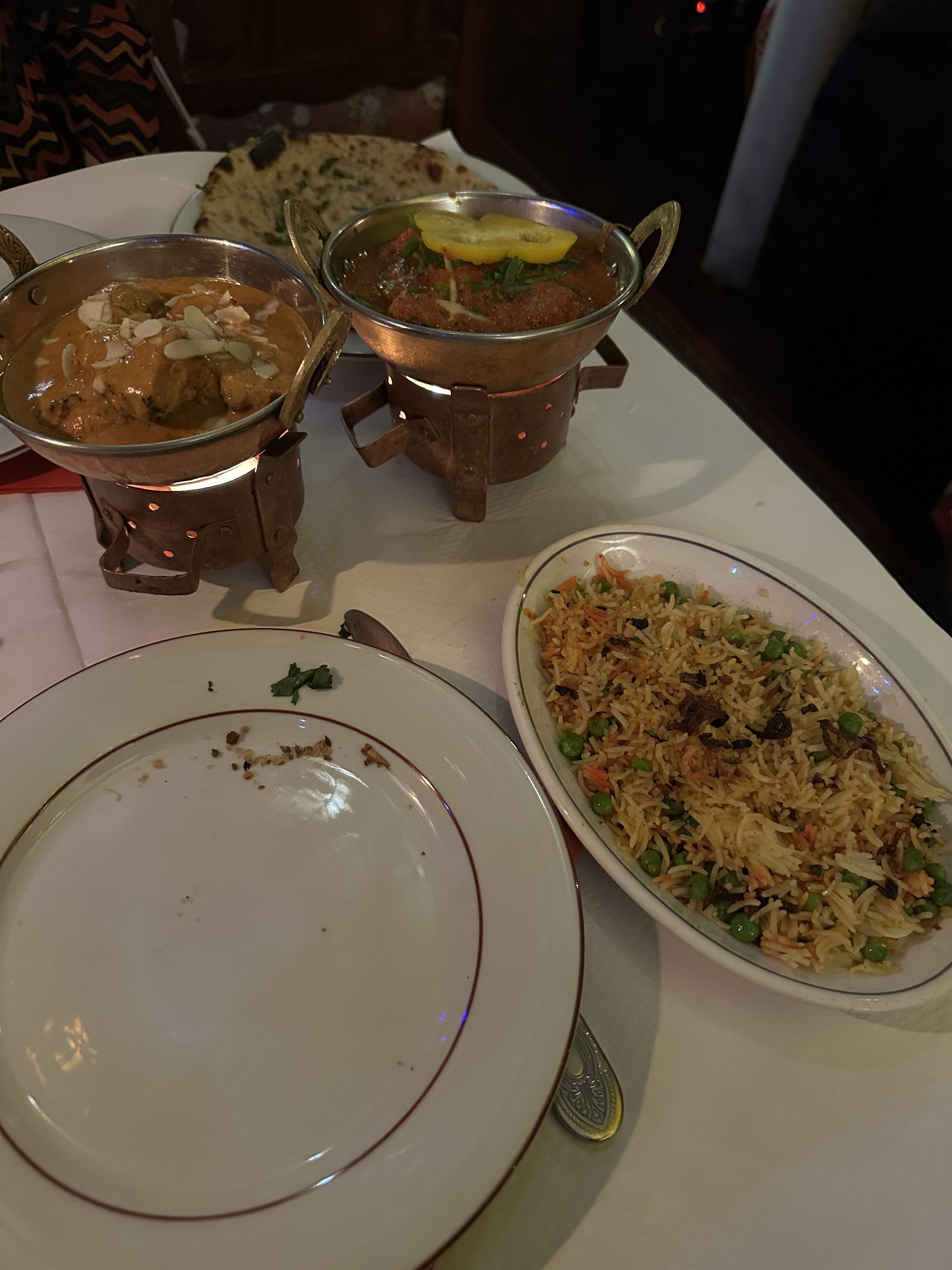 J'attribue à ce restaurant quatre étoiles pour son authenticité, sa décoration et son environnement. Le service était bon. Je ne sais pas ce qu'ils ont mis dans notre martini mais ce n'était pas un martini. Les portions étaient très petites. Nos entrées étaient servies avec notre entrée. J'adore le quartier. C’est magnifique d’avoir un si vieux restaurant indien authentique où aller.